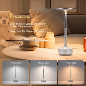 Lámpara de mesa recargable con batería: Batería recargable integrada de 6000 mAh, puede ser utilizada durante 20~42 horas, lámpara de mesa recargable completamente cargada por cable USB C en 6 horas (también se puede usar mientras se carga), esta característica la convierte en una lámpara de escritorio LED portátil perfecta que ahorra en facturas de baterías y electricidad. Regulable continuo de 3 colores: esta lámpara de mesa inalámbrica proporciona 3 temperaturas de color: blanco cálido, blanco neutro, blanco frío (3000K-5000K). Toque ligero para cambiar la temperatura de color. Pulsa durante mucho tiempo para ajustar el brillo, atenuación continua (10%-100%). Nuestra lámpara de mesa LED permite a los usuarios ajustar libremente el brillo y el color de acuerdo con diferentes escenarios de uso. Lámpara inalámbrica versátil: ¡Di adiós a los cables! Esta lámpara está diseñada para ser inalámbrica y puede ser alimentada por USB, lo que te da la libertad de usarla en cualquier lugar. Ya sea que estés acampando, haciendo un picnic o disfrutando de una comida en un restaurante, esta lámpara portátil sirve como el compañero perfecto de mesa al aire libre. Resistente al agua IP65, para uso en exteriores: La lámpara de mesa exterior inalámbrica FenFud cuenta con un diseño resistente al agua IP65, asegurando una excelente resistencia al agua. Ligera y portátil, una lámpara ideal para interiores y exteriores como camping, patio, jardín, cocina, restaurante, etc. Servicio postventa confiable y garantía: FenFud proporciona servicio de devolución/intercambio con 1 año de garantía. Si tienes algún problema o tienes alguna pregunta sobre esta lámpara de mesa inalámbrica LED recargable, no dudes en ponerte en contacto con nosotros. ¡Tu satisfacción es nuestra prioridad! Consejos útiles: Si el paquete recibido estaba roto o falta algún accesorio, solicita un cambio o ponte en contacto con nosotros para resolver el problema.