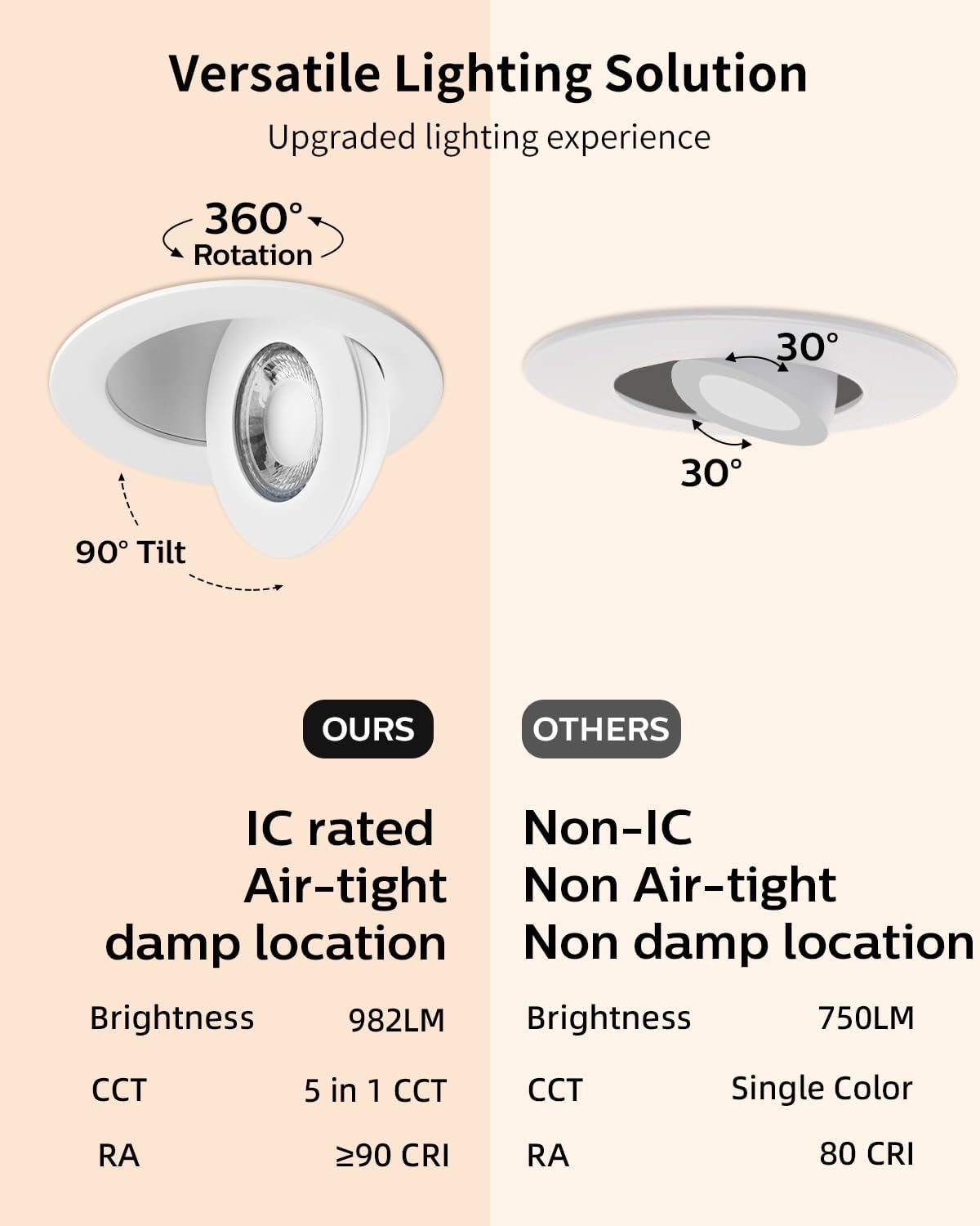360° + 90° Ajustable: Las luces LED empotradas con cardán Adetu de 10,2 cm pueden ajustarse 360° y arriba y abajo 90° Reinicio de 5 temperaturas de color: La luz LED empotrada sin caja de cardán delgada de 10,2 cm 5 en 1 te ayudará a deshacerte del problema de la temperatura del color y la combinación de habitaciones. Hay 5 temperaturas: 2700 K (blanco suave), 3000 K (blanco cálido), 3500 K (blanco neutro), 4000 K (blanco frío) y 5000 K (luz diurna). Simplemente pruebe las diferentes temperaturas de color con el interruptor deslizante de la caja de conexiones para seleccionar la más adecuada para sus ubicaciones. Atenuación suave: Lámparas LED reset para luminarias empotradas de 10,2 cm, montaje en techo, diseñadas para una atenuación suave del 5% al 100%. Y las luces de oblea tienen un controlador de alta calidad sin ningún parpadeo o ruido de zumbido no deseado. La iluminación empotrada de 10,2 cm compatible con la mayoría de los reguladores y aplicable a varios escenarios como cocina, sala de estar, lugar de trabajo, áreas comunes y plafones. Alto brillo: la iluminación LED empotrada de 10,2 cm de luces descendentes delgadas utilizan la nueva generación de chips LED con lúmenes más altos y menor potencia, 982LM consume 10 vatios, ahorrándote hasta un 88% en costos de energía. Clasificación IC: La iluminación empotrada tiene clasificación IC, certificación ETL y Energy Star y el terminal de cable está certificado por UL, lo que significa que la caja de conexiones está protegida térmicamente. Nuestras luces empotrables LED sin lata de 10,2 cm están garantizadas. Si tiene algún problema de calidad o sugerencias, por favor contáctenos y resolveremos todos los problemas a tiempo! Fácil de instalar: Luz empotrada de perfil bajo adecuada para modernizaciones y nuevas renovaciones: Haz un agujero en el techo con un rango de apertura de aproximadamente 4.02 a 11,5 cm (ya que 102 milímetros es aproximadamente 10,2 cm y 115 milímetros es aproximadamente 11,5 cm); conecta la caja J al cable; usa clips de resorte para asegurarla al techo. Instalación sin complicaciones en minutos. Se adapta a una variedad de techos y vigas. Las latas empotradas ya no son una limitación para su elección.