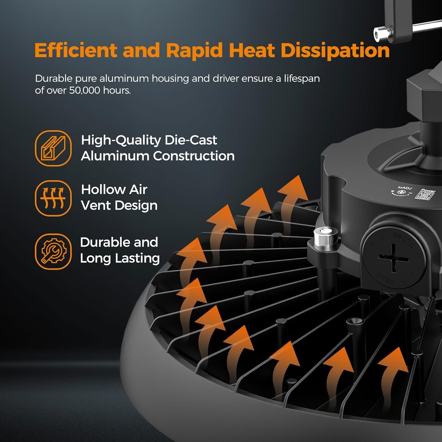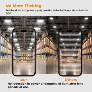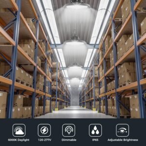 Luz de techo LED de 180W ultrabrillante y ajustable – Ilumina grandes espacios comerciales con 32,400 lúmenes de luz diurna nítida de 6000K. Esta luz LED de bahía alta de alto rendimiento cuenta con tres configuraciones de potencia ajustables (180W/140W/100W) para adaptarse a almacenes, fábricas, gimnasios y entornos industriales. Con compatibilidad de atenuación de 0 a 10 V (atenuador no incluido), puedes ajustar el brillo para mayor comodidad visual y eficiencia energética. Diseñada para mayor longevidad: vida útil de 60.000 horas. Construida con una robusta carcasa de aluminio fundido a presión y controlador aislado, esta luz utiliza tecnología de disipación de calor de flujo de aire hueco para mantenerse fresca y consistente. Con una duración de más de 12 años a 12 horas al día, reemplaza las luces halógenas tradicionales de 700 W o HPS mientras reduce el consumo de energía hasta en un 90%, una solución de iluminación a largo plazo con un mantenimiento mínimo. Clasificación IP65 para todo tipo de clima y lista para temperaturas extremas: diseñada para entornos difíciles, esta luz LED es impermeable IP65 y funciona de manera confiable en temperaturas de -22 °F a 113 °F. Ideal para áreas de almacenamiento al aire libre, talleres húmedos o almacenes en frío, soporta el polvo, la lluvia, la humedad y el calor con facilidad. Ángulo de haz amplio de 120° Iluminación uniforme y sin sombras Equipada con un ángulo de haz de 120°, esta luz UFO de bahía alta asegura una cobertura amplia y uniforme para techos de 12 16 pies de altura, iluminando áreas de hasta 38 pies de ancho. Dile adiós a los puntos oscuros perfecto para espacios comerciales, industriales o minoristas que requieren una iluminación constante. Instalación Plug-and-Play en 3 minutos – ¿Sin cableado? No hay problema. Viene con un enchufe estándar de 3 clavijas de EE. UU., cable de alimentación de 5 pies, gancho para colgar y cable de seguridad para una instalación rápida y segura. Conéctalo e ilumina tu espacio en minutos. Para instalaciones con cableado fijo, se recomienda la instalación profesional. Calidad certificada y garantía de 6 años: certificación ETL para seguridad y rendimiento, cada unidad se somete a rigurosas pruebas para garantizar el 100% de funcionalidad. Disfruta de la tranquilidad con una garantía de reemplazo de 30 días y una garantía de producto de 6 años: iluminación confiable que funciona tan duro como tú.