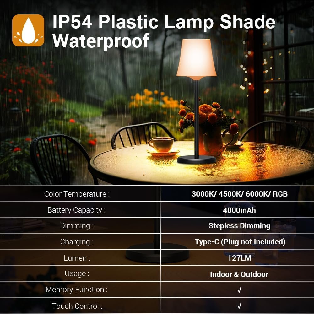 Temperatura de 3 colores + diseño RGB y atenuación continua: satisface tus diferentes necesidades: para diferentes necesidades de uso, estas lámparas inalámbricas recargables tienen iluminación completa y descendente, cada una tiene una temperatura de 3 colores blanco cálido, blanco neutro y blanco frío. 9 luces de modo RGB añaden la diversidad de ocasiones de uso. Función de atenuación del 0% al 100% que te permite ajustar el ambiente de iluminación ideal. Lámparas de mesa portátiles inalámbricas: se iluminan en cualquier lugar: el diseño alimentado por batería permite que esta lámpara inalámbrica se adapte a cualquier lugar y ocasión, especialmente en lugares, no tiene tomas de corriente o apagón y también te permite deshacerte de problemas de cables. Puedes llevar esta lámpara portátil a cualquier lugar. Control táctil e iluminación de 10 a 25 horas: el control táctil fácil de usar agrega comodidad. La respuesta sensible suaviza la operación. 4 horas de carga para 10-25 horas de brillo. Haz que esta lámpara táctil inalámbrica sea adecuada para muchas ocasiones: cena romántica/noche relajada en la terraza/cena al aire libre/picnic. Con función de memoria, esta lámpara funciona con pilas recordará el último modo y brillo. Pantalla impermeable IP54 blanca: Pantalla de plástico ABS con estructura cerrada de sello de silicona, asegúrese de que sea funcionalidad impermeable. La luz cálida dispersa uniformemente en la pantalla de plástico ABS blanco nieve, hace que esta luz portátil sea un gran creador de ambiente. Regalo perfecto: elegante, inalámbrico, portátil, brillo hacen de estas lámparas de mesa un regalo versátil para tus amantes/amigos. También es un regalo ideal para cumpleaños, día de San Valentín, Navidad, oficina en casa, decoración de fiesta, inauguración de la casa, enviar compañero de habitación. Nota 1: La pantalla está hecha de plástico ABS. Tamaño: 4.25 × 4.25 × 33,1 cm. Peso neto: 0.99lb. Nota 2: Sugerimos utilizar cargador 5V/2A.