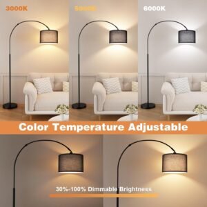Smart Remote Control Arched Floor Lamp: Enjoy easy lighting control from anywhere in the room with our remote-controlled curved floor lamp. You can conveniently adjust the brightness and color temperature to suit your needs for a customized lighting experience. (Set the foot switch to ON first.) The magnetic remote sticks to the lamp stand, ensuring it’s always within reach 3 Color Temperatures and Stepless Dimming: Experience the perfect lighting with our arch floor lamp, featuring seamless brightness adjustment from 0% to 100%, and three adjustable color temperatures: Warm White (3000K), Natural White (4500K), and Cool White (6000K). Whether you re setting the mood for a cozy evening or need bright, energizing light for your daily activities, this hanging floor lamp is designed to meet all your lighting needs Flexible Lampshade with Rotation: Boasting an ingeniously designed rotating head, this 70-cm overhanging floor lamp caters to your every lighting whim with a 350° horizontal and 180° vertical rotation range. Brighten those dark corners or create the perfect ambiance by adjusting the lamp to your desired angle 70 cm Classic and Modern Arc Floor Lamp: This arched floor lamp combines smooth curves with mid-century modern style, fitting seamlessly into any decor. Versatile and functional, it can be used as a reading lamp, office lamp, or living room lamp. Equipped with preset modes including Nightlight, Baby Feeding, Work, and Immersive Reading, the remote control allows you to easily switch settings to match your needs. The 1-hour timer function ensures a peaceful sleep without the need to wake up and turn off the light Easy to Assemble: Assembly of this arc floor lamp is very easy, just twist the poles together and srew them into the base. Only takes 5 to 10 minutes from start to finish, and no need any tools to complete. To ensure stability, the lamp base is made of heavy metal, preventing accidental tipping or falling, even with kids and pets around