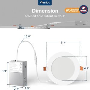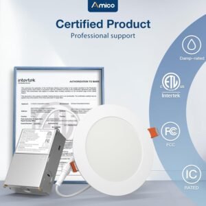 5 CCT-in-1: 5 color temperature(2700K, 3000K, 3500K, 4000K, 5000K) is selectable to you, which successfully eliminates the hassle of returning or exchange products due to inappropriate color temperature. Just slide the switch on the side of the J-box and you will get the most-desired color that best fit in your room type. IC Rated: Amico’s canless LED recessed light is IC rated, which is permitted to be in contact with insulations in ceilings, meaning the junction box is thermally protected. It only requires as small as 2 cm ceiling space. It won’t have a fire hazard when light was installed in various ceilings and overhead joists. Easy Install: The low profile recessed lighting is suitable for retrofit and new decoration: Cut a hole in ceiling with 1:1 hole template; Connect the Jbox to the cable; Use spring clip to fix it on the ceiling. Hassle-free, the installation can be completed in minutes. High Brightness: The 5 cm slim pot lights use the world’s leading LED chips with higher lumens and lower power. 900LM consumes 11 Watts, which equals to 75W halogen lamp, saving you up to 90% in energy costs a year. Amico Benefits: Its long lifespan also reduces maintenance costs. All Amico’s recessed lighting are certified by ETL of a high standard. Our customer support team will also address your concerns within 12 hours.
