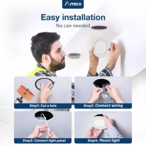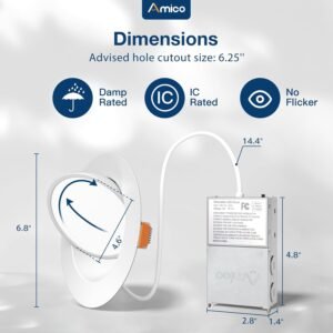 Dirección ajustable de 360° y 90°: la luz del cardán admite rotación horizontal de 360° y rotación vertical de hasta 90°, que puede satisfacer cualquier ángulo de iluminación que necesite. Emite una luz brillante y uniforme y es el reemplazo perfecto para focos, ideal para iluminación direccional y resaltar obras de arte/murales. 5 CCT: 2700K, 3000K, 3500K, 4000K, 5000K, 5 temperaturas de color seleccionables, no hay necesidad de preocuparse por qué temperatura de color comprar, eliminando con éxito la molestia de devolver o cambiar productos debido a la temperatura de color inapropiada, y también haciendo que sea fácil crear un ambiente cómodo para cualquier ocasión. Clasificación IC: la luz empotrada LED sin lata de Amico tiene clasificación IC, lo que permite estar en contacto con aislamientos en techos, lo que significa que la caja de conexiones está térmicamente protegida. Solo requiere espacios de techo tan pequeños como de 5,1 cm, se adapta a varios techos y vigas. No causará un incendio en el techo ni en el espacio de la vigueta superior. Alto brillo: las luces empotradas de 15,2 cm Amico utilizan los chips LED líderes del mundo con más lúmenes y menor potencia. 1200LM consume 12 vatios, lo que equivale a una lámpara halógena de 70 W, ahorrándote hasta un 90% en costos de energía. El CRI>90 puede restaurar mejor el verdadero color del objeto y aportar la experiencia de iluminación visual más realista. Ventajas de Amico: Su larga vida útil también reduce los costes de mantenimiento. La iluminación empotrada de Amico está certificada por ETL de un alto estándar. Nuestro equipo de atención al cliente también abordará sus inquietudes dentro de las 12 horas.