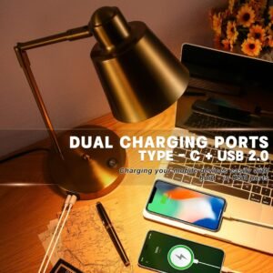 Características especiales: Interruptor basculante, brazo ajustable y cabezal giratorio, lámpara 100% metálica, puertos de carga USB duales – Tipo-C y USB 2.0