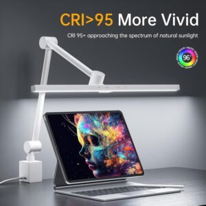 Características especiales: Interruptor basculante, brazo ajustable y cabezal giratorio, lámpara 100% metálica, puertos de carga USB duales – Tipo-C y USB 2.0