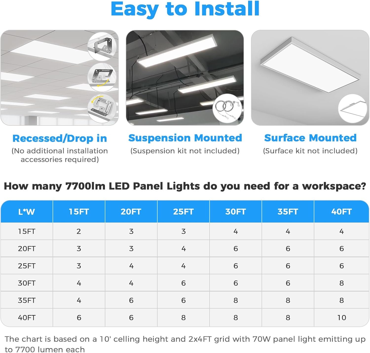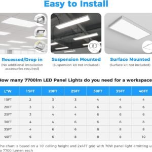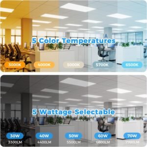 Opciones seleccionables de 5 vatios: Elija entre 30W, 40W, 50W, 60W o 70W con una lámpara de techo LED de 2×4, perfecta para ahorrar energía y requisitos de iluminación flexibles en diferentes entornos comerciales. 5 CCT ajustables (3000K a 6500K): cambia fácilmente entre 5 temperaturas de color: blanco cálido (3000 K), blanco neutro (4000 K), blanco frío (5000 K), luz diurna (5700 K) y luz diurna brillante (6500 K) para adaptarse a cualquier atmósfera. Regulable de 0-10 V: las luces de techo LED 2×4 son compatibles con sistemas de atenuación estándar de 0-10 V. Logra un control de brillo suave y sin parpadeo para crear un ambiente de trabajo cómodo. Alta salida de lúmenes y eficiencia: la luz LED de 2 x 4 proporciona hasta 7700 lúmenes con un rendimiento ultra eficiente de 110 lm/W, lo suficientemente brillante para oficinas, escuelas, hospitales y otras instalaciones comerciales. Fácil instalación y amplio voltaje: lámpara de techo de caída 2×4 admite entrada de 120-277V para compatibilidad universal. Diseñado para techos caídos y techos de rejilla, instalación rápida y sin complicaciones con los accesorios de montaje incluidos.