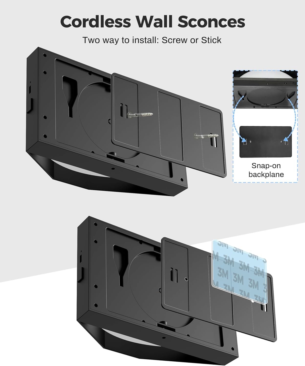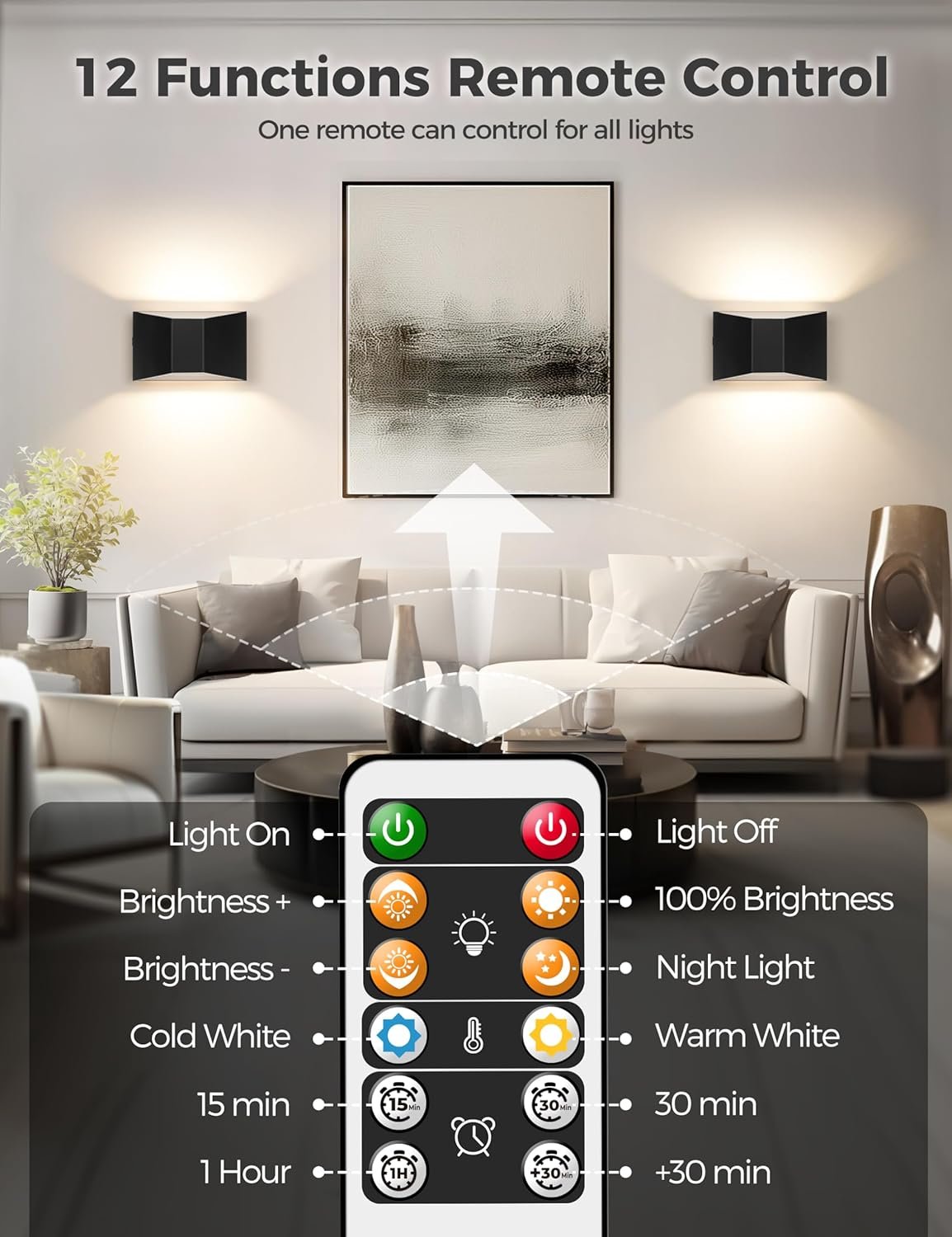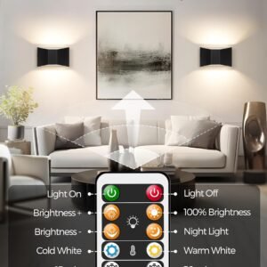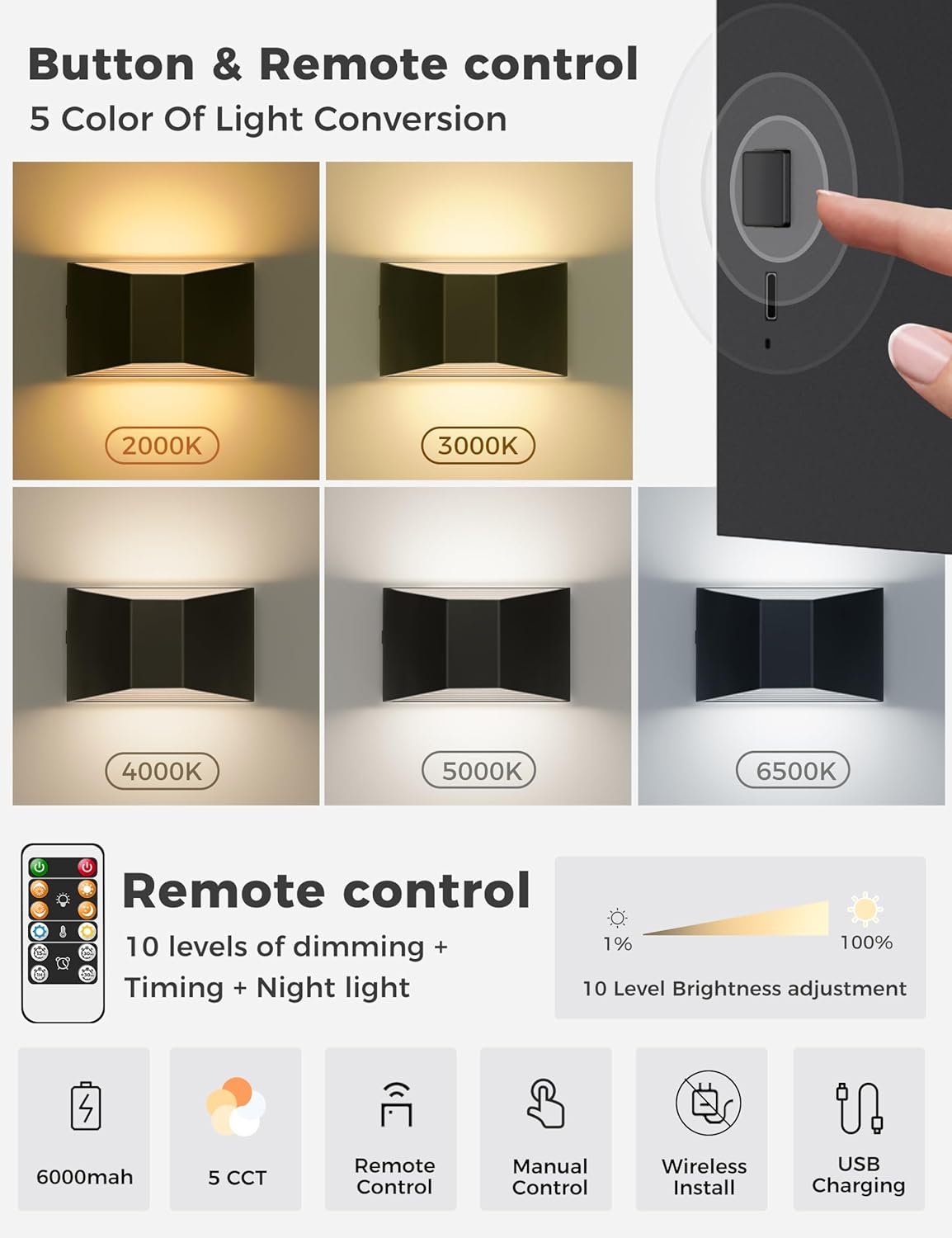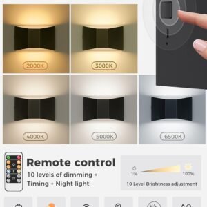 Luces montadas en la pared a pilas: las lámparas LED de pared incorporan una batería recargable de 6000 mAh. El tiempo de trabajo después de la carga completa determinado en función del brillo. Completamente cargado menos de 4 horas puede funcionar hasta 60 horas en brillo mínimo, el brillo máximo es de hasta 12 horas. Apliques de pared inalámbricos portátiles con puerto de carga USB-C. Luces LED de pared con botón y control remoto: dos métodos de control para estas luces de pared recargables que son control de botón y control remoto. Puede completar todos los ajustes a través del control remoto: ON/OFF; 5 cambios de temperatura de color; ajuste de brillo y temporización. 5 colores de temperatura y apliques de pared regulables El control de botón y el control remoto pueden cambiar la temperatura de color (2000K-3000K-4000K-5000K-6000K). Control remoto para atenuar esta lámpara de pared de 10 niveles. Puedes elegir la temperatura de color y el brillo según diferentes escenarios de uso. Función de temporizador y luz nocturna: 15 minutos/30 minutos, e incrementos de cada 30 minutos, hasta un máximo de 8 horas de ajuste del temporizador. Fácil de instalar Estas luces LED de lectura de pared vienen con montaje a presión y fuerte adhesivo 3M. Es fácil quitar la luz del soporte para cargar. (Pero también viene con tornillo, si desea fijar permanentemente la lámpara en una posición determinada, puede utilizar el montaje de tornillo)