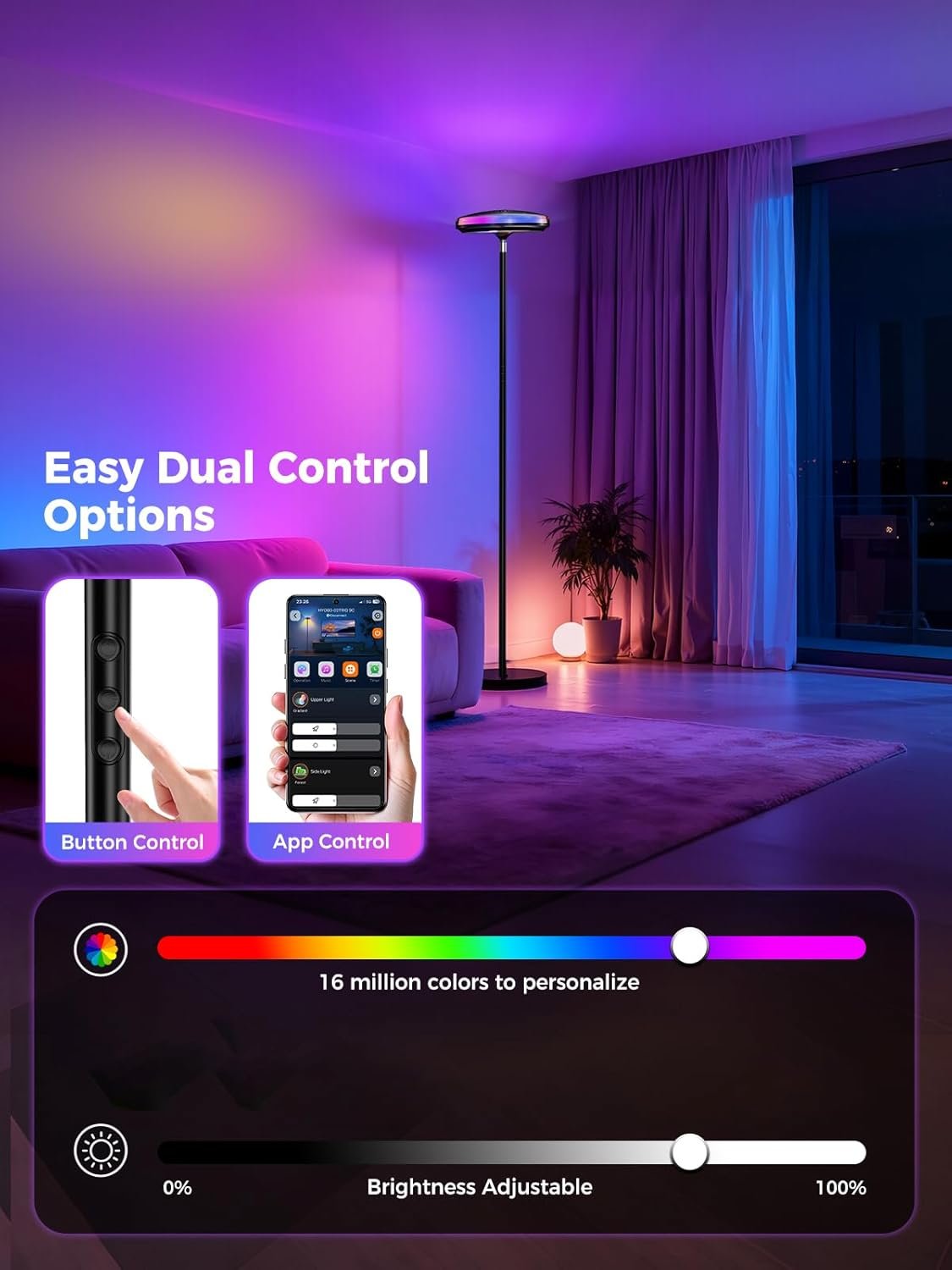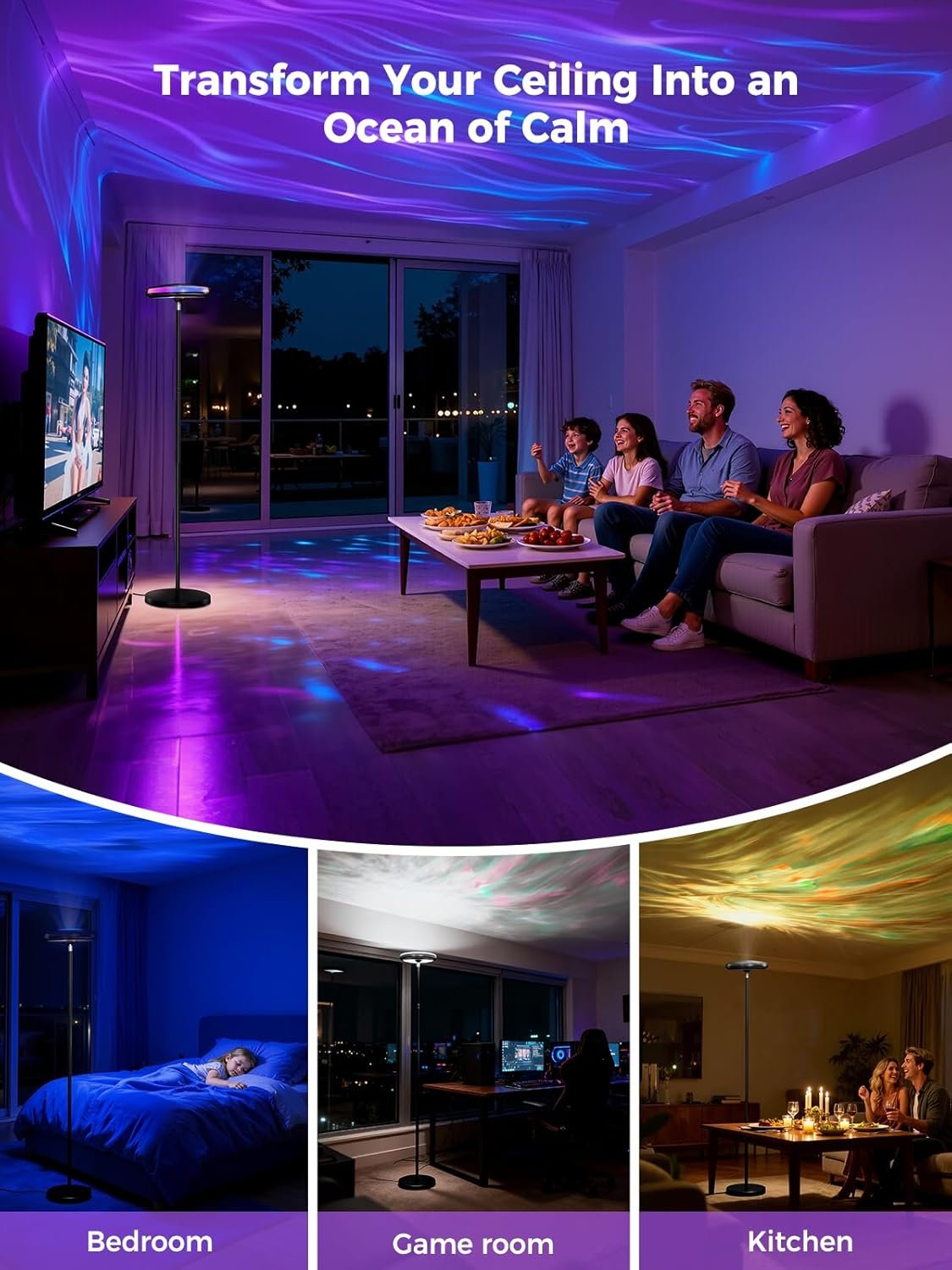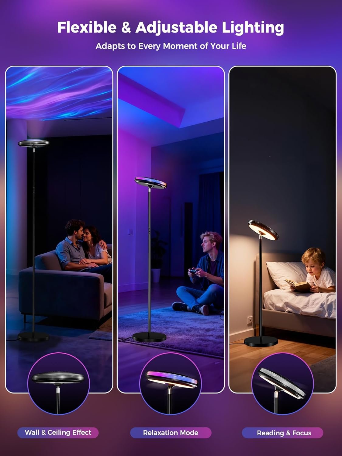 Diseño de iluminación inteligente 3 en 1: disfrute de tres modos de iluminación en una lámpara: proyección de ondulación de agua para un ambiente relajante, LED RA90 para el cuidado de los ojos para una lectura cómoda y luz lateral dinámica RGB+IC para una iluminación ambiental colorida. Perfecto para meditación, entretenimiento, trabajo o relajación Opciones fáciles de control dual: ajusta fácilmente el brillo, los colores y las escenas con la aplicación Giant Home a través de Bluetooth, o utiliza los botones físicos integrados para un acceso rápido. Disfruta de un control de iluminación perfecto al alcance de tu mano Iluminación flexible y ajustable: el cabezal de la lámpara gira 330° horizontalmente y se inclina 60° verticalmente, lo que le permite dirigir la luz a paredes o techos. Altura ajustable con postes desmontables (hasta 162,1 cm) que lo hace versátil para cualquier habitación Iluminación para el cuidado de los ojos: Diseñado con tecnología LED RA90 y un difusor con patrón de diamante, la luz inferior proporciona una iluminación suave, uniforme y sin parpadeos. Reduce la fatiga ocular y mejora el enfoque para largas sesiones de lectura o trabajo Funciones inteligentes y fácil configuración: desbloquea funciones inteligentes a través de la aplicación Giant Home, incluidas escenas preestablecidas, sincronización de música y ajustes de temporizador. Fabricado con acero duradero + policarbonato, la lámpara de pie trío es fácil de montar y construida para durar