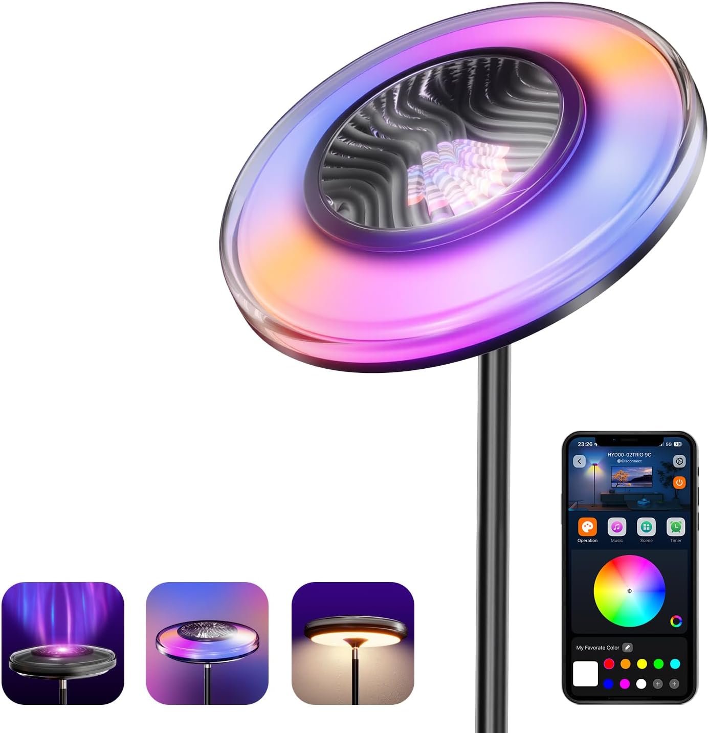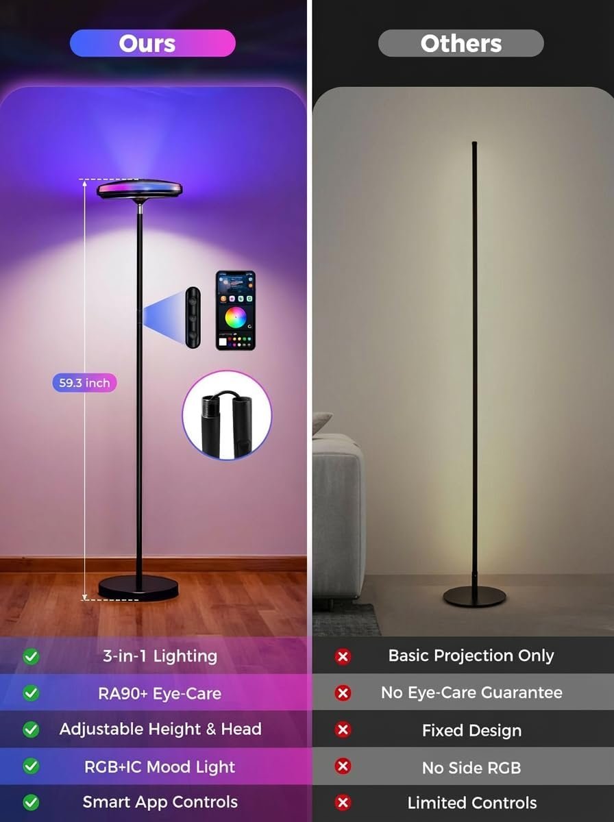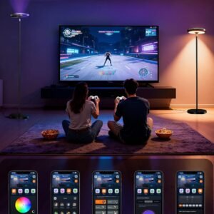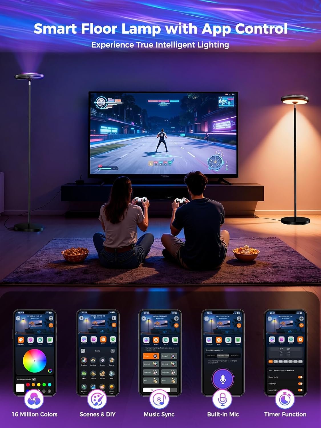 Diseño de iluminación inteligente 3 en 1: disfrute de tres modos de iluminación en una lámpara: proyección de ondulación de agua para un ambiente relajante, LED RA90 para el cuidado de los ojos para una lectura cómoda y luz lateral dinámica RGB+IC para una iluminación ambiental colorida. Perfecto para meditación, entretenimiento, trabajo o relajación Opciones fáciles de control dual: ajusta fácilmente el brillo, los colores y las escenas con la aplicación Giant Home a través de Bluetooth, o utiliza los botones físicos integrados para un acceso rápido. Disfruta de un control de iluminación perfecto al alcance de tu mano Iluminación flexible y ajustable: el cabezal de la lámpara gira 330° horizontalmente y se inclina 60° verticalmente, lo que le permite dirigir la luz a paredes o techos. Altura ajustable con postes desmontables (hasta 162,1 cm) que lo hace versátil para cualquier habitación Iluminación para el cuidado de los ojos: Diseñado con tecnología LED RA90 y un difusor con patrón de diamante, la luz inferior proporciona una iluminación suave, uniforme y sin parpadeos. Reduce la fatiga ocular y mejora el enfoque para largas sesiones de lectura o trabajo Funciones inteligentes y fácil configuración: desbloquea funciones inteligentes a través de la aplicación Giant Home, incluidas escenas preestablecidas, sincronización de música y ajustes de temporizador. Fabricado con acero duradero + policarbonato, la lámpara de pie trío es fácil de montar y construida para durar