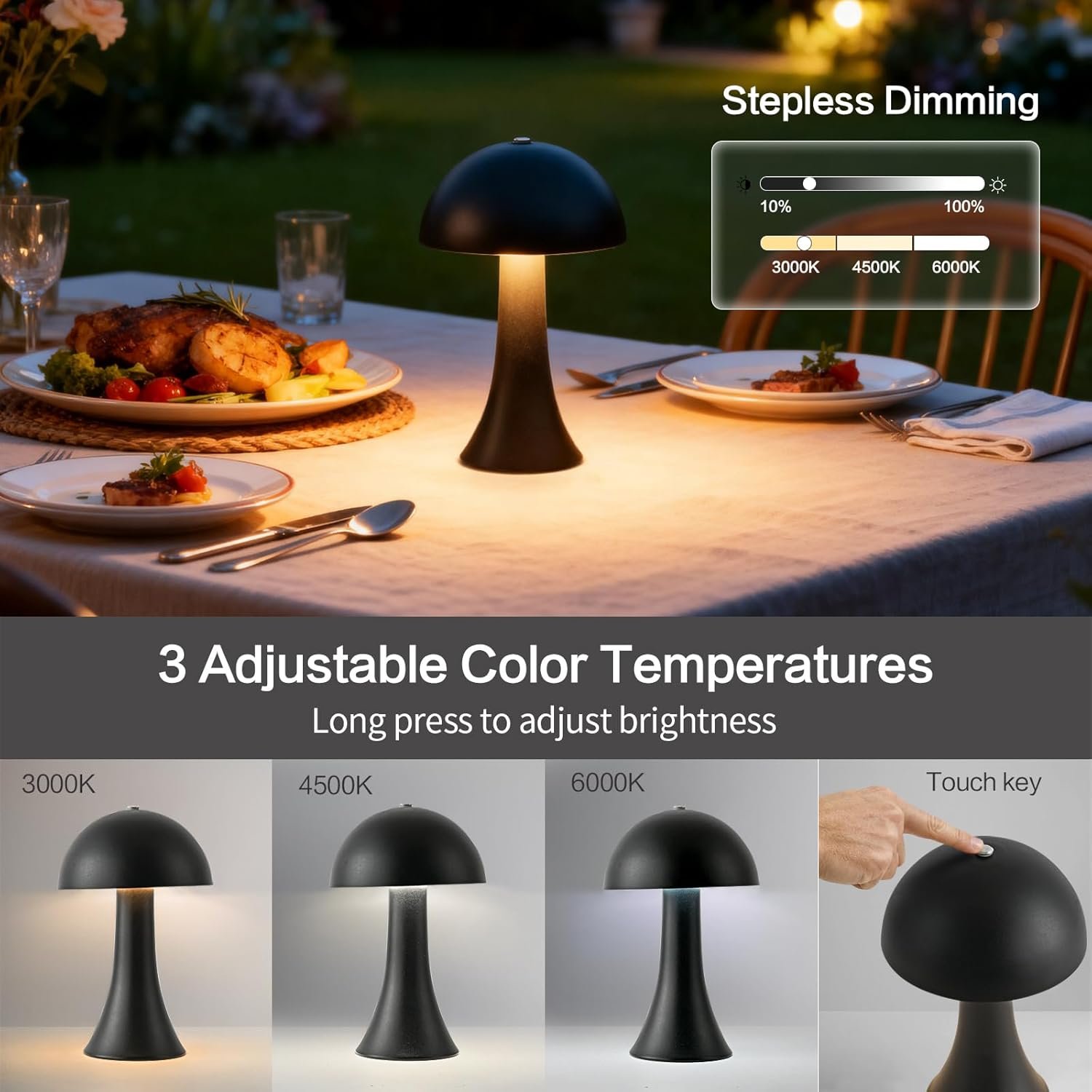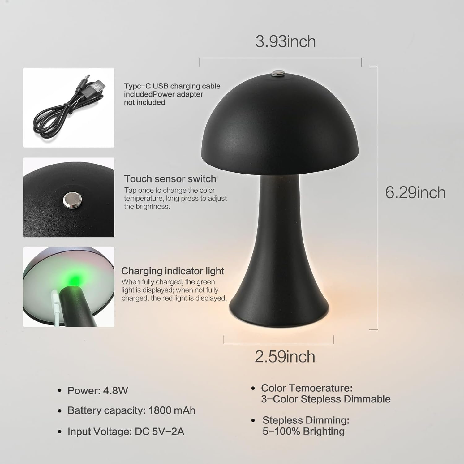 Diseño portátil inalámbrico: Batería recargable integrada de 1800 mAh, puedes usar la luz mientras se carga. Se puede utilizar como luz de emergencia en caso de corte de energía. Ha pasado la certificación de seguridad. Diseño inalámbrico, tamaño moderado, puedes colocar la luz en cualquier lugar sin ocupar espacio visual, diseño simple y moderno que hace que tu hogar sea más elegante. Lámpara LED alimentada por baterías: el tiempo de carga es de 4-5 horas usando USB tipo C, con un rango de 8-20 horas dependiendo del brillo seleccionado. Cuando no esté en uso durante mucho tiempo, la batería entrará en un estado inactivo y requiere varios ciclos de carga para estimular la actividad de la batería. Debe usarse a temperatura ambiente, la baja temperatura afectará el rendimiento de la batería y reducirá la capacidad y la vida útil 3 colores con atenuación sin escalones: Temperatura de color 2700K-6000K, luz blanca, luz blanca cálida y luz cálida. Atenuación continua (5%-100%); control de interruptor táctil, toque ligero para cambiar el modo de luz, pulsa durante mucho tiempo para controlar el brillo de la luz. Ligero y portátil, adecuado para acampar al aire libre/reuniones familiares/iluminación de cenas y otros lugares para crear un ambiente romántico para ti Material de metal: Hecho de cuerpo de lámpara de metal, después del tratamiento de recubrimiento mate, antiarañazos y anticorrosión; del cual el color dorado utiliza tratamiento de galvanoplastia, textura suave. Lámpara para decoración del hogar. La base contiene almohadillas antideslizantes para evitar que se vuelque accidentalmente Garantía de calidad: con el fin de proteger los derechos e intereses de los consumidores, nuestra marca controla estrictamente la calidad para garantizar que no haya ningún problema. Este producto ha sido certificado por UKCA y CE, GS. Si tienes alguna pregunta sobre el uso de este producto, ponte en contacto con nosotros a través de Amazon y proporcionamos servicio las 24 horas para ti.