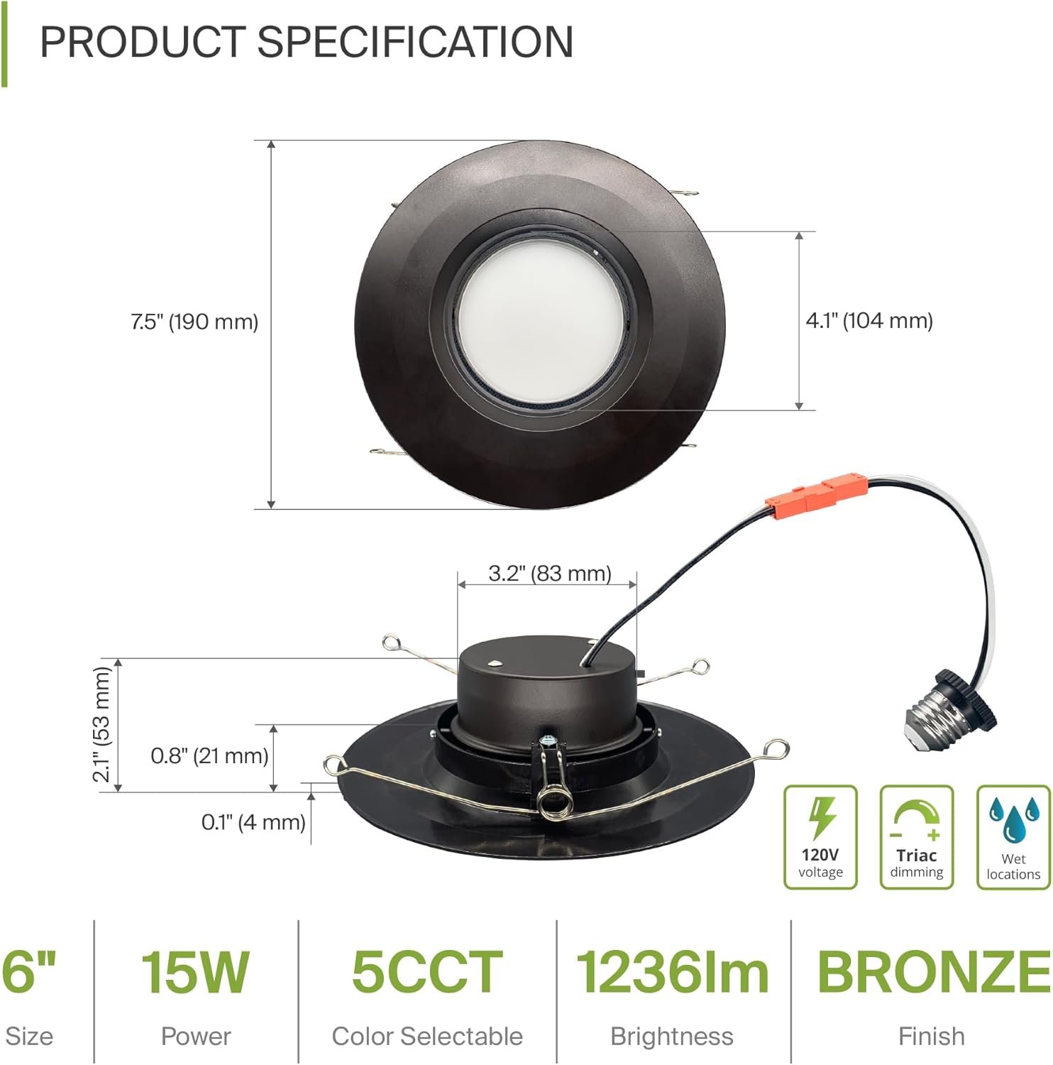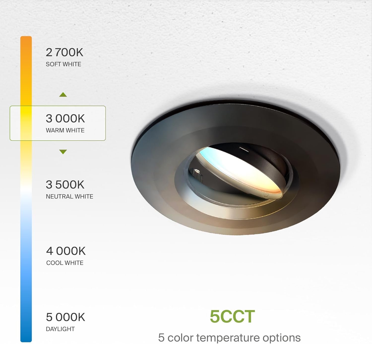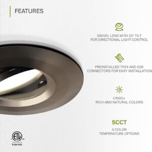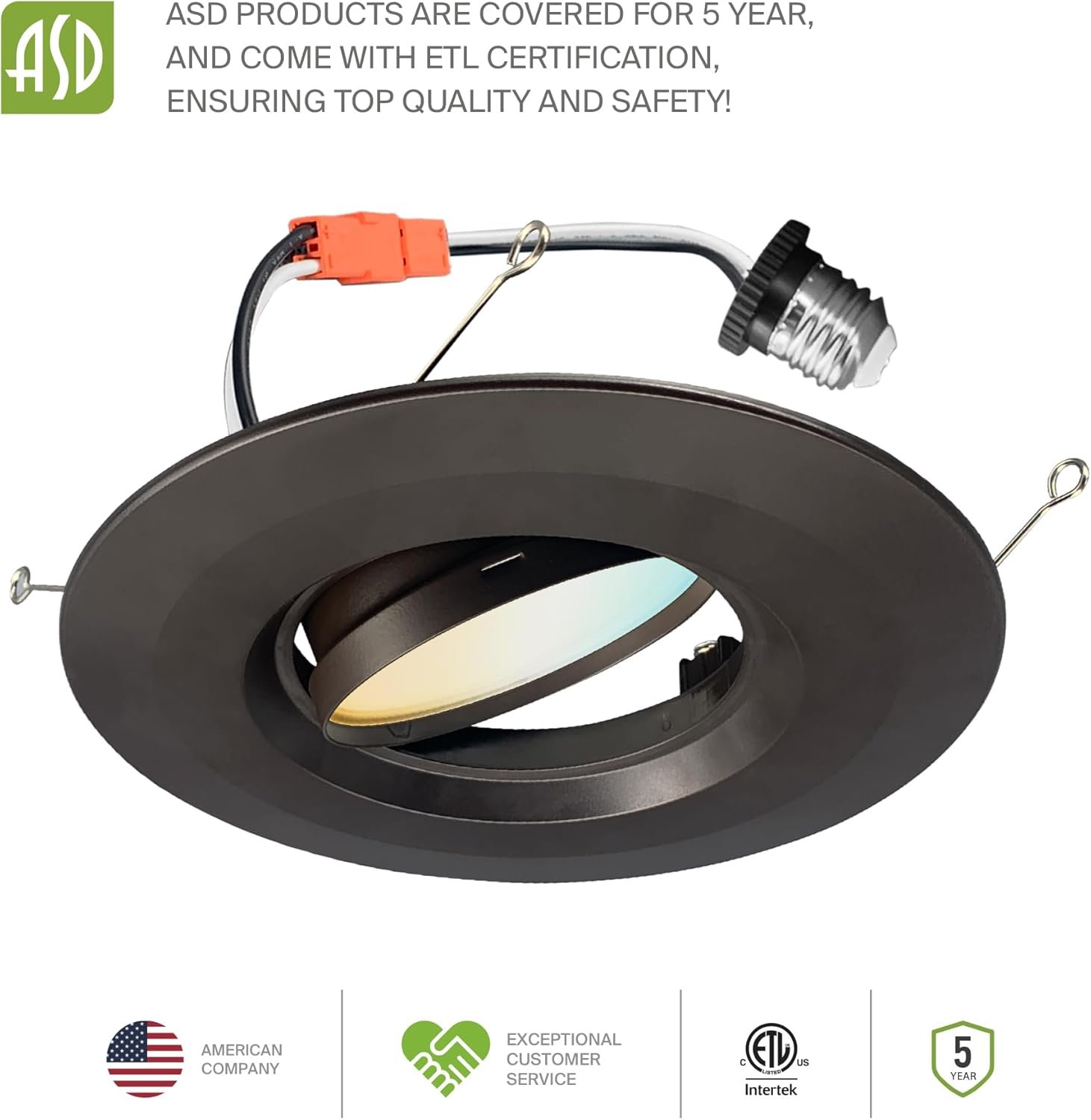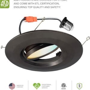 DISEÑO Y OPCIONES. El kit de retroceso de luz LED con cardán ASD es perfecto para techos inclinados e iluminación direccional ya que la luz puede girar y rotar para iluminación en el área deseada. Capacidades de atenuación suaves que van del 10% al 100% con reguladores LED modernos te permiten controlar el aspecto y la sensación de tu espacio. El ángulo de haz de 95° y el CRI90+ te permiten una iluminación suave y uniforme. También es seleccionable por CCT, lo que le permite configurarlo en 2700K, 3000K, 3500K, 4000K o 5000K con un simple interruptor. INSTALACIÓN. La instalación nunca ha sido tan fácil con nuestros conectores universales TP24 o E26. Tiene todo lo que necesitas en un solo juego. Los clips de resorte preinstalados son la mejor solución para una instalación rápida y fácil. Con un diámetro interno de 14,7 cm este accesorio se adapta a latas de 12,7 cm y 15,2 cm con una profundidad máxima de 17,8 cm y es adecuado para la mayoría de carcasas de iluminación empotradas de nueva construcción, remodelación y poco profundas. Consulta las instrucciones de instalación en las imágenes del producto para conocer los pasos detallados. Aplicación. Con 355° de rotación horizontal y hasta 25° de rotación vertical, este LED DOWNLIGHT RETROFIT KIT GIMBAL te proporciona una iluminación uniforme y equilibrada en tu sala familiar, dormitorio, pasillo, corredor o cualquier otra área común de tu hogar. Es adecuado para lugares húmedos, por lo que es perfecto para espacios con requisitos de humedad. También se puede utilizar como una luz de cortesía para una lámpara de techo existente. Ahorro de energía y eficiencia. Con una vida útil de 50.000 horas, estos accesorios están hechos para durar décadas en funcionamiento normal Este accesorio puede reducir su factura de electricidad hasta en un 80% al instante y le ahorrará una cantidad significativa de dinero en su vida útil. CERTIFICACIÓN Y GARANTÍA. Compra con confianza: ASD ofrece una garantía limitada de 5 años junto con la certificación ETL para garantizar productos de alta calidad y seguridad