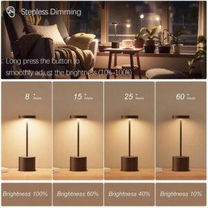 Diseño recargable e inalámbrico con batería de 5000mAh: Disfruta de hasta 8 horas a máxima luminosidad o 60 horas a ajuste bajo con esta lámpara de mesa inalámbrica con batería incorporada; perfecta para picnics al aire libre, camping, cortes de energía o uso en el patio sin cables o enchufes. 3 temperaturas de color y control de atenuación continuo: cambia entre blanco cálido de 2700 K, blanco natural de 4000 K y blanco frío de 5500 K; ajusta suavemente el brillo del 10% al 100% en esta lámpara LED recargable regulable que guarda automáticamente tus ajustes preferidos para leer, tareas o iluminación ambiental. Clasificación de impermeabilidad IP54 para uso versátil en interiores y exteriores: La construcción resistente a salpicaduras y polvo hace que esta lámpara de mesa impermeable portátil sea confiable para piscina, duchas, patios lluviosos, restaurantes o bares de bistró; úsala con confianza en entornos húmedos sin preocupaciones. Construcción metálica duradera y luz LED de alto CRI: base resistente a volcarse y construcción metálica robusta que garantizan durabilidad; LEDs de CRI >80 entregan iluminación sin parpadeos y de color verdadero ideal para lectura en la mesita de noche, trabajo de escritorio, decoración de mesa de café, o ambiente en el dormitorio en esta lámpara operada por batería. Tamaño portátil compacto para versatilidad diaria: diseño ligero y recargable por USB-C que cabe en cualquier lugar, desde lámparas de mesita para niños y escritorios de dormitorio hasta fiestas en bares, cenas románticas o mesas de restaurante; esta mini luz LED inalámbrica mejora cualquier espacio con fácil movilidad. Elección perfecta de regalo y festividad: el diseño elegante y el práctico paquete de 2 hacen que estas lámparas inalámbricas sean un regalo maravilloso para Navidad, Acción de Gracias, cumpleaños, inauguración de la casa o bodas.
