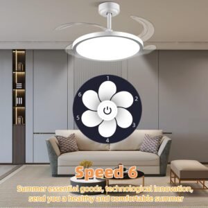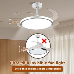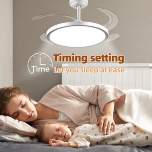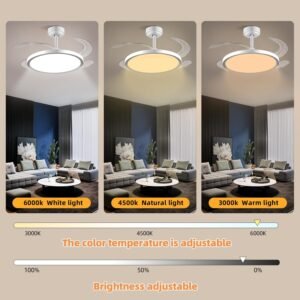 Control por aplicación y apariencia única Ventilador de techo retráctil con atenuación continua, ajuste de temporizador del ventilador (apagado automático de 2/4/8 horas), rotación hacia adelante y hacia atrás, 6 velocidades y otras funciones se pueden controlar fácilmente por control remoto y aplicación. Ventilador de techo retráctil reversible de 6 velocidades Ventilador de techo retráctil con luz, cuchillas retráctiles de 4 hojas de acrílico transparente engrosado, el ventilador de 6 velocidades admite rotación hacia adelante y hacia atrás. Las aspas del ventilador giran hacia adelante para proporcionarte aire frío fuerte en el verano caliente, y en invierno los ventiladores de techo se invierten para proporcionar aire fresco en toda tu casa. Motor DC silencioso y de ahorro de energía El motor DC de cobre puro asegura un rendimiento estable, un potente flujo de aire y un funcionamiento casi silencioso. Disfruta de noches relajantes y facturas de energía más bajas con esta duradera lámpara de techo con ventilador retráctil. Configuración de temporización La luz de ventilador de techo retráctil cuenta con control de temporización independiente tanto para el ventilador como para la lámpara. Puedes configurar cómodamente cada función para que se apague automáticamente después de 2, 4 u 8 horas, lo que te ayuda a ahorrar energía mientras mantienes un ambiente cómodo. El control inteligente hace que los ventiladores de techo retráctiles sean más cómodos y eficientes. Tres modos de color Este es un ventilador de techo retráctil con luz de tres colores intercambiables, cambia el color de la luz del ventilador de techo a través de la aplicación, al mismo tiempo, el brillo y la temperatura de color se pueden ajustar a través de la APP, la tecnología de iluminación de cuidado ocular de espectro completo recién actualizada simula con precisión la luz natural del día, ofreciendo una precisión de color sin igual y aliviando eficazmente la fatiga visual durante la lectura, el trabajo o las actividades de ocio. Instalación fácil La instalación de este ventilador de techo retráctil es muy fácil, tenemos instrucciones detalladas de instalación y video de instalación. Puede ser instalado fácilmente por una sola persona, lo que le ahorrará mucho costo de instalación.