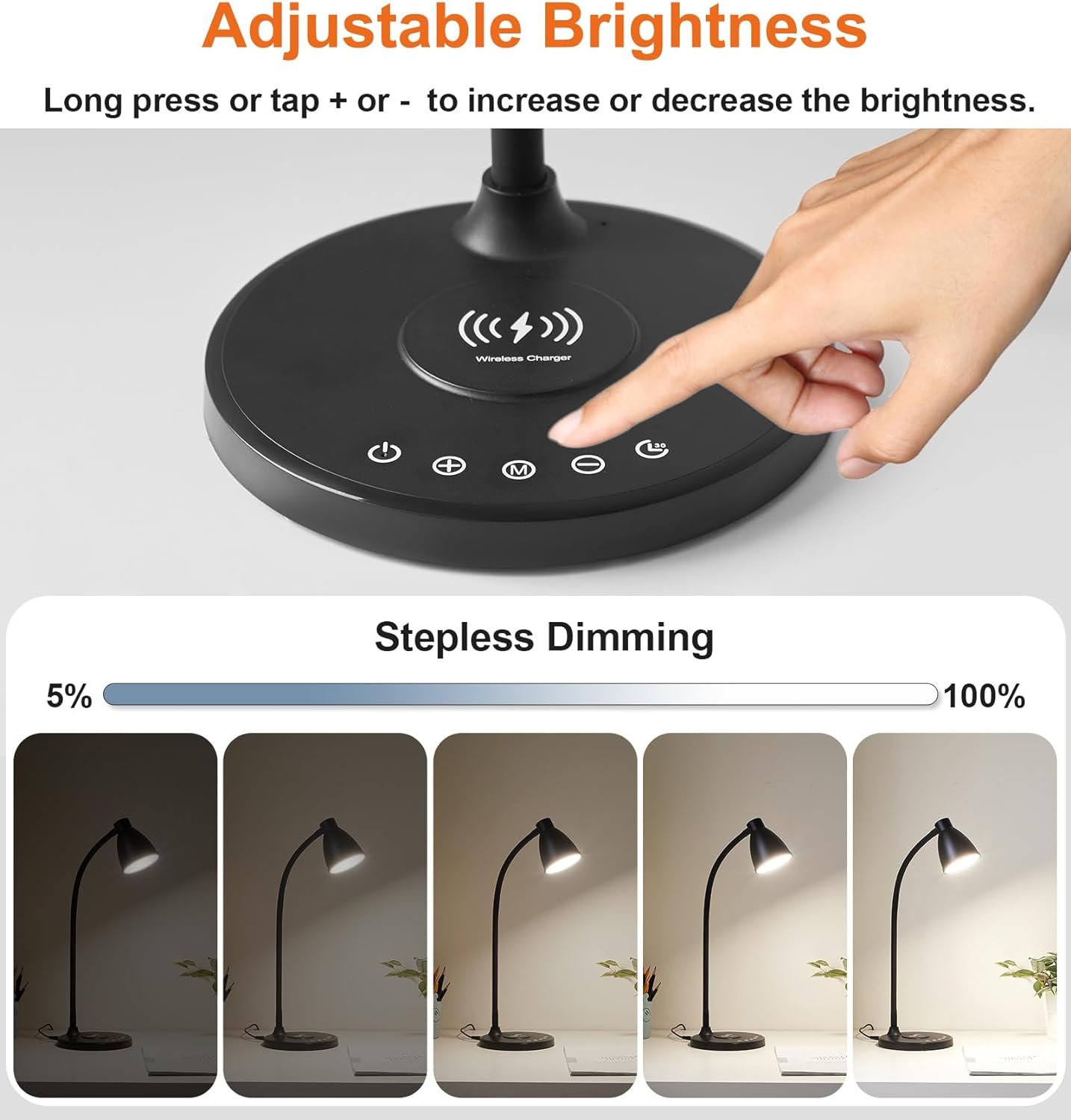 Hub de carga dual + alimentación inalámbrica para oficina en casa: mejora tu espacio de trabajo con la luz de escritorio multifuncional de BOHON con puertos USB A/USB-C duales (5V/2A) y un cargador inalámbrico rápido de 12 W. Alimenta teléfonos, tabletas o lectores electrónicos sin esfuerzo mientras trabajas, ya sea utilizando esta lámpara de noche como una estación de carga nocturna o una lámpara de escritorio de oficina en casa. Consejo profesional: las fundas gruesas para teléfonos pueden interferir con la carga inalámbrica. Tecnología Eye-Comfort para el trabajo y la lectura: diseñada con 60 chips LED avanzados, esta lámpara de escritorio de oficina ofrece iluminación sin parpadeo certificada para reducir la fatiga ocular. El difusor antirreflejos crea una luz suave y uniforme perfecta para sesiones de estudio de maratón, lámparas de lectura nocturna para uso en cama o largas horas de trabajo desde casa. Ambiente personalizable a través del control táctil inteligente: adapta instantáneamente la iluminación a cualquier tarea: ciclo a través de 5 temperaturas de color (de ámbar cálido a luz diurna fría) y atenuación continua (5% -100% de brillo). Ideal para lámparas de lectura a la hora de dormir, trabajo de luz de escritorio enfocado o crear un ambiente acogedor. La función de memoria de pulsación prolongada guarda los ajustes favoritos automáticamente. Apagado automático y diseño inteligente con espacio: la lámpara de escritorio de estilo arquitecto cuenta con un temporizador de sueño de 30 minutos, perfecto para usuarios de lámparas de noche propensos a dormirse con libros. Su base de metal pesada y cuello de cisne ultra flexible proporcionan un posicionamiento completo de 360° sin sacrificar el espacio del escritorio/mesa, por lo que es ideal para dormitorios u oficinas compactas en casa. Iluminación de tareas ajustable para cualquier escenario: reimagine la productividad con la luz de lectura de cuello de cisne flexible. Iluminación precisa directa sobre documentos como una lámpara de escritorio para proyectos de oficina en casa, luz suave en ángulo para leer en la cama o colocar como una lámpara de mesita de noche de perfil bajo. Construcción duradera que garantiza años de uso confiable.