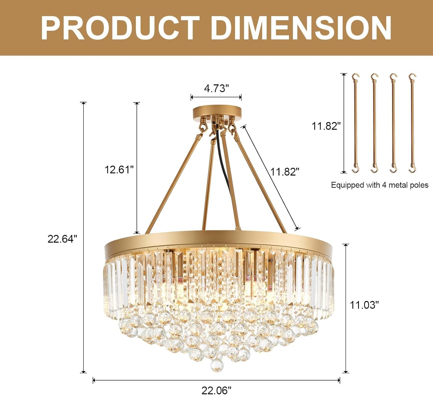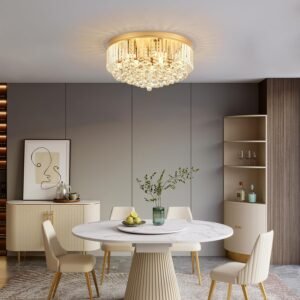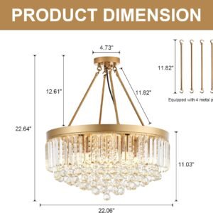 Diseño de lámpara de araña de cristal moderno: La lámpara de araña de cristal empotrada de oro, diámetro: 56,0 cm. Altura: 28,0 cm. Y la lámpara de 9 luces de cristal tiene bordes y esquinas de corte con superficies transparentes, brillantes y deslumbrantes, que presentan un exquisito efecto de luz y una atmósfera moderna en tu habitación. Añade una hermosa pantalla de lámpara de araña de techo con impresionantes cuentas de cristal a tu casa, haciendo que tu casa brille y esté a la moda. Brillo elegante: se requieren 9 bases de bombillas E12 (no incluidas en el paquete). Las bombillas tienen un máximo de 60 W. Esta lámpara de araña dorada para dormitorio, que puedes usar como una bonita decoración para llenar el espacio aéreo con belleza resplandeciente. Te dará suficiente brillo. Alta calidad: Esta lámpara de araña moderna de cristal cercana al techo está equipada con cristales transparentes (cristales de barra y cristales de globo), que tienen un tacto similar al vidrio, textura elegante, resistente e irrompible. La lámpara de araña de cristal está hecha de acero inoxidable grueso, con una superficie brillante como un espejo, antioxidante, sin óxido y no se desvanecerá después de un uso prolongado. Fácil de instalar: el material de este candelabro de cristal dorado para colgar en el techo es muy sólido y cableado. Se proporcionan instrucciones detalladas y accesorios de hardware para una instalación rápida y fácil. Si tienes alguna pregunta sobre este candelabro de entrada, no dudes en ponerte en contacto con nosotros a través del correo electrónico de Amazon y nos pondremos en contacto contigo lo antes posible. Amplia aplicación: estas luces de vidrio para dormitorio con montaje empotrado pueden ser suspendidas y montadas en el techo, también se pueden usar en cualquier lugar como entrada, dormitorio, isla de cocina, pasillo, cocina, comedor, sala de estar, balcón, vestíbulo, etc. Buena opción para tu hogar.