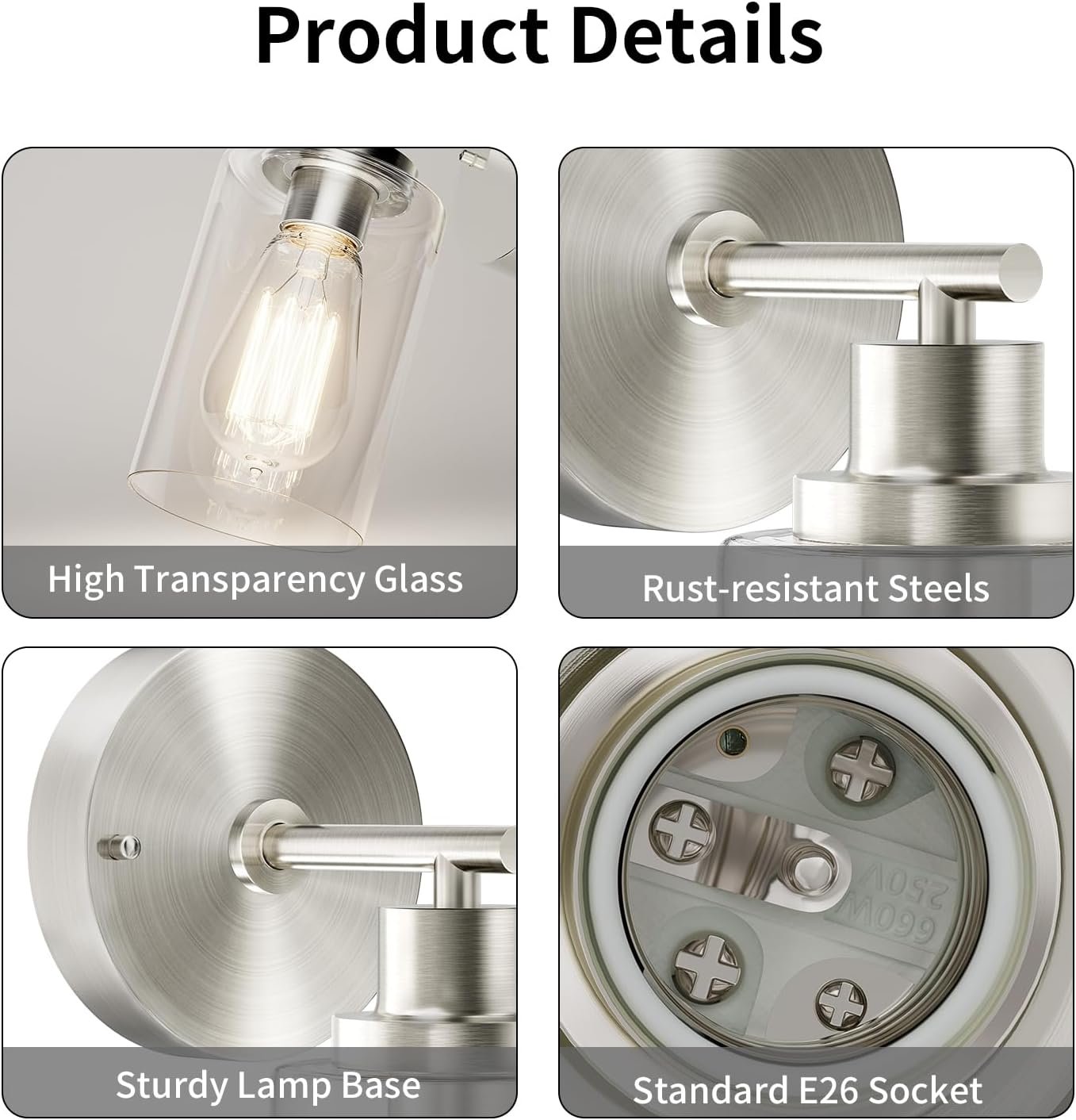 Tamaño ideal para varias aplicaciones Con unas medidas de 13,0 cm de largo, 9,8 cm de ancho y 27,0 cm de alto, esta lámpara de pared es perfectamente adecuada para varios espacios. Su diseño compacto hace que los apliques de pared sean una excelente opción para pasillos, entradas de puertas, dormitorios, salas de estar, baños y entradas. El estilo elegante garantiza que el aplique de pared sea una adición elegante a cualquier parte de tu hogar u oficina. Candelabro de pared moderno y duradero El candelabro de pared de níquel cepillado está construido con una base de acero resistente y una pantalla de vidrio simple, lo que garantiza que esté hecho para durar. El difusor de la lámpara está hecho de vidrio altamente transparente, lo que permite que la luz ilumine completamente cada rincón. La base y el soporte de acero son resistentes al óxido y duraderos, proporcionando un soporte estable y evitando aflojamientos o deformaciones. Esta excelente lámpara de pared combina durabilidad con estética moderna, por lo que es una adición llamativa a cualquier habitación. Base estándar E26 La lámpara de pared es compatible con bombillas de base E26 estándar con un máximo de 60 W (bombilla no incluida). Ya sea que prefieras lámparas incandescentes, LED o bombillas de diferentes temperaturas de color, estas lámparas de pared para el dormitorio te permiten elegir la bombilla adecuada para tus necesidades. También puedes utilizar bombillas regulables para controlar fácilmente el brillo y la temperatura de color de tu iluminación. Esto te da la libertad de elegir una iluminación que coincida con tu estilo. Dos opciones de montaje El diseño de esta iluminación de pared de vidrio permite diferentes opciones de instalación. Puedes instalar las luces de pared interiores hacia arriba o hacia abajo para satisfacer diferentes necesidades de iluminación y preferencias estéticas. La instalación hacia arriba proporciona un brillo suave y difuso, creando un ambiente cálido y acogedor, mientras que la instalación hacia abajo proporciona una iluminación más directa, ideal para espacios que requieren una iluminación más brillante. Instalación sin esfuerzo Los apliques de luz están diseñados con cableado fijo, eliminando la necesidad de lidiar con procesos de instalación complejos o cables antiestéticos. Simplemente conecta los apliques de pared de dormitorio a tu cableado existente, luego monta la placa base redonda en la pared y, finalmente, atornilla la pantalla de cristal y la bombilla (bombilla no incluida) en secuencia. Una vez completado el proceso de instalación, puede disfrutar fácilmente de esta lámpara de montaje en pared de estilo moderno.