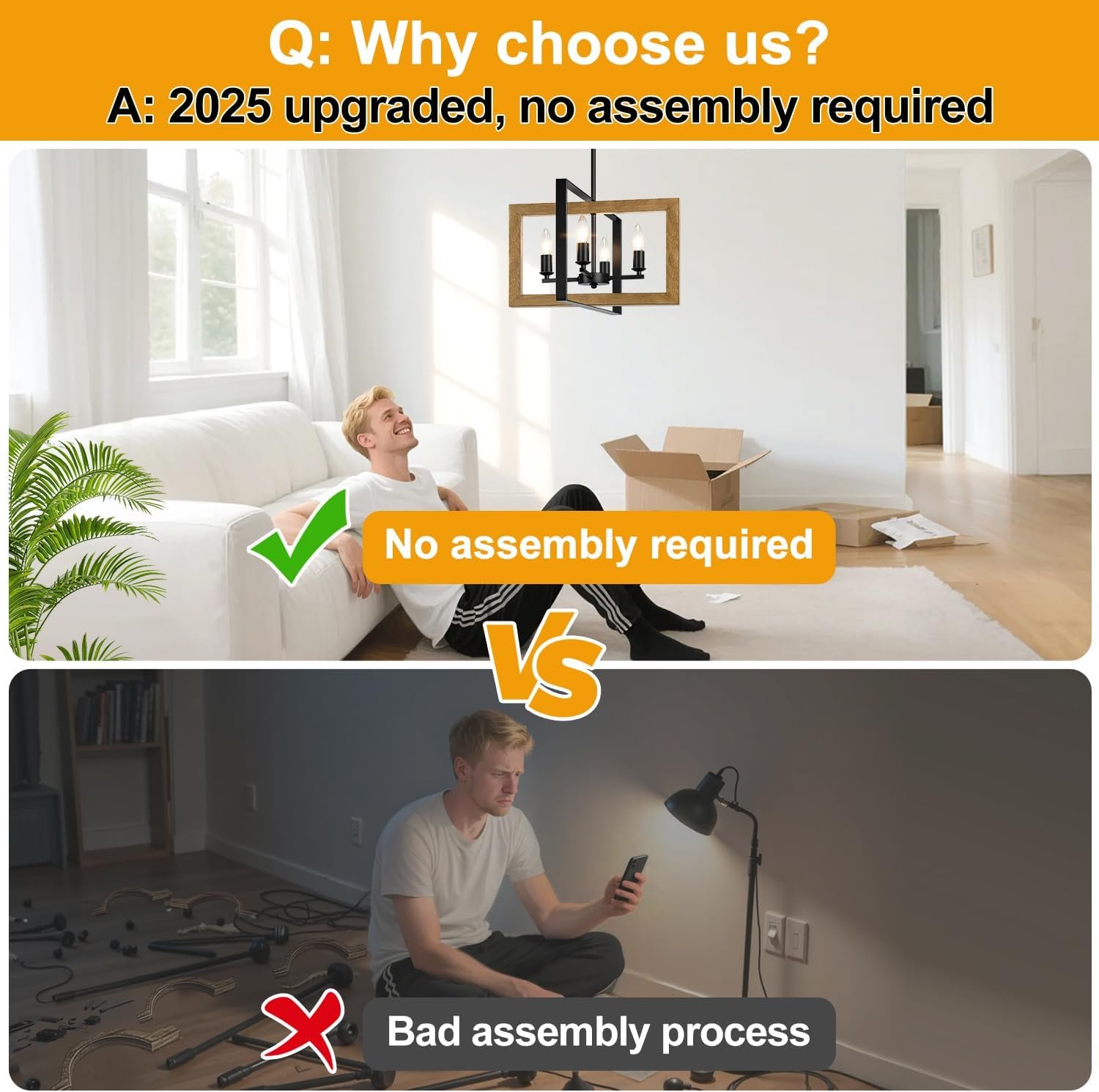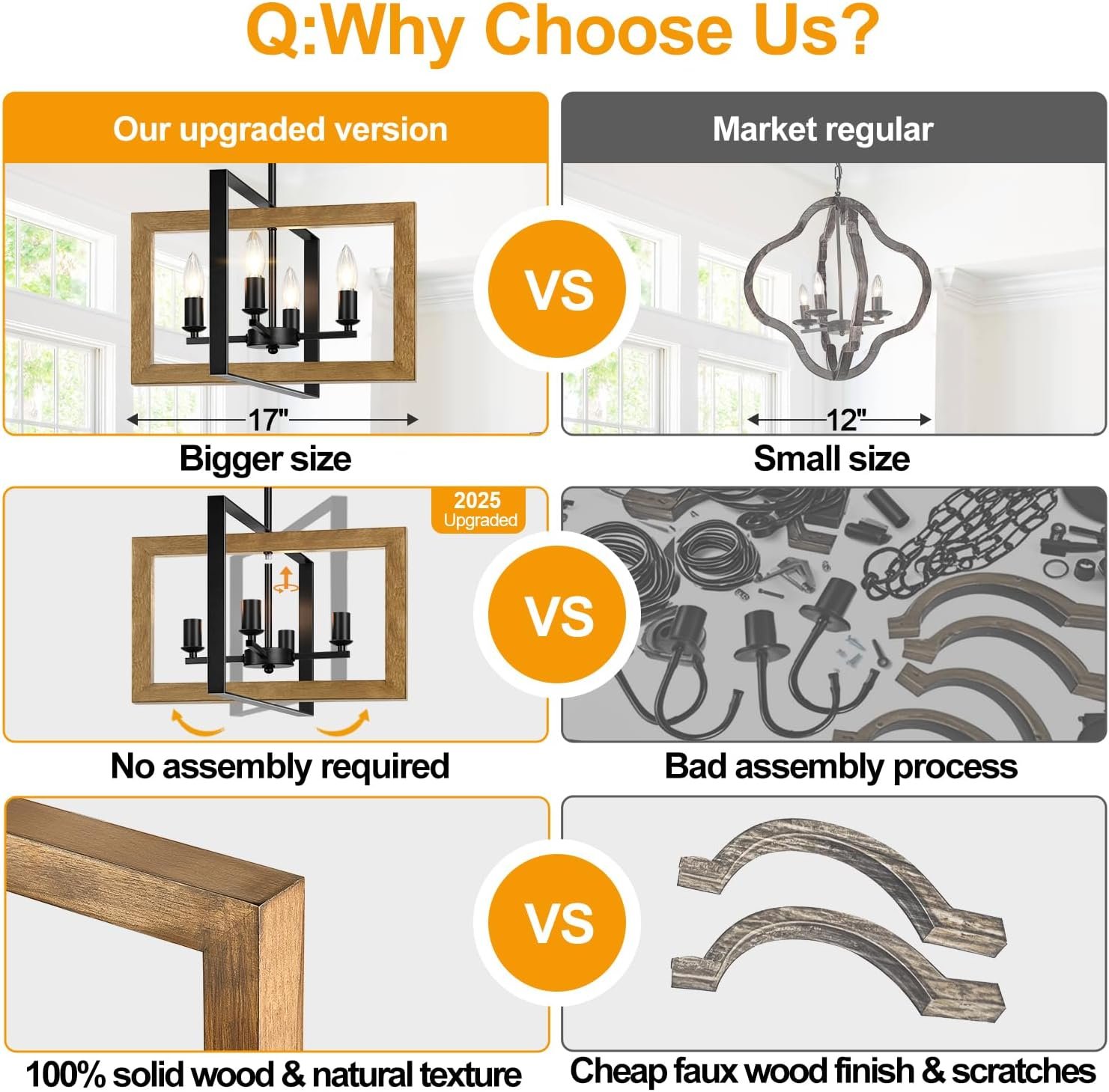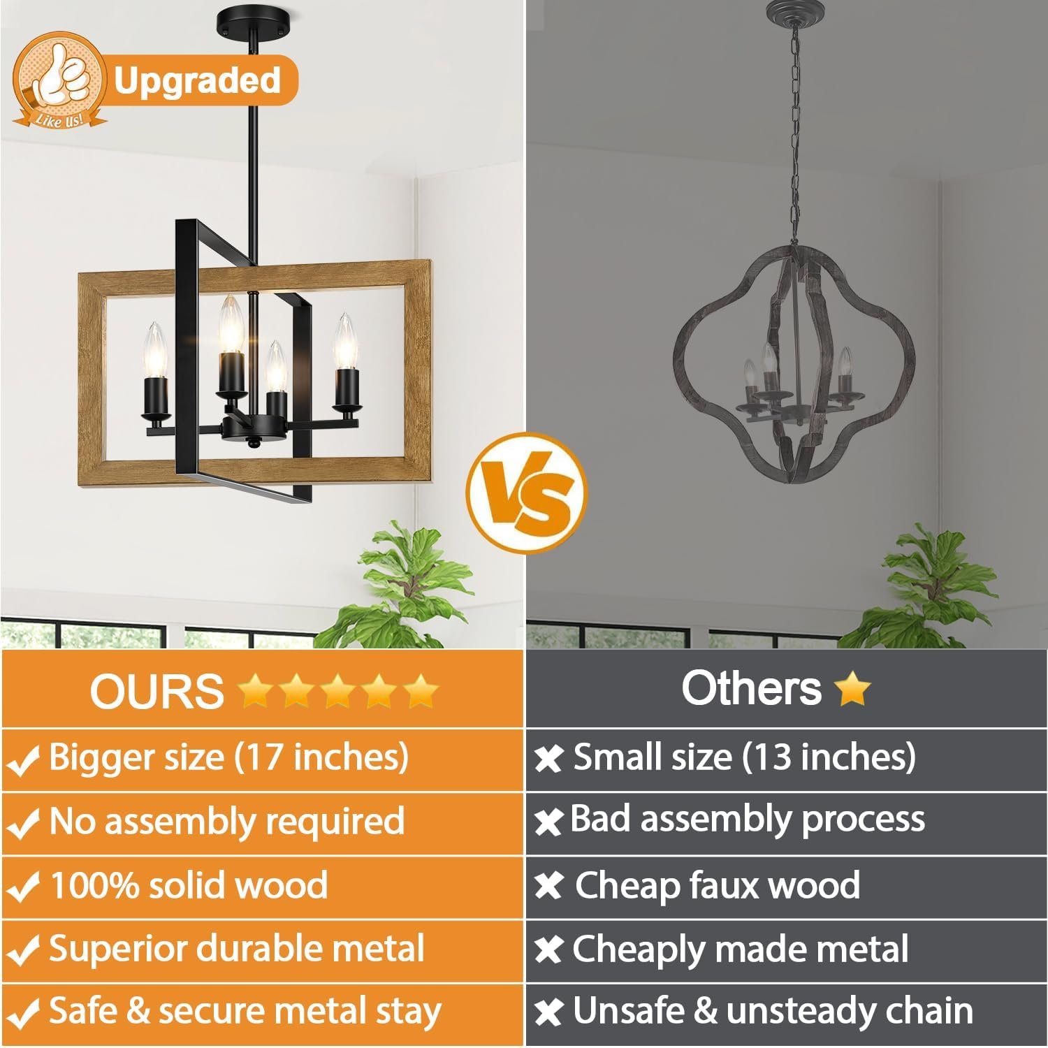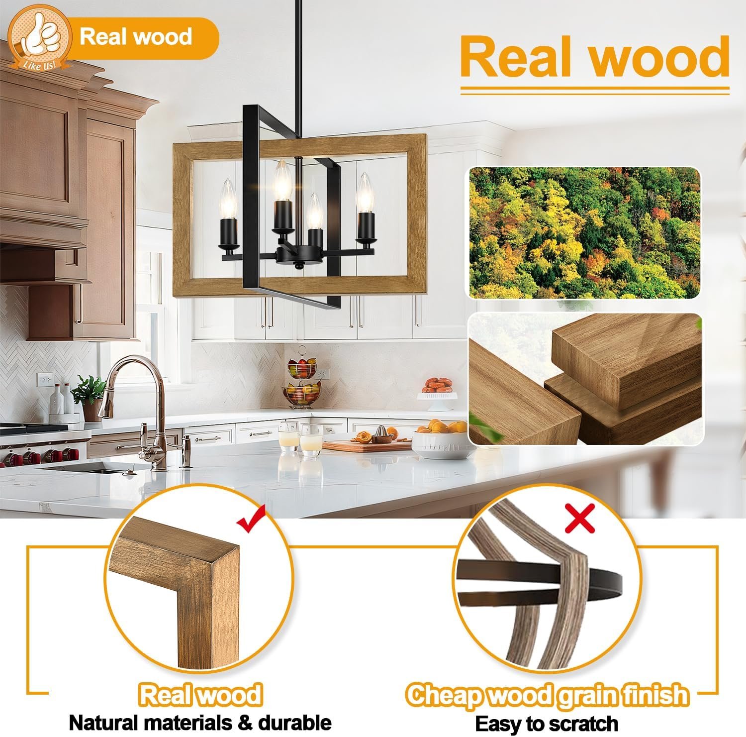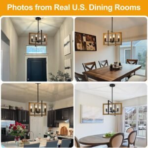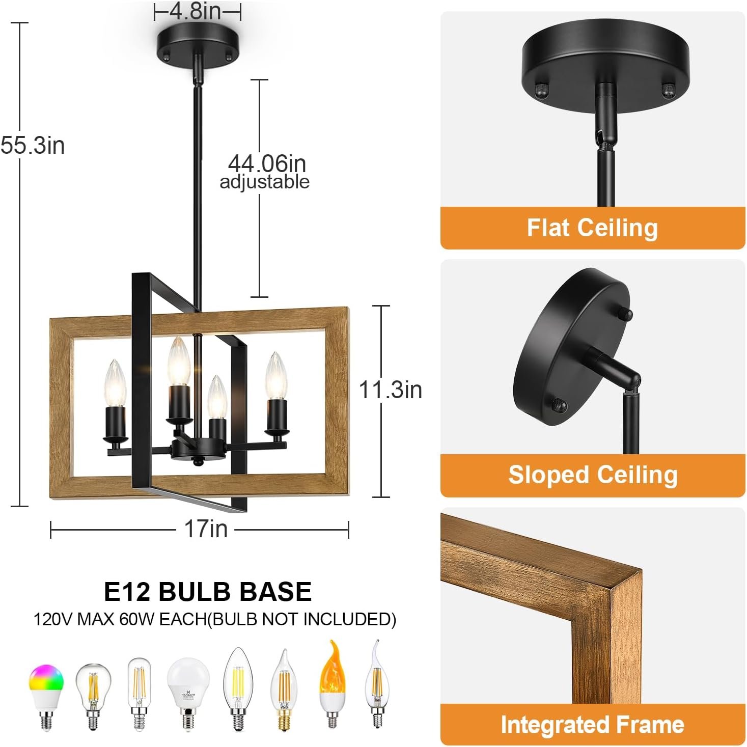 Lámpara de araña de granja: este candelabro rústico cuenta con un marco de metal negro mate combinado con un marco de madera de nogal que muestra naturalmente sus patrones de grano originales. Como cada pieza de madera es única, pueden producirse ligeras variaciones en textura y color. Combinado con 4 brazos de lámpara de diseño simple y marcos giratorios de 360 grados, ofrece un estilo atemporal adecuado para espacios como la isla de cocina, dormitorio, vestíbulo, mesa de comedor, sala de estar, entrada, granja y oficina. Marco premontado y fácil instalación: diseñado para la simplicidad, este candelabro para comedor cuenta con marcos integrados que no requieren montaje, simplemente conecta las varillas y los cables. Nuestra lámpara de comedor viene con todas las piezas necesarias e instrucciones claras (idioma español no garantizado) para una instalación sin complicaciones. Altura ajustable: con 4 varillas de empalme, este candelabro rústico de granja se puede ajustar de 11.3 a 140,5 cm de altura para satisfacer cualquier necesidad de iluminación, proporcionando estabilidad y reduciendo los temblores. Este candelabro de comedor es adecuado tanto para techos inclinados como planos, adaptándose a diversos diseños de habitaciones. Requisitos de bombilla: equipada con 4 bases E12, esta lámpara de comedor sobre mesa soporta varios tipos de bombillas, incluyendo incandescente, LED, CFL y halógeno (bombillas no incluidas). Combina esta lámpara de madera con bombillas regulables y un interruptor de atenuación compatible (interruptor no incluido) para una iluminación ajustable. Servicio impecable: como vendedor responsable, ofrecemos una garantía de 36 meses y soporte técnico de un equipo profesional. Si hay algún problema con nuestra lámpara colgante, no dudes en ponerte en contacto con nosotros haciendo clic en cmContactar con el vendedor cm en la página, te proporcionaremos una solución satisfactoria en 24 horas.