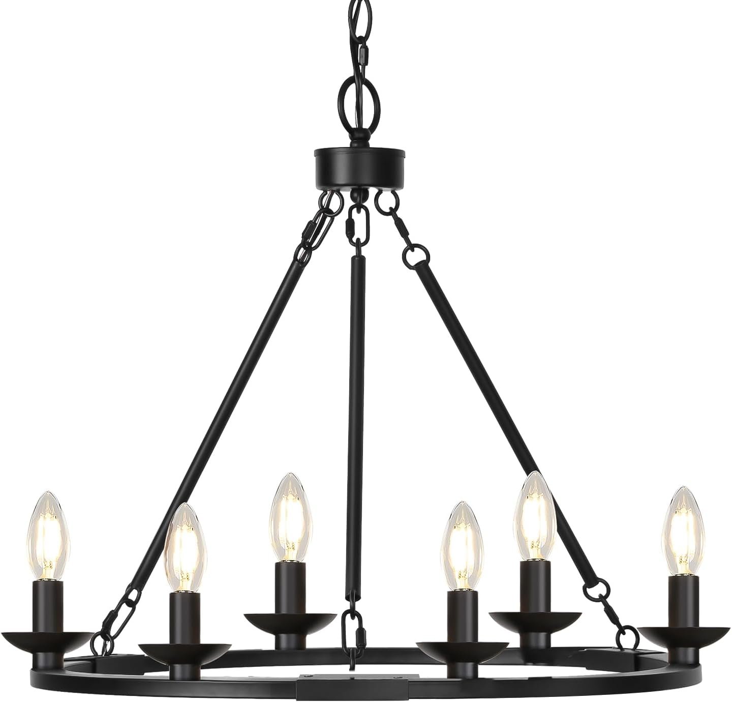 Candelabro moderno y de granja: diseñado con 6 luces de estilo vela colocadas sobre el marco de la rueda del carro, los candelabros para comedor son una gran mezcla de estilo rústico y contemporáneo. Con un diseño de trabajo abierto de 360 grados, la lámpara de techo puede proporcionar suficiente iluminación, adecuada para reuniones de amigos y familiares. Dimensión: Diámetro de la rueda: 52,5 cm, Altura del accesorio: 41,3 cm, Longitud máxima de la cadena: 91,4 cm. El candelabro negro funciona para techo inclinado y abovedado, perfecto para colgar en tu isla de cocina, porche, escalera, mesa de comedor, sala de estar, entrada, dormitorio, vestíbulo, etc. Comprueba la información de tallas en la segunda foto cuidadosamente antes de comprar. Altura ajustable y gran calidad: Adoptando bucles de metal desmontables, esta lámpara le permite ajustar de manera flexible su altura colgante para diferentes necesidades. La longitud máxima de la cadena es de 91,4 cm. Construido de metal resistente con acabado negro, la lámpara colgante no se oxida ni se decolora, duradera y confiable para un uso a largo plazo. Requisito de bombillas y regulable: nuestro candelabro negro de rueda de carro es compatible con varias bombillas de base E12, incluyendo LED, incandescentes y halógenas, bombillas CFL, 60 W máx. para cada base. Es totalmente regulable cuando se utiliza con bombillas regulables e interruptor de atenuación compatible. (Las bombillas y el interruptor de atenuación no están incluidos). Consejos de instalación: Para un paquete mejor y seguro durante el transporte, los candelabros para entrada adoptan una construcción segmentada y requieren una instalación simple. Todos los accesorios necesarios están incluidos. Para ahorrar tiempo y hacer que toda la instalación sea más clara, sugerimos consultar el video de instalación en nuestro listado para ensamblar.
