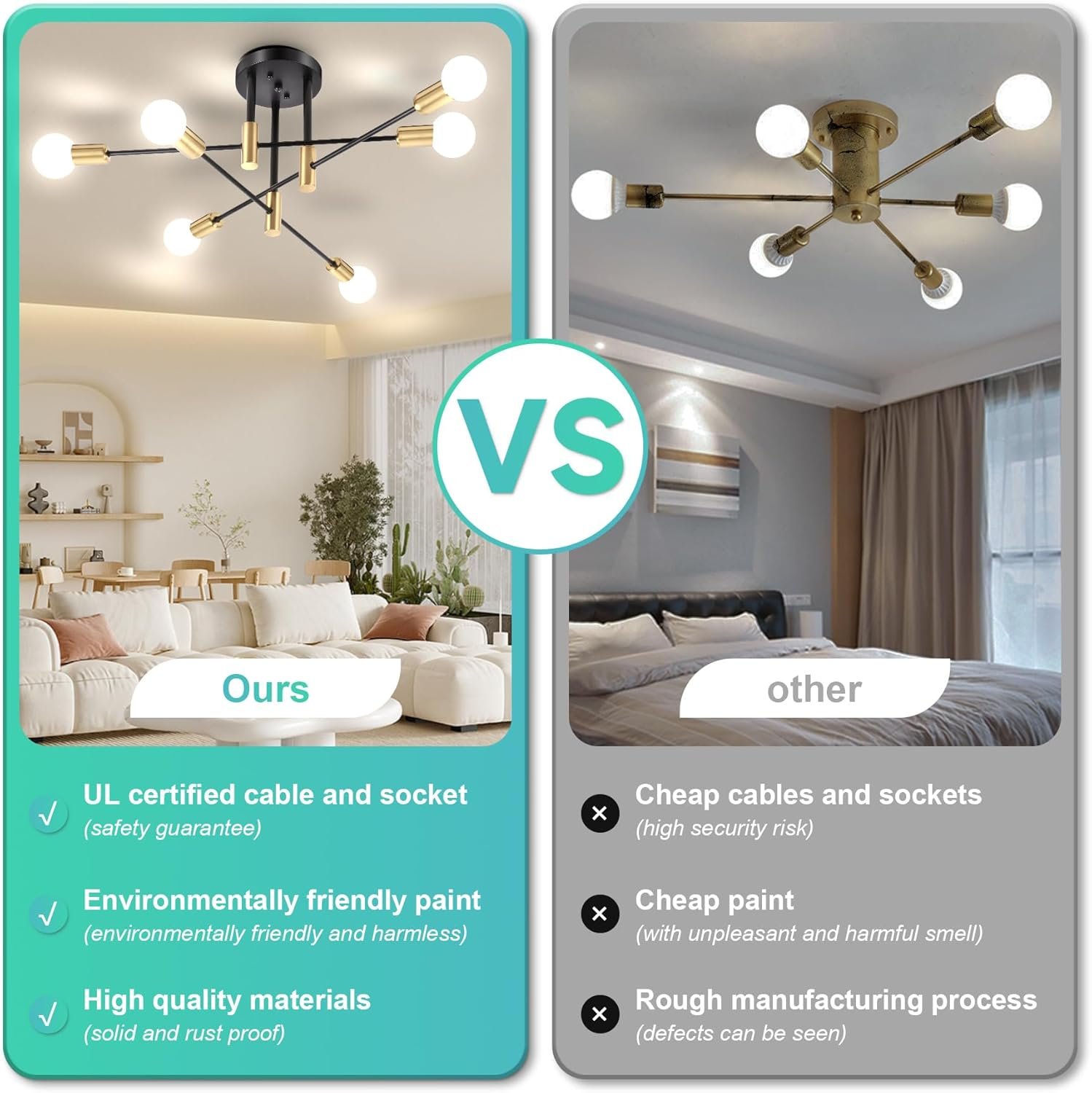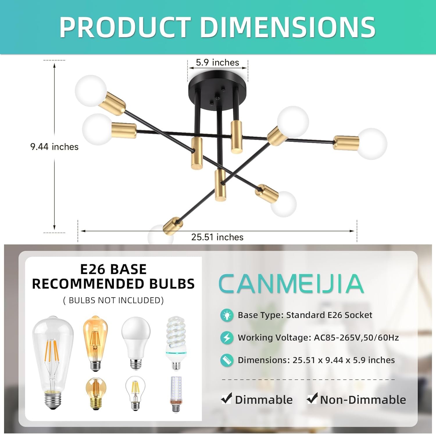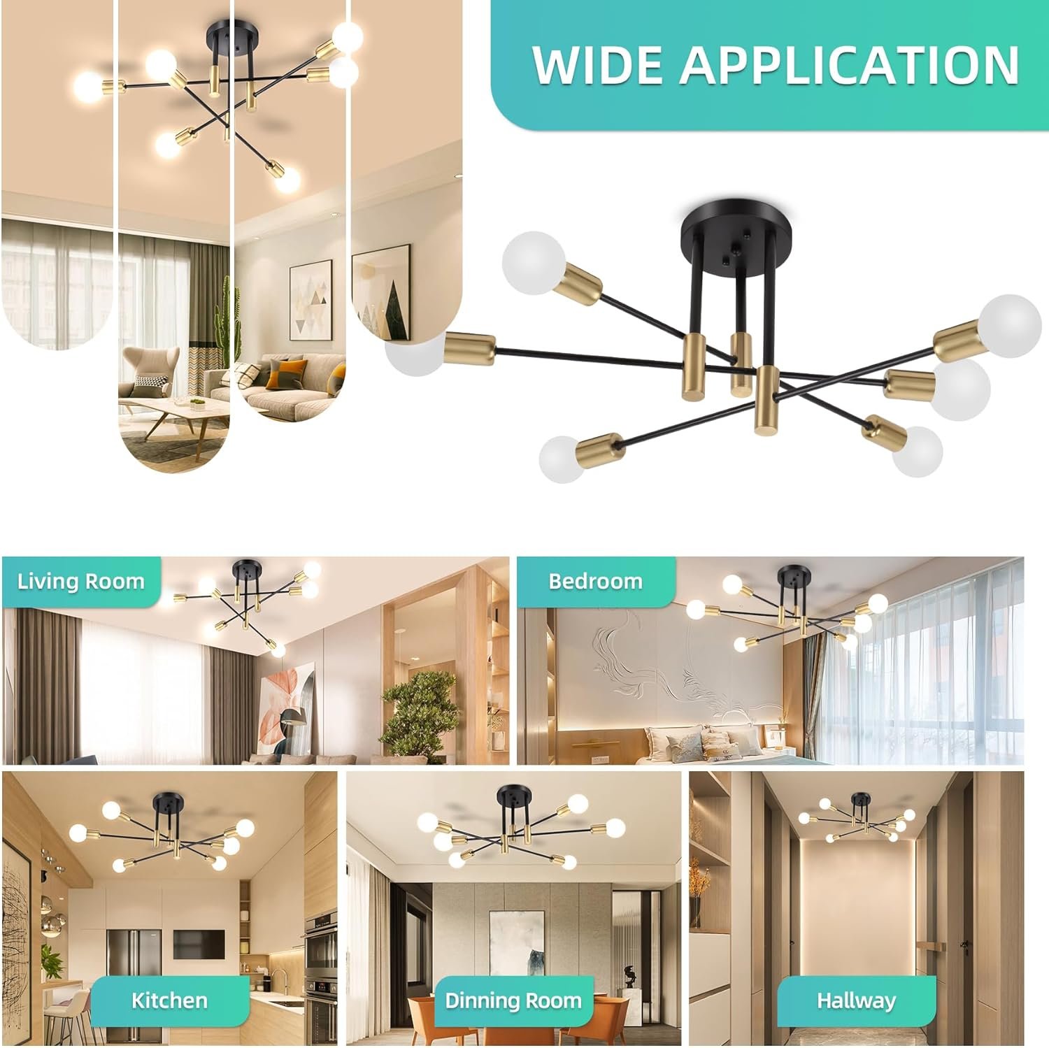 Diseño minimalista: esta lámpara de araña sputnik negra y dorada está dispuesta por 6 brazos lineales largos y cortos cruzados y puede acomodar 6 bombillas. Combinando con estilo industrial y diseño abierto, puede añadir estilo a tu lugar incluso con la luz apagada Enchufes estándar E26: este moderno candelabro requiere 6 bombillas de base media E26 (máximo 60W por cada luz, bombillas no incluidas). También puedes actualizar la atmósfera de tu hogar cambiando las temperaturas de color de las bombillas Fácil de montar: los brazos de la lámpara del comedor se pueden girar 360 grados horizontalmente y se pueden ajustar a cualquier ángulo que desee. Es rápido de montar, gracias a la guía fácil de seguir que viene con el paquete Amplia aplicación: esta lámpara de techo combina la estética moderna y de mediados de siglo, mejorando el encanto de cualquier habitación. Adecuado para entrada, dormitorio, comedor, sala de estar, pasillo, pasillo, sótano, balcón, bar, oficina, granja, etc Candelabro Sputnik moderno: esta lámpara está hecha de material de metal de alta calidad con un acabado antioxidante bien frotado que asegurará que pueda durar años. Te ahorra la molestia de un reemplazo frecuente