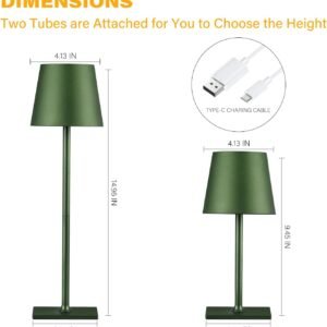 3 modos de iluminación y atenuación continua: nuestra lámpara de escritorio inalámbrica tiene 3 opciones de temperatura de color: luz cálida, luz blanca cálida y luz blanca. Control táctil: Haga clic en encendido/apagado y cambie el modo de luz. Pulsa durante mucho tiempo para controlar el brillo de la luz (10%-100%). Cuando enciendas la luz de la mesita de noche nuevamente, registrará el último brillo ajustado. Lámpara de mesa recargable inalámbrica: la lámpara funciona con pilas tiene una batería recargable integrada de 5000 mAh de alta calidad, que se puede utilizar durante 8-20 horas cuando está completamente cargada (dependiendo del brillo seleccionado). Deshazte de los grilletes de las lámparas de escritorio tradicionales con cable. Puedes colocar las lámparas de mesa inalámbricas en cualquier lugar. Protección ocular: nuestra lámpara inalámbrica retro está diseñada con una fuente de luz circular, brillo de iluminación uniforme de 360 grados, que se puede ajustar de acuerdo a tus necesidades. Fuente de luz integrada LED sin parpadeo. Se adapta a tus ojos. La lámpara de mesita de noche adopta cuentas de lámpara LED de alta calidad, lo que hace que los ojos sean más cómodos. Diseño minimalista: esta lámpara de mesa táctil es desmontable. Viene con dos tubos. Puedes ajustar la altura de la lámpara según sea necesario. El material general es de metal de alta calidad con proceso de recubrimiento mate. Resistente a los arañazos. El diseño antideslizante inferior utiliza silicona suave para proteger la parte inferior de resbalones. Amplia aplicación: nuestra lámpara recargable se puede combinar con varias escenas y estilos. También se puede utilizar como luces ambientales para Acción de Gracias, Navidad. La lámpara de mesa pequeña es adecuada para dormitorio, mesita de noche, oficina, restaurante, cafetería, bar, hotel, iluminación de patio al aire libre, etc. También es un gran regalo
