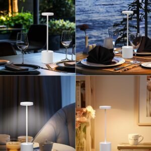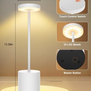 Battery Operated Table Lamp Experience the convenience of a built-in 5000mAh rechargeable battery, offering 8 to 48 hours of usage with fast charging in just 3-4 hours. This lamp, brings versatile lighting to any space, ensuring illumination whenever and wherever needed. Stepless Dimmable & 3 Light Modes Controlled via the lamp’s top panel, this LED desk lamp offers stepless dimming (100%-20%) with long press and three light modes (warm white, warm, white) with short press, allowing for easy adjustment of brightness and color temperature (2800K-6000K) to meet all needs, suitable for outdoor camping/family gathering/dinner lighting. Portable LED Table Lamp This rechargeable table lamp is designed with 24 flicker-free LED light sources providing 360° illumination, complemented by high-quality aluminum alloy construction. Its soft LED light is gentle on the eyes, and the IP54 water-resistant design ensures suitability for outdoor use. Minimalist Design Desk lamp height: 13.39cm. Crafted from strong yet lightweight aluminum, this portable table lamp features a simple design. Its minimalist aesthetic merges seamlessly with functionality, providing effective and non-dazzling lighting suitable for indoor and outdoor settings. Whether for intimate dinners, cozy workspaces, or reading books, this lamp adds warmth and style to any environment, making it a versatile companion in your daily activities. After Sales Service We insist on providing customers with pleasant customer service experience. If you have any questions or concerns about portable LED Desk Lamps, please contact us service team. We will do our best to solve your problem