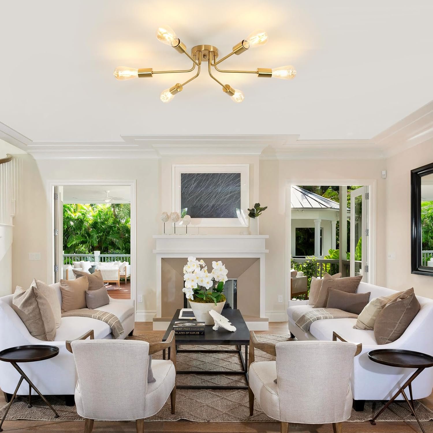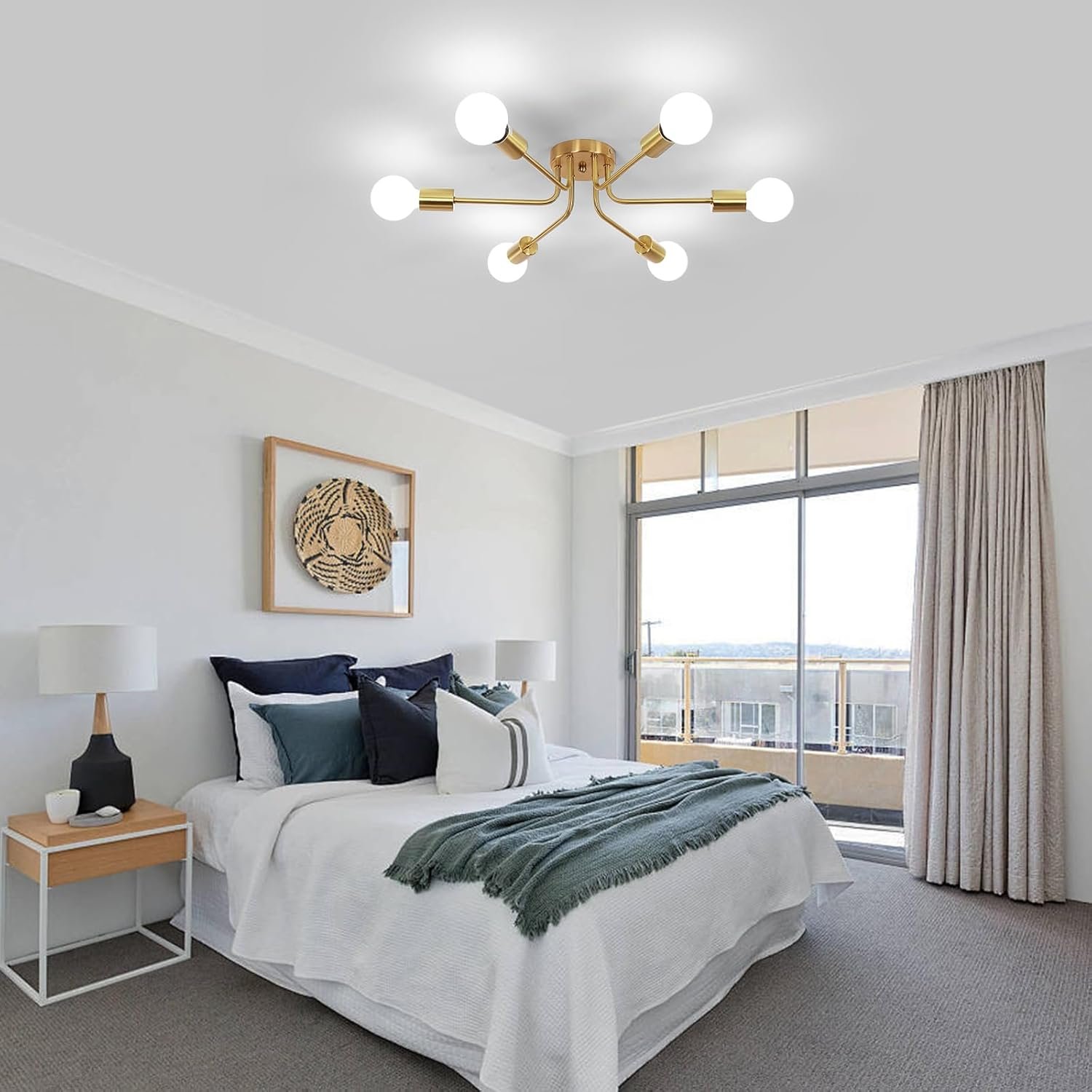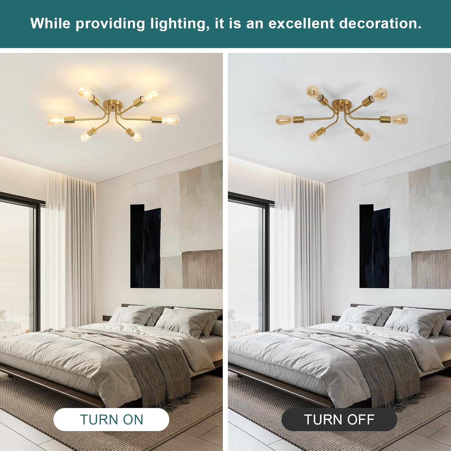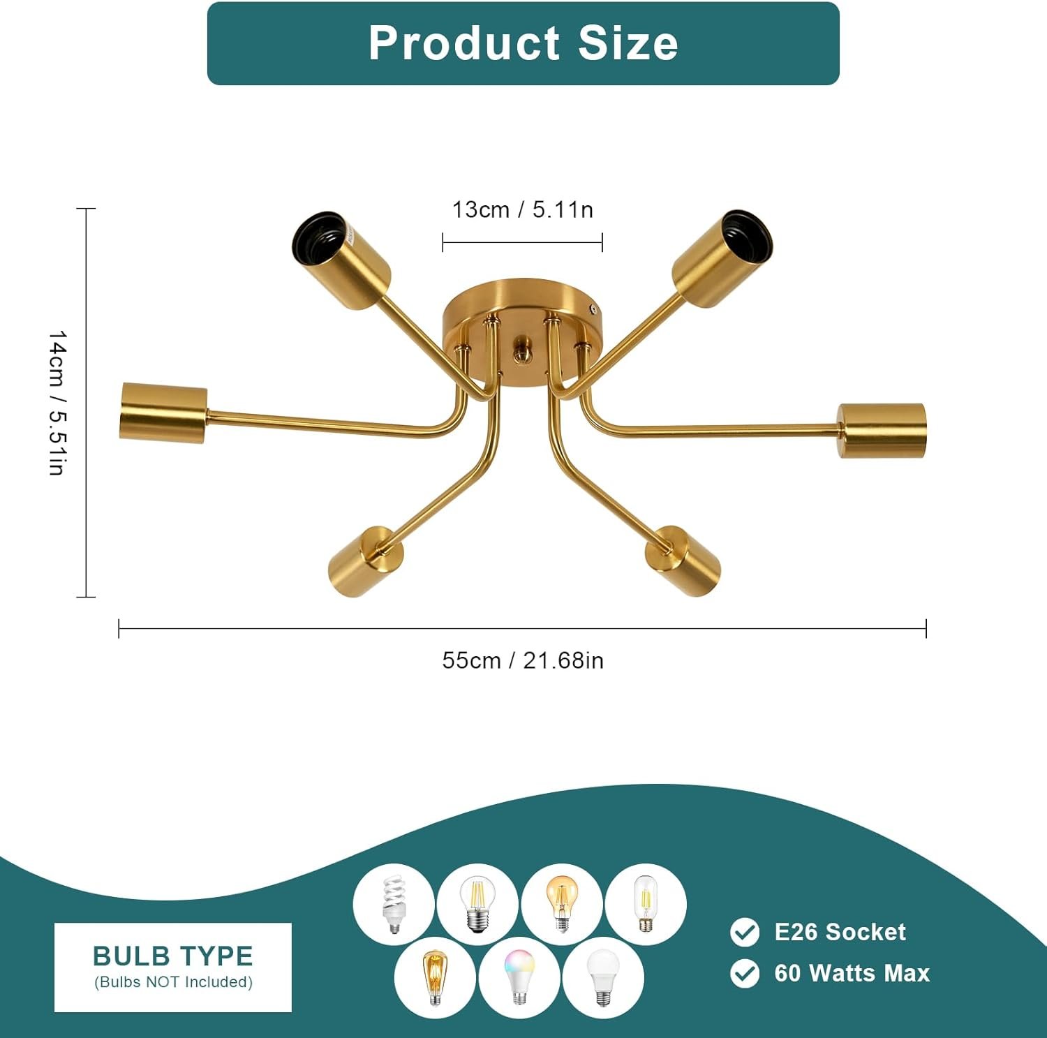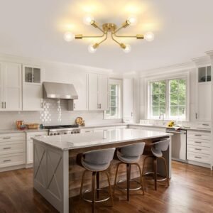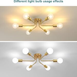 Lámpara moderna : la lámpara DELIPOP Sputnik cuenta con 6 cabezales de lámpara, y los brazos de la lámpara se extienden hacia afuera desde la base central, lo que te proporciona una iluminación completa de 360 grados. El cuerpo de la lámpara es completamente dorado y adopta tecnología de galvanoplastia, con un aspecto elegante. Agregará un sentido de moda al espacio de tu hogar. Tamaño y bombillas recomendadas: Tamaño: 55,1 cm de largo x 55,1 cm de ancho x 14,0 cm de alto. La araña dorada es de tamaño moderado y muy hermosa. DELIPOP La lámpara de araña moderna de mediados de siglo requiere 6 casquillos E26, compatible con bombillas Edison/LED/incandescentes, etc. El uso de diferentes temperaturas de color y bombillas puede crear un ambiente diferente y maravilloso. Bombillas no incluidas Amplios escenarios aplicables: la lámpara de techo DELIPOP Sputnik es adecuada para tu cocina, comedor, sala de estar, dormitorio, estudio y vestíbulo. Su diseño minimalista está lleno de sentido de la moda, añadiendo capas de belleza a varios espacios. Fácil y rápida instalación : Todos los brazos de la lámpara de la lámpara de araña de oro DELIPOP están precableados y preroscados. Proporcionamos instrucciones de instalación detalladas y accesorios completos, para que puedas ensamblar y usar fácilmente las luminarias. Servicio posventa: la satisfacción del cliente es nuestra máxima prioridad. Estamos orgullosos de ofrecer una garantía de 48 meses en nuevos productos de reemplazo. Si tienes alguna pregunta, por favor envíanos un correo electrónico y te responderemos dentro de las 12 horas para garantizar una experiencia perfecta. ¡Haga la elección correcta para una iluminación confiable y elegante del hogar!