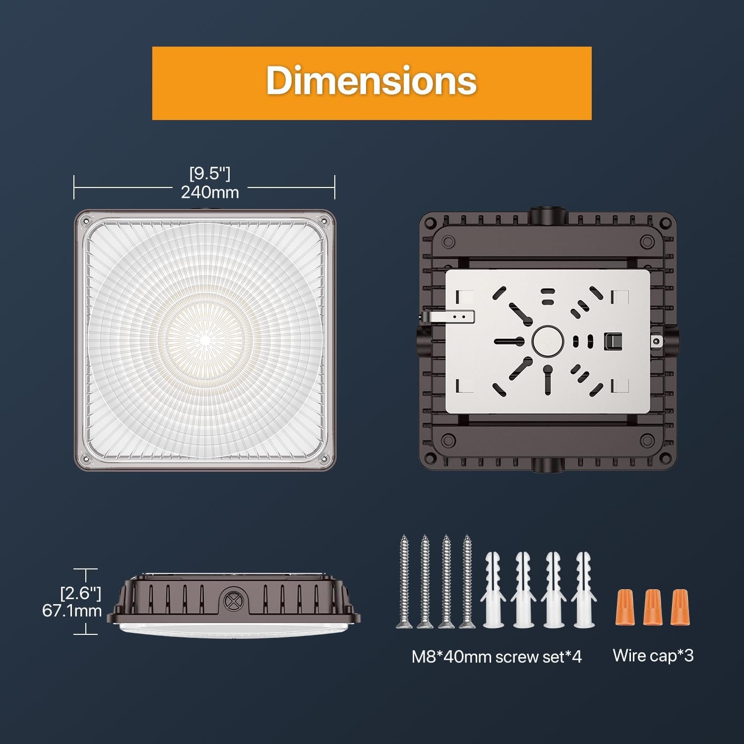 Componentes incluidos: 3 tapas de alambre, Guía del usuario, Juego de tornillos M8 de 1.575 in x 4, Luz LED Caopy