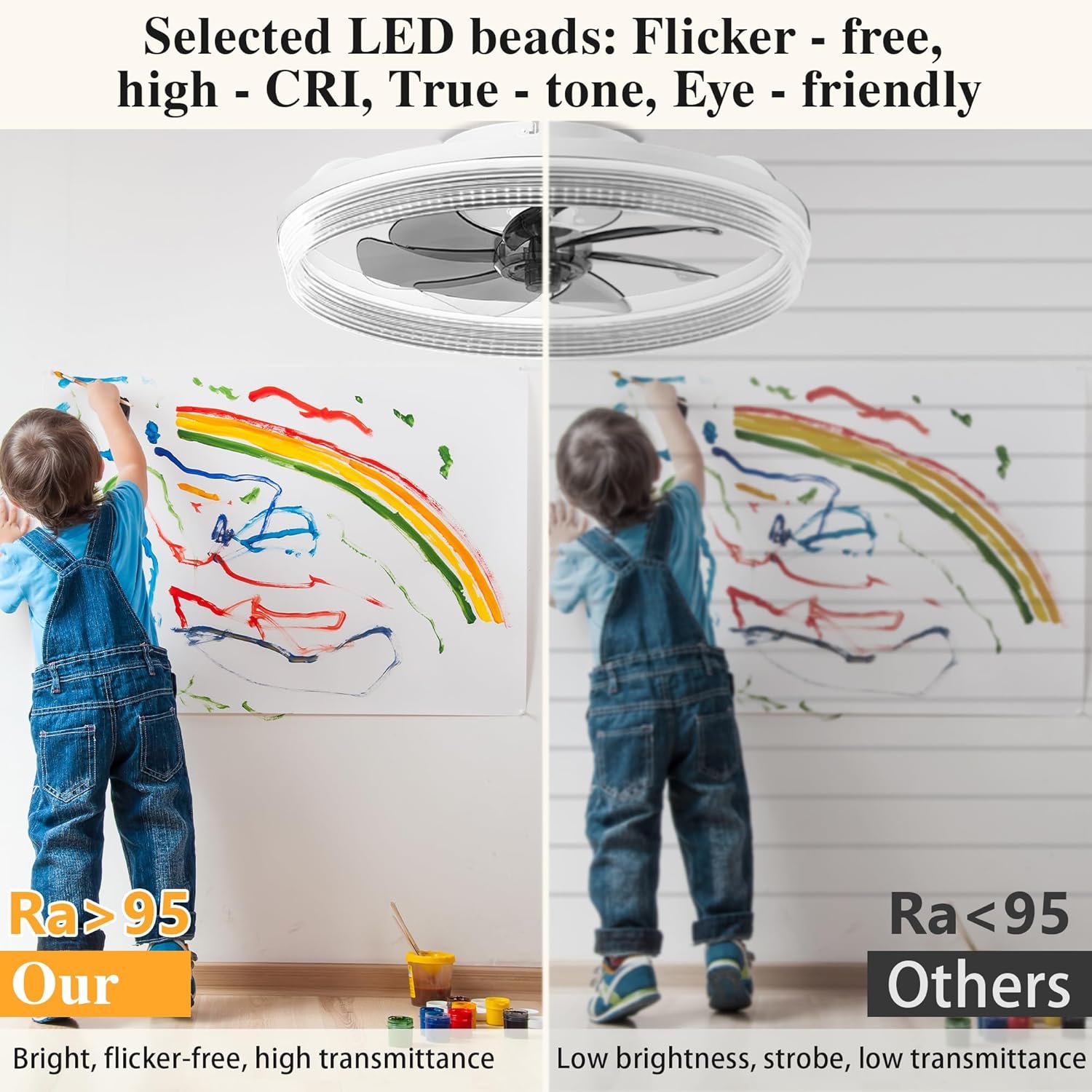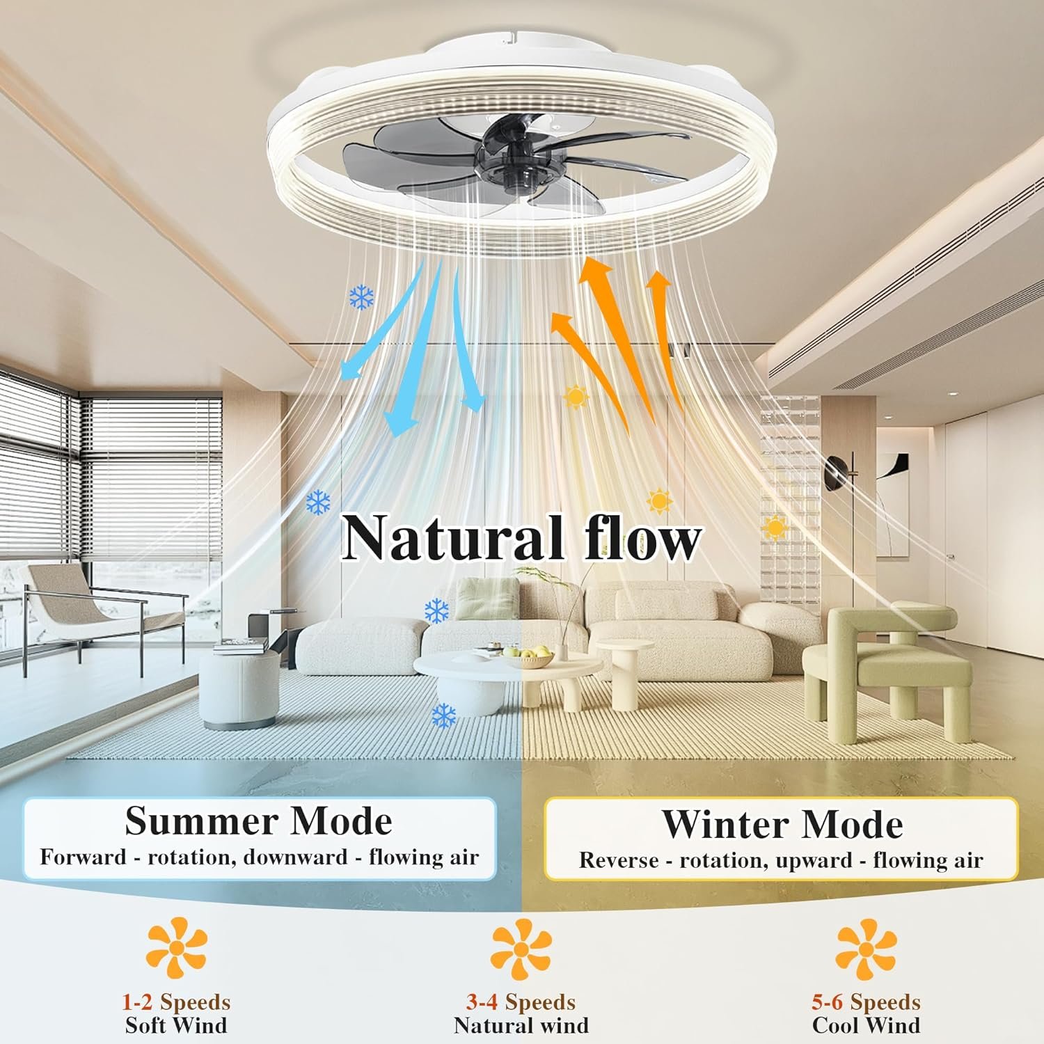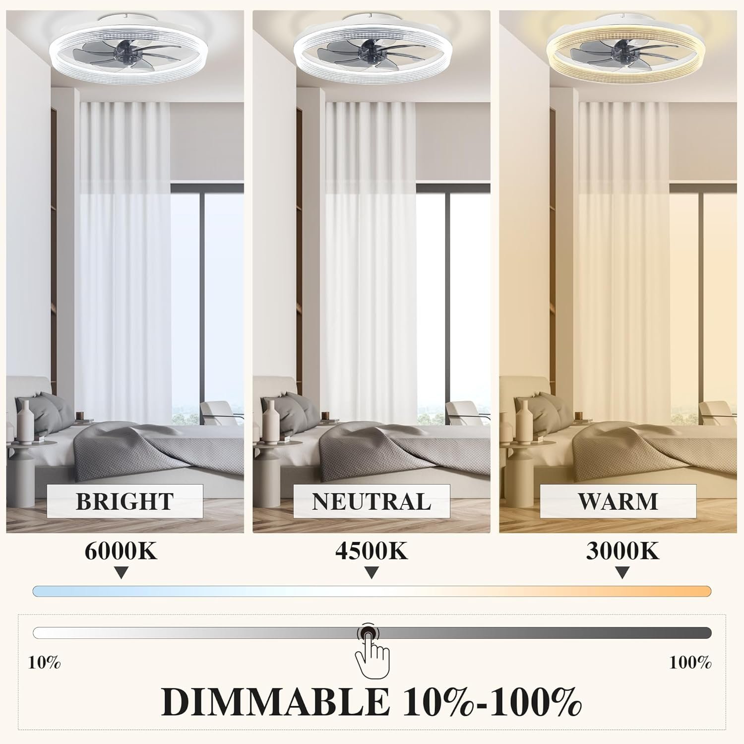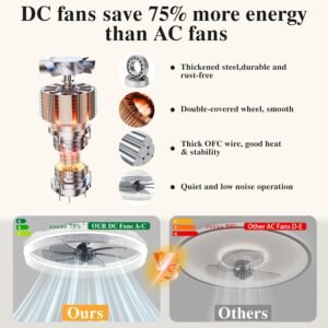 Iluminación LED regulable sin parpadeos: nuestros ventiladores cuentan con iluminación LED de alta calidad con un índice de reproducción cromática (Ra) de más de 95, lo que garantiza una fuente de luz sin parpadeo y amigable con los ojos. Con un brillo máximo de 4320 lúmenes, puedes elegir entre temperaturas de color cálidas (3000K) a frías (6500K) y ajustar el brillo del 10% al 100%. La función de memoria guarda tus ajustes, por lo que tu iluminación preferida se restaura cada vez que enciendes el ventilador. Motor reversible silencioso de cobre puro: nuestro motor de CC de cobre puro cuenta con acero grueso y cable OFC de alta calidad, combinado con una rueda de doble cubierta y un ventilador mejorado de 7 cuchillas. Este diseño garantiza un menor consumo de energía y un mínimo ruido operativo. El motor reversible ofrece seis velocidades de viento. En verano, funciona en modo de corriente descendente para proporcionar aire fresco. En invierno, cambia al modo de corriente ascendente para hacer circular aire caliente, asegurando una circulación óptima del aire y eficiencia energética. Control inteligente con control remoto y aplicación: controla tu ventilador con facilidad utilizando el control remoto incluido o a través de la práctica aplicación. Ajuste la velocidad del ventilador, la iluminación y configure los temporizadores de sueño para crear un entorno personalizado. El ventilador y la luz se pueden controlar de forma independiente, lo que te da un control total sobre tu comodidad. Funcionamiento silencioso y eficiencia energética: experimenta un potente flujo de aire sin el ruido. Nuestros ventiladores cuentan con motores de CC de alta calidad que funcionan sin problemas y silenciosamente, proporcionando un ambiente tranquilo. El diseño de eficiencia energética ayuda a reducir tus facturas de servicios públicos mientras mantiene un fuerte rendimiento. Diseño moderno y soporte integral: mejora la decoración de tu hogar con nuestro elegante diseño de perfil bajo que se adapta perfectamente a cualquier espacio. Nuestros ventiladores son ideales para dormitorios, salas de estar, cocinas y más para garantizar tu satisfacción.