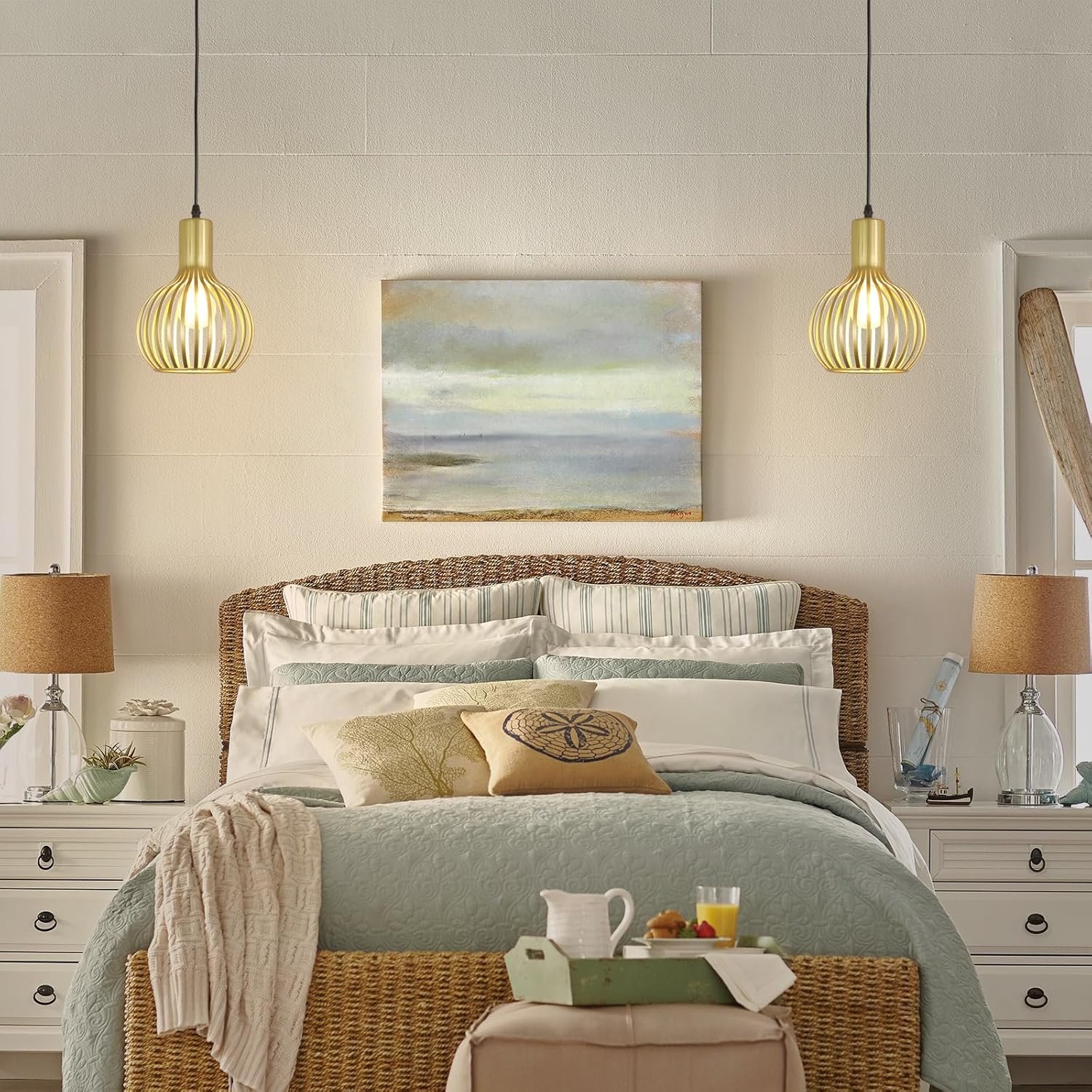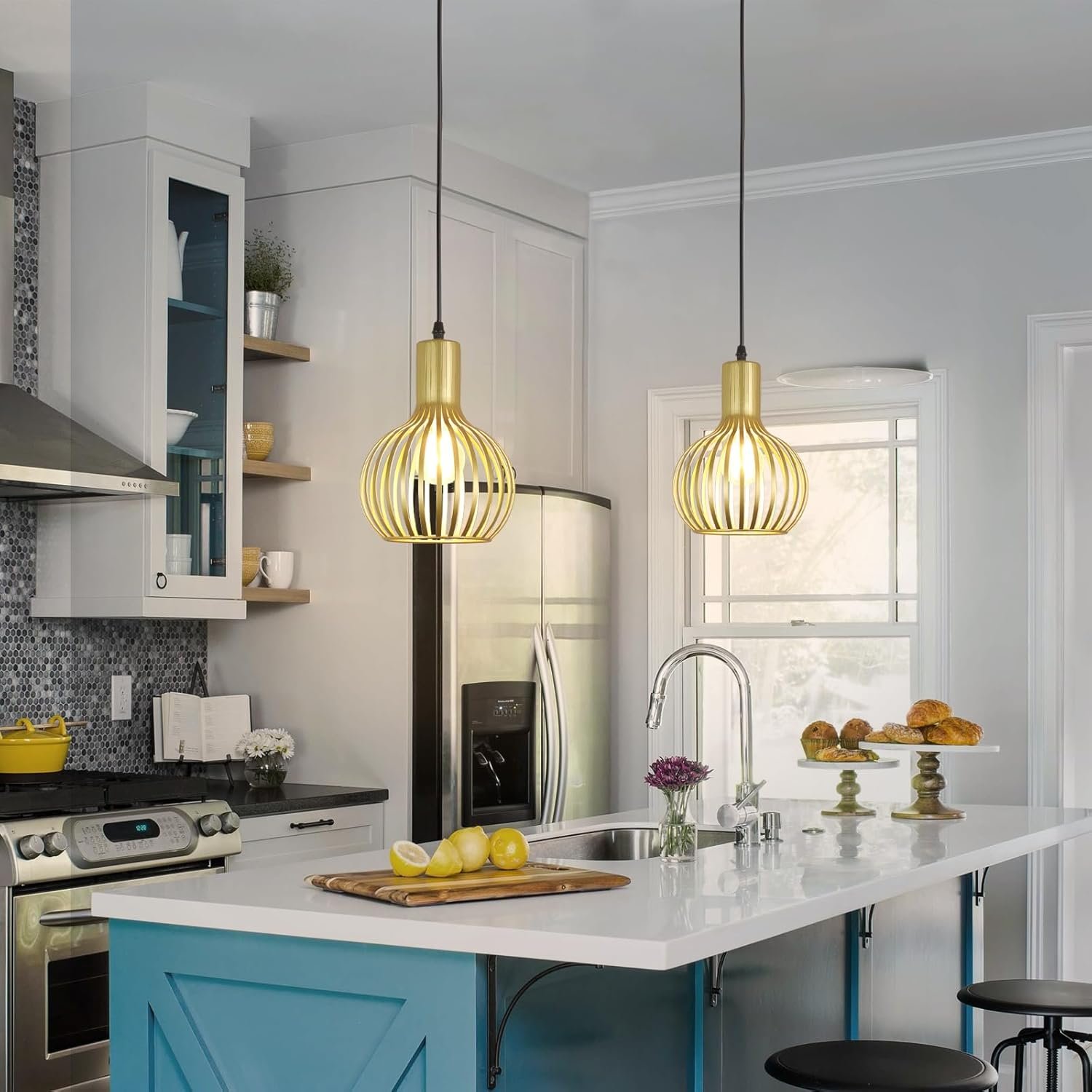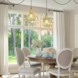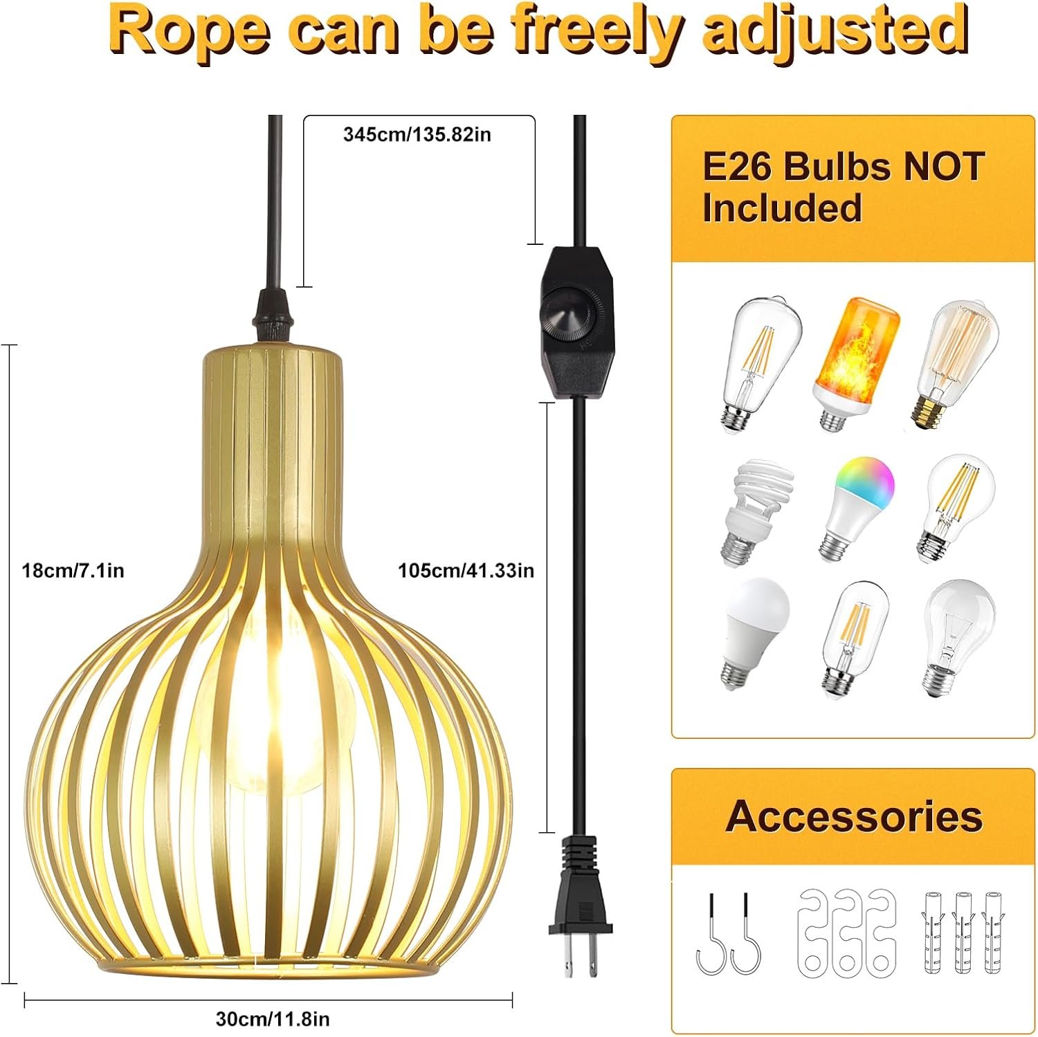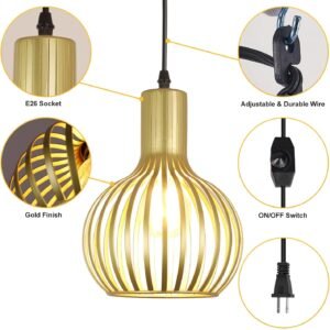 Estilo moderno de granja Con una pantalla de metal tallada hueca de latón, las luces colgantes enchufables rompen el equilibrio visual del espacio. La luz colgante dorada crea un interés decorativo de alto nivel, lo que hace una impresionante adición a cualquier estilo, desde retro, industrial hasta moderno. Longitud ajustable Equipado con un cable de 14.76 pies, las luces colgantes sobre la isla te permiten ajustar libremente la longitud y la posición colgantes sin preocuparte por dónde se coloca la caja de conexiones. El interruptor de encendido/apagado está a unos 3.44 pies de distancia de la toma de corriente, por lo que es perfecto si quieres enchufarlo detrás de un sofá, mesa o mesita de noche. Fácil instalación: la pantalla de la lámpara colgante dorada mide 18,0 cm de diámetro y 27,0 cm de altura. La luz colgante con enchufe incluye todos los accesorios e instrucciones necesarios para una instalación rápida y fácil. Estas lámparas colgantes para sala de estar utilizan enchufes estándar E26, máximo 60 W. Las luces colgantes son compatibles con LED, bombillas Edison, CFL, etc. Se puede atenuar cuando se utiliza una bombilla regulable y un regulador de intensidad (bombilla y regulador de intensidad no incluidos). Amplias aplicaciones: la iluminación colgante de granja se puede colgar de un techo inclinado o abovedado, lo que es más acento o iluminación ambiental. Perfecto para isla de cocina, comedor, sala de estar, restaurante, estudio, dormitorio, entrada, pasillo, bar, oficina, etc. Garantía de satisfacción Las modernas luces colgantes con jaula de metal proporcionan 12 meses de garantía. Nos centramos en mejorar la experiencia de compra para nuestros clientes. Si no estás satisfecho con nuestras lámparas colgantes, no dudes en ponerte en contacto con nosotros.