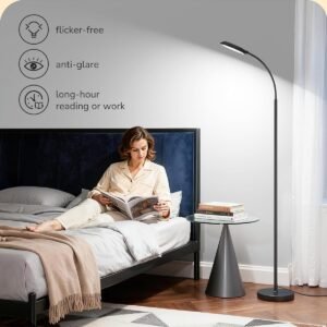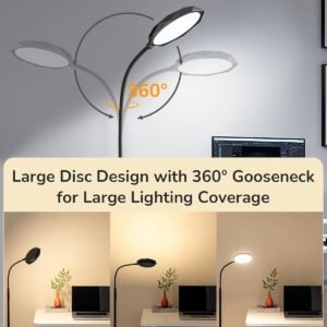 Iluminación brillante y cómoda Con 1300 lúmenes de brillo y 4 temperaturas de color ajustables (2700 K 6500 K), esta lámpara de pie LED moderna ofrece una iluminación diversa, desde acogedoras salas de estar hasta oficinas en casa enfocadas; la atenuación sin niveles (10% 100%) te permite ajustar la luz para adaptarla a tu estado de ánimo o tarea Control remoto y táctil No es necesario salir de la comodidad de tu cama o sofá: controla la lámpara de pie regulable desde cualquier parte de la habitación con el control remoto, o simplemente toca el interruptor para cambios rápidos de brillo y color; simple, intuitivo y diseñado para la vida moderna [Establece el temporizador para una vida reflexiva] Ajusta el temporizador a 30 o 60 minutos, se apaga automáticamente, para leer a la hora de dormir, habitaciones de los niños o hora de lactancia; una lámpara de pie cariñosa con control remoto que ayuda a las madres y los niños a conciliar el sueño tranquilamente sin preocuparse de que la luz permanezca encendida toda la noche Brazo flexible de cuello de cisne: el cuello de cisne ajustable en 360° y el poste de altura ajustable ofrecen una flexibilidad inigualable; esta lámpara de pie alta te permite dirigir fácilmente la luz exactamente donde la necesites, leer en tu silla favorita o centrarte en el trabajo detallado en tu escritorio Modos de escena de un solo toque: cambia instantáneamente entre cuatro modos preestablecidos: lactancia materna, trabajo, luz nocturna y lectura, para obtener la iluminación perfecta sin ajuste constante de esta lámpara de pie; iluminación a medida para cada parte de tu día, todo en una lámpara elegante