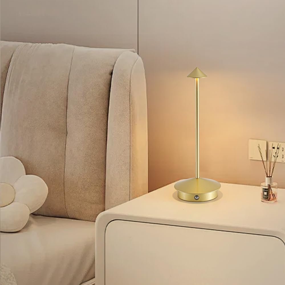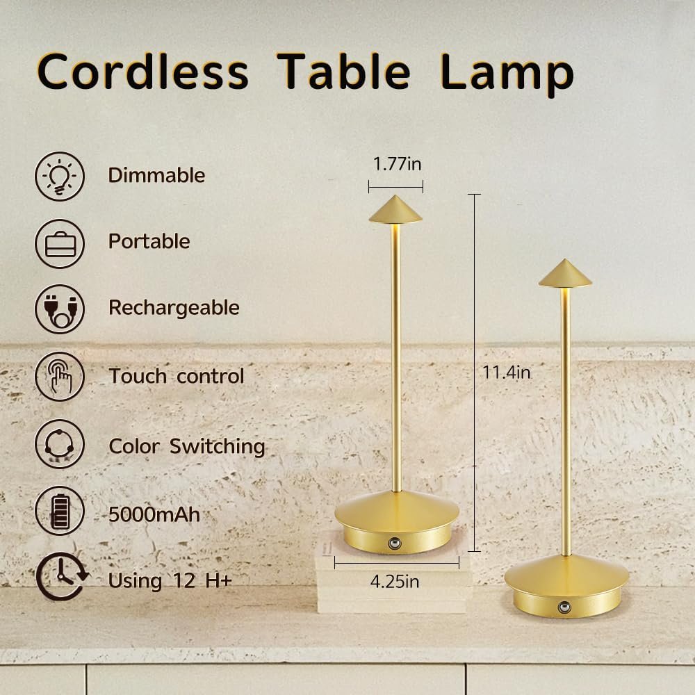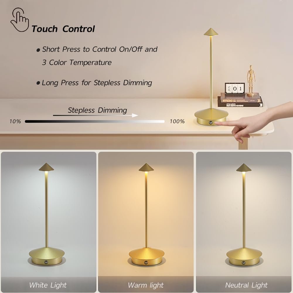 Lámpara inalámbrica portátil, libre de cables El diseño inalámbrico simple dice adiós al problema de los cables enredados. Puede moverlo a cualquier lugar donde se necesite. Además, tiene una forma elegante, simple y flexible y ocupa poco espacio. Es muy adecuado para su uso durante la lectura, el trabajo, el estudio o el descanso, y se puede colocar en lugares como mesas de comedor, dormitorios, salas de estar, mesitas de noche, terrazas, bares y sitios de acampada. Es adecuado para combinar con varios estilos de decoración del hogar. Batería de 5000 mAh con gran capacidad, larga duración de la batería Está equipado con una batería recargable de gran capacidad de 6000 mAh. El tiempo de carga es de 4 a 5 horas. Se puede utilizar durante aproximadamente 8 a 20 horas en el estado más brillante y aproximadamente 24 a 48 horas en el estado más oscuro, eliminando así la ansiedad por la duración de la batería. Colocada junto a la cama, se puede usar cuando te levantas por la noche, proporcionándote una luz suficiente pero no molesta. Colocado en una fiesta en el patio, puede crear instantáneamente un ambiente cálido y de alta gama. También se puede colocar en el comedor o en cualquier otro lugar donde se necesite. Control táctil inteligente, ilumina la vida Esta lámpara de mesa está diseñada con un conveniente interruptor táctil. Una pulsación suave puede cambiar entre 3 modos de iluminación. Las temperaturas de color son 3000K, 4000K y 5000K. Al presionar prolongadamente, puede ajustar el brillo de acuerdo con el entorno en el que se encuentre. Esta lámpara puede satisfacer tus diferentes necesidades de iluminación y crear una experiencia de iluminación personalizada para ti. Cuerpo de aluminio, impermeable IP54 para exteriores El cuerpo de la lámpara está hecho de material de aluminio con una superficie pintada para evitar la oxidación. La lámpara de mesa dorada/plateada utiliza un proceso de galvanoplastia en la superficie para crear una textura suave y delicada. La pantalla de la lámpara está hecha de material acrílico, que tiene buena transmisión de luz, es suave para los ojos y proporciona una transmisión de luz más suave. La base está equipada con almohadillas antideslizantes para evitar volcamientos accidentales, y se puede utilizar tanto en interiores como en exteriores. Servicio posventa sin preocupaciones Esta moderna lámpara de mesa LED presenta un diseño elegante, materiales gruesos y es tanto práctica como decorativa. Si tienes algún problema durante el uso, ponte en contacto con nosotros. Estamos encantados de resolverlos por usted.