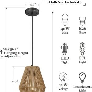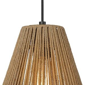 Serie tejida bohemia: diseño geométrico minimalista que se une a tejido natural a mano, esta lámpara colgante es un complemento perfecto para un estilo minimalista, moderno, tradicional y bohemio. El colgante ELYONA de 17,8 cm funciona fabulosamente en cocinas, comedores, tu pasillo o vestíbulo, restaurante. Aporta la sensación del aire libre, personifica la sensación serena de un ambiente cómodo. Y añade textura natural a cada espacio vital. Dimensiones pequeñas y altura ajustable Dimensiones: máx. 142,2 cm de alto x 17,8 cm de ancho x 17,8 cm de profundidad. Toldo de techo: diámetro. 10,9 cm. Los cables están incluidos para ajustar la altura. Esta lámpara colgante se puede instalar a cualquier altura del techo y bisel. Regulable, requisitos de bombilla y certificación ETL: toda la iluminación ELYONA está lista ETL y cumple con los estándares UL de 120 voltios para seguridad y calidad. Se recomienda la instalación profesional para todas las lámparas colgantes. Utiliza cualquier bombilla LED/CFL/Edison u otras bombillas de menos de 40 W con base E26. Cuando utilices regulador de intensidad y bombilla regulable se puede atenuar. Bombillas no incluidas. Pantalla de cordel natural Un sofisticado acabado marrón mate complementa la cuerda de yute natural tejida a mano, filtrando la luz desde el interior, cada pieza crea un juego de luz y sombra en una habitación, añadiendo un ambiente acogedor. Prestamos atención a los detalles y utilizamos solo material de la más alta calidad. Aporta textura natural y calidez a cualquier entorno con ELYONA Pendant. Basado en la fabricación de iluminación más confiable y profesional durante más de 14 años. Ofrecemos una garantía completa de un año para ofrecerte una experiencia de compra de gran valor. Valoramos los materiales y compartimos diseños que están en sintonía con las leyes de la naturaleza. Si tienes alguna pregunta, ponte en contacto con nosotros a través del cuadro de mensaje de Amazon.