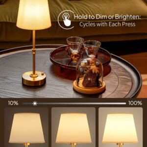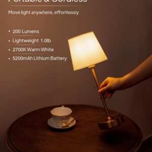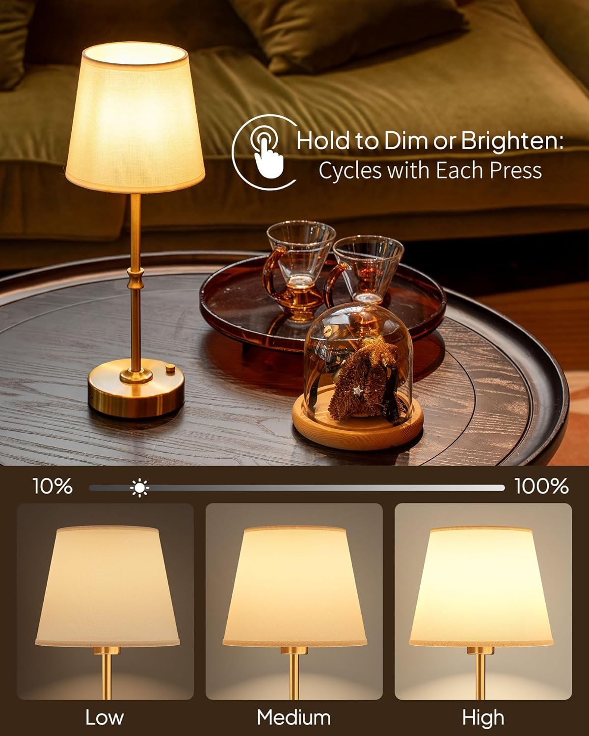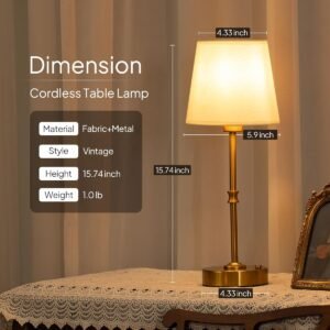 Duración de larga duración para momentos compartidos: alimentada por una batería de 5200 mAh, esta lámpara inalámbrica ofrece hasta 12-45 horas de iluminación. Perfecto para cenas familiares, noches relajantes o reuniones, crea un ambiente cálido y proporciona una iluminación confiable Carga rápida de 1.5 horas para un uso sin esfuerzo: la lámpara de mesa recargable cuenta con tecnología avanzada de carga rápida de 18 W, restaurando la potencia total en solo 1.5 horas. La recarga rápida minimiza el tiempo de inactividad y proporciona una iluminación cálida e ininterrumpida cuando más lo necesites Comodidad portátil e inalámbrica: con un peso de solo 1.0 libras, esta lámpara portátil está diseñada para una movilidad sin esfuerzo. Su diseño sin cables te permite llevarlo desde la sala de estar hasta el patio, el patio trasero o cualquier rincón de tu hogar. Disfruta de una iluminación sin complicaciones: sin enchufes, sin límites, solo pura libertad Atenuación continua para comodidad en el dormitorio: Ajusta el brillo del 10% al 100% con atenuación continua para crear el cálido resplandor de 2700K perfecto para tu dormitorio. La función de memoria recuerda tu última configuración, proporcionando una luz consistente y relajante para relajarte o prepararte para dormir Mezcla de diseño vintage con decoración del hogar: fabricada con una base de latón antiguo y pantalla de tela, esta lámpara dorada vintage agrega elegancia atemporal a cualquier hogar. Emite luz cálida de 360° que mejora la atmósfera. Perfecto para comedor, sala de estar, dormitorio y decoración del hogar Calidad confiable y soporte receptivo: Construida con materiales duraderos y probada según altos estándares, esta lámpara está diseñada para un uso duradero. Con el apoyo confiable de EppieBasic, nuestro equipo responde en 24 horas, dándote tranquilidad e iluminación confiable para tu hogar