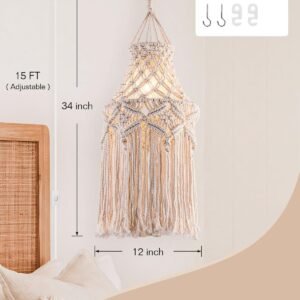 Lámpara colgante boho : Nuestra lámpara colgante boho enchufable con cable de enchufe, elegante lámpara boho que emite una luz suave y equilibrada, viene con ganchos de techo. Cable de enchufe con certificación UL, más seguro y confiable. (Bombilla no incluida) Lámpara colgante de macramé : ¡Esta hermosa pantalla de lámpara de macramé es hecha a mano con cuerda de algodón natural y la luz colgante boho está hecha de hilo de algodón de 5 mm para una sensación relativamente mejor. ¡Es perfecta para la decoración boho del dormitorio y la sala de estar, calienta la habitación! Tamaño : lámpara colgante de macramé con cable enchufable, el diámetro del anillo más grande es de 30,5 cm, la altura desde el anillo superior hasta la borla más larga es de 86,4 cm. La longitud del cable de alimentación enchufable es de 459,7 cm. (Ajustable) Decoración perfecta : Se vería muy bien para un tema de decoración boho. La pantalla de lámpara colgante bohemia es adecuada para el dormitorio, sala de estar. ¡Esto sería un regalo hermoso y práctico para el dormitorio bohemio de tu hija, que le encantará! Compra sin preocupaciones: prometemos una política de devolución y reembolso del 100% para lámparas colgantes que cumplen con los estándares. Si tiene alguna sugerencia y pregunta. No dude en ponerse en contacto con nosotros.