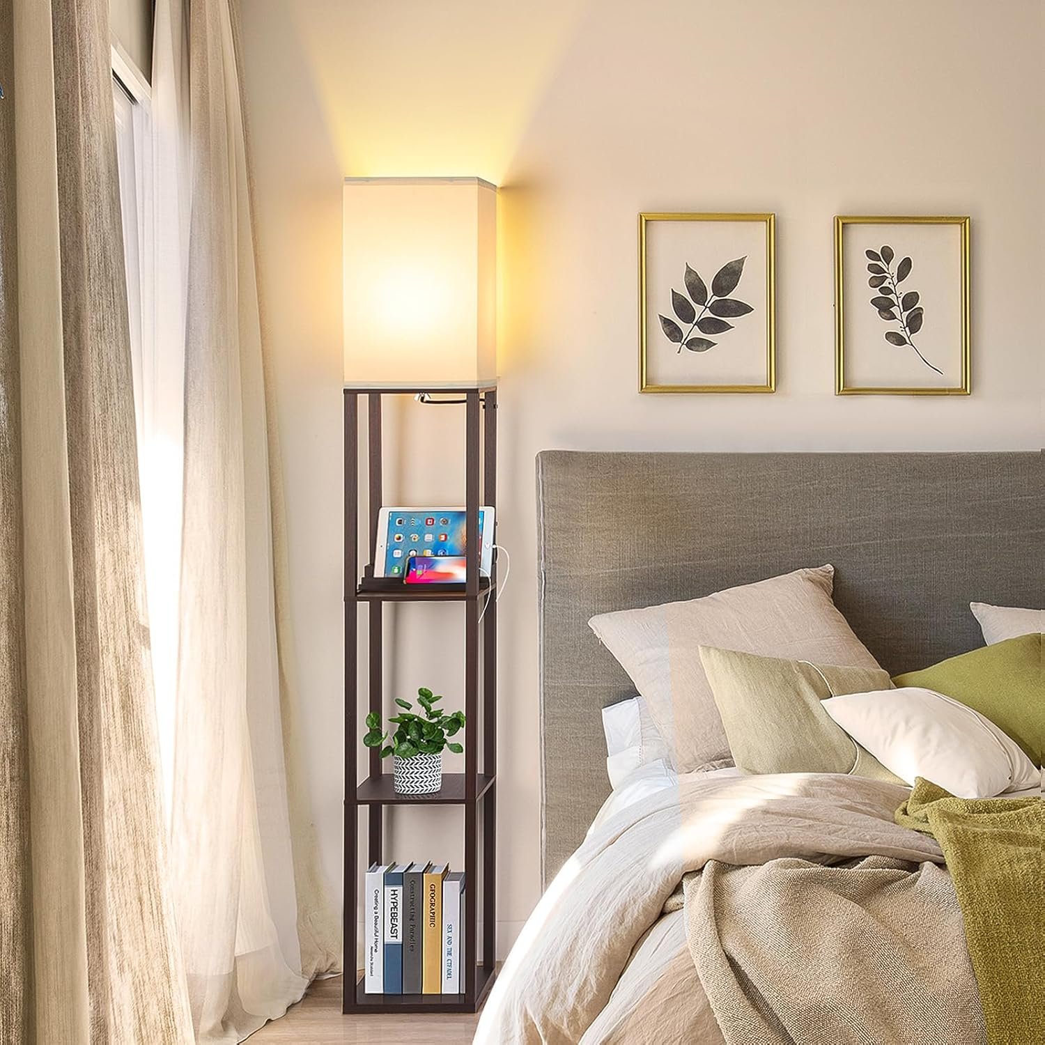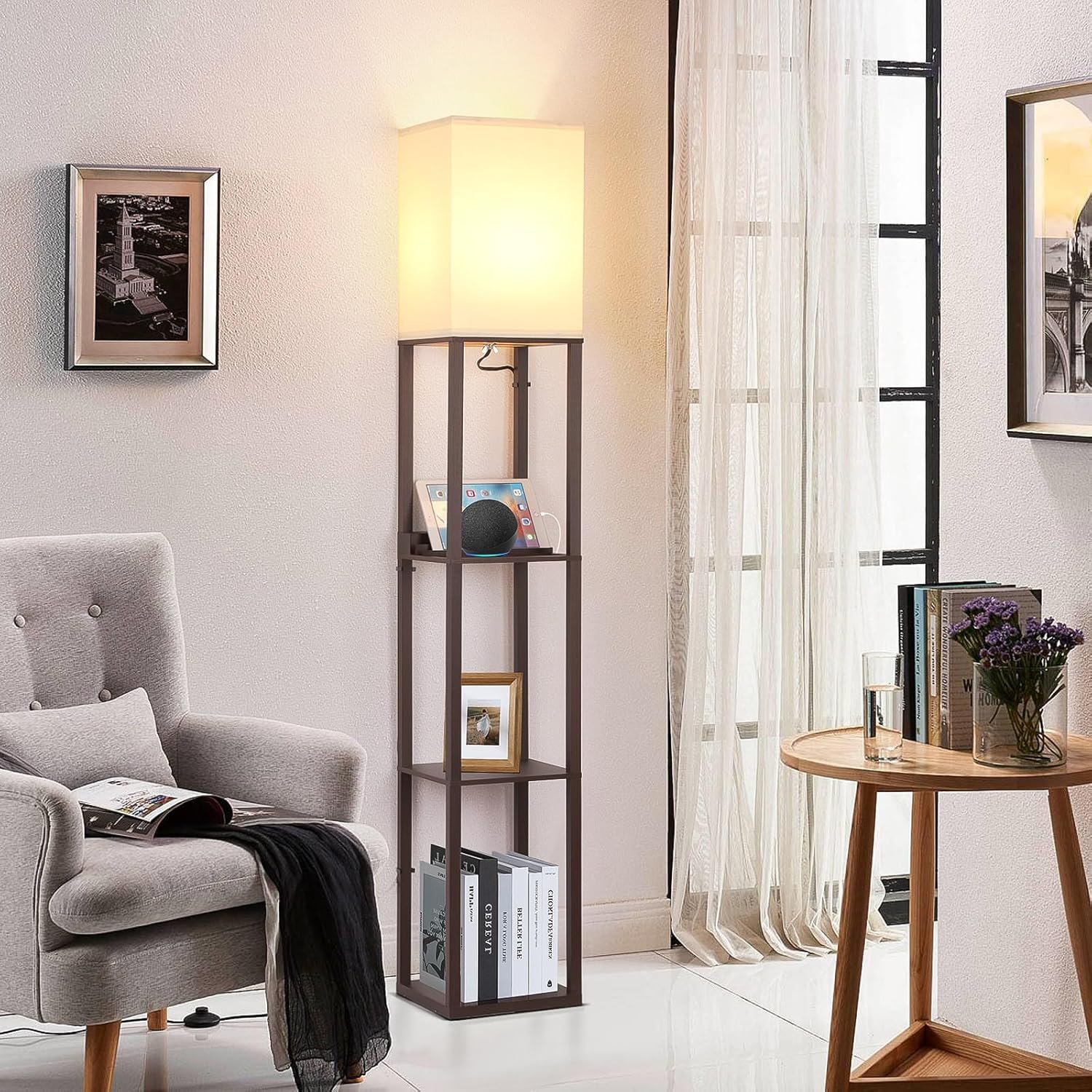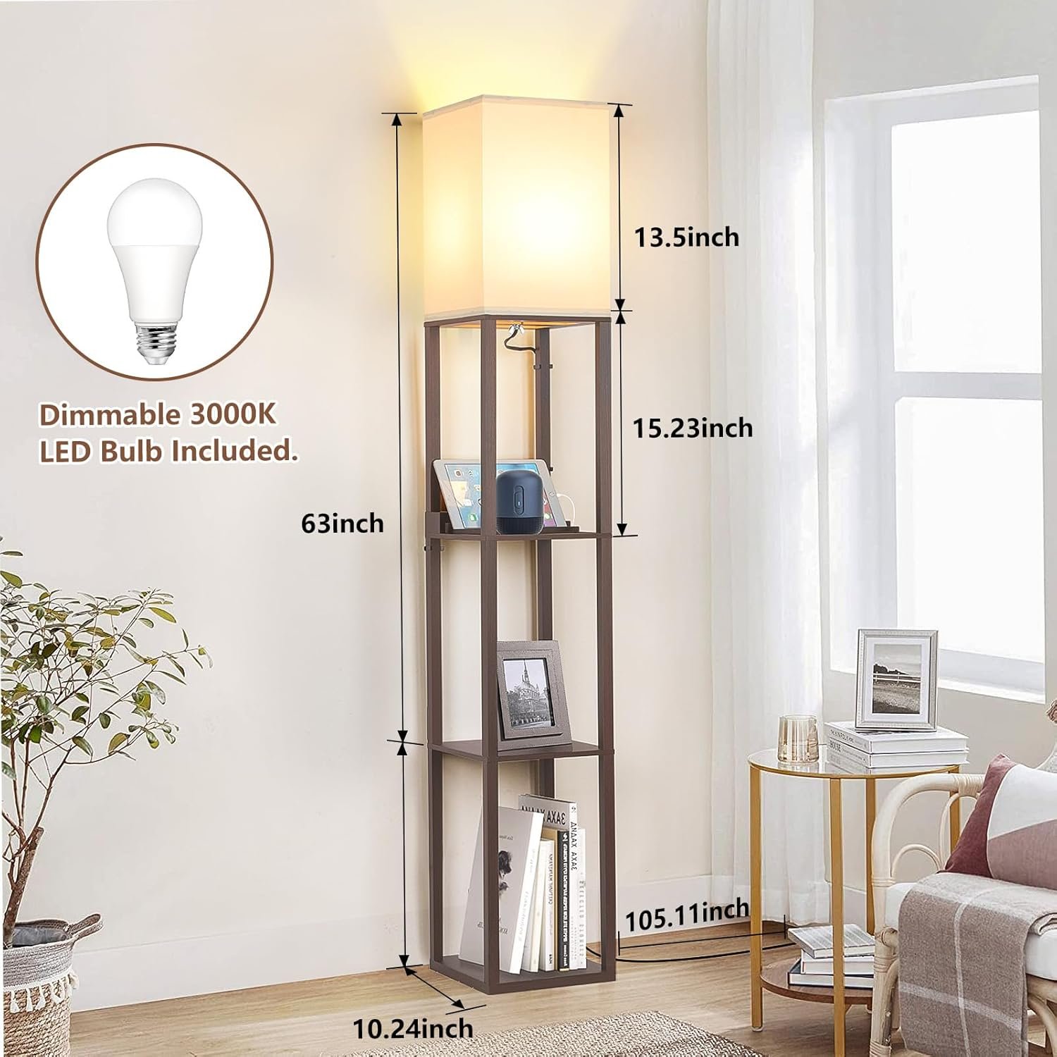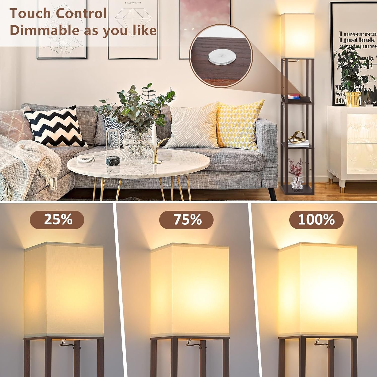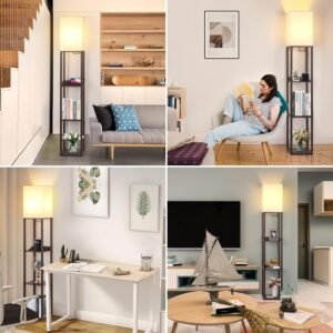 Lámpara de pie de estante moderna 3 en 1: La suave pantalla de luz de tela TC y el marco de madera resistente chocan con las chispas de la moda, este diseño complementa cualquier decoración de la habitación, como moderna, rural, de granja, etc. Esta lámpara de pie con estante es una combinación única con el estante de almacenamiento, estación de carga y lámpara de pie LED. Control táctil regulable de 3 vías: La parte más personalizada de esta lámpara de pie de estante para la sala de estar es la función de control táctil regulable de 3 vías (suave, natural, alta). Con solo tocar el botón, esta lámpara de mesa de noche puede satisfacer todas tus necesidades, ya sea para la guardería, la luz nocturna o la lectura. Con la base E26 más común (MÁX 100 W) y una bombilla regulable de 3000 K, esta lámpara de pie no es compatible con bombillas inteligentes ni control por voz. Lámpara de pie mejorada con puertos USB y toma de corriente: Esta lámpara de pie autoportante viene con dos puertos USB de carga rápida de 5V/2A adicionales y una toma de corriente. Puede cargar su teléfono y tableta en cualquier momento y en cualquier lugar. Las ranuras para que el teléfono y la tableta descansen para que no haya posibilidades de que se caigan accidentalmente y se rompan, simplemente disfrutando de la comodidad de la vida. Libertad de exhibición y espacio de almacenamiento: con estantes de 3 niveles y 160,0 cm de altura, esta moderna lámpara de pie te brinda más espacio para colocar tus cosas junto a tu cama, sofá o cualquier rincón que desees usar, perfecta para almacenamiento de acceso rápido (control remoto de TV, teléfonos, tabletas, libros) y para exhibir tus fotos familiares, jarrones y obras de arte. Nota: coloca el artículo más pesado (15 libras máximo) en la parte inferior para mantener el equilibrio.