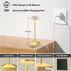 Diseño de atmósfera minimalista El aspecto elegante y compacto de esta lámpara de mesa mejora la estética de tu hogar. Está específicamente diseñado para espacios pequeños, creando una atmósfera cómoda y romántica. Su peso ligero lo convierte en la luz ideal para mesita de noche, camping, cocinas, comedores, etc. Lámpara Pequeña Recargable y Portátil Hemos construido una batería recargable en la lámpara inalámbrica, que puede ayudarte a ahorrar el costo de comprar baterías AA. Soporte de lámpara de plástico de estructura cerrada, cuerpo de lámpara de aleación de aluminio fundido con recubrimiento en polvo mate. Con las características multifuncionales como portátil, recargable, duradera, es la mejor lámpara de mesa con función y decoración tanto para escenas interiores como exteriores. Atenuación táctil y fácil operación Hemos incorporado una batería recargable en la lámpara inalámbrica, lo que puede ayudarte a ahorrar en el costo de comprar pilas AA. Puedes controlar fácilmente el encendido/apagado de la luz o el ajuste de brillo según tus necesidades. Con la configuración muy tenue, es buena para ser una luz nocturna para la mesita de noche, mientras que con la configuración brillante, también es una bonita decoración para el alféizar de la ventana de la sala de estar, pasillo y balcón, o como un suplemento de luz diaria para el trabajo. Puerto de carga USB-C universal Utilizamos un puerto de carga USB-C universal, que se puede conectar en ambos lados. Perfectamente compatible con otros cables de carga de dispositivos móviles inteligentes. Ya no tendrás que preocuparte por no encontrar el cable de carga original. El indicador de carga se volverá rojo cuando se esté cargando y se volverá verde después de estar completamente cargado. 5 estrellas de atención al cliente Nuestra lámpara de mesa está diseñada para mejorar tu experiencia diaria. Lograr un espacio bellamente iluminado es sin esfuerzo con su fácil proceso de instalación. Respaldamos la calidad de nuestra lámpara y ofrecemos una garantía tranquilizadora. Si tiene alguna inquietud, no dude en comunicarse con nosotros en cualquier momento.