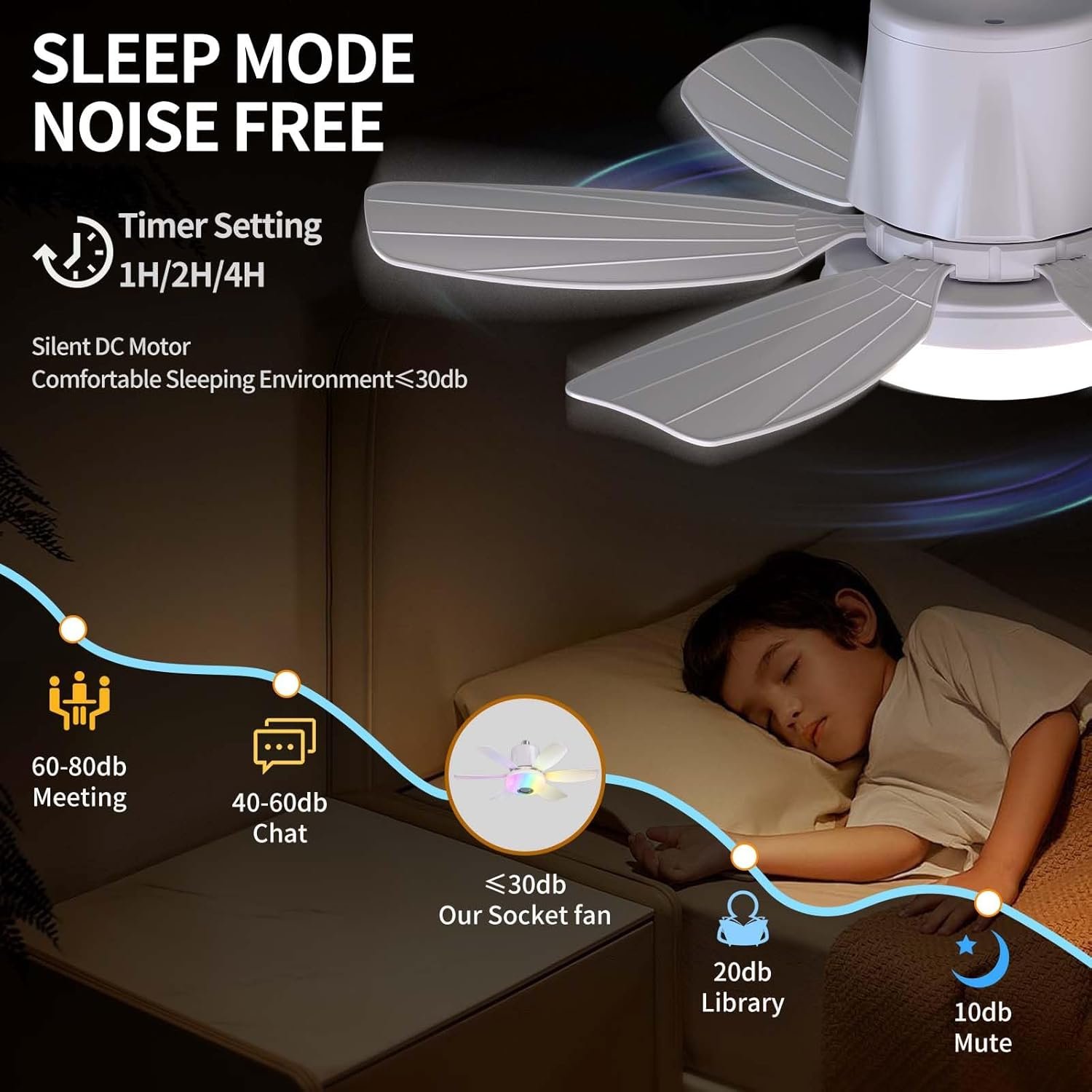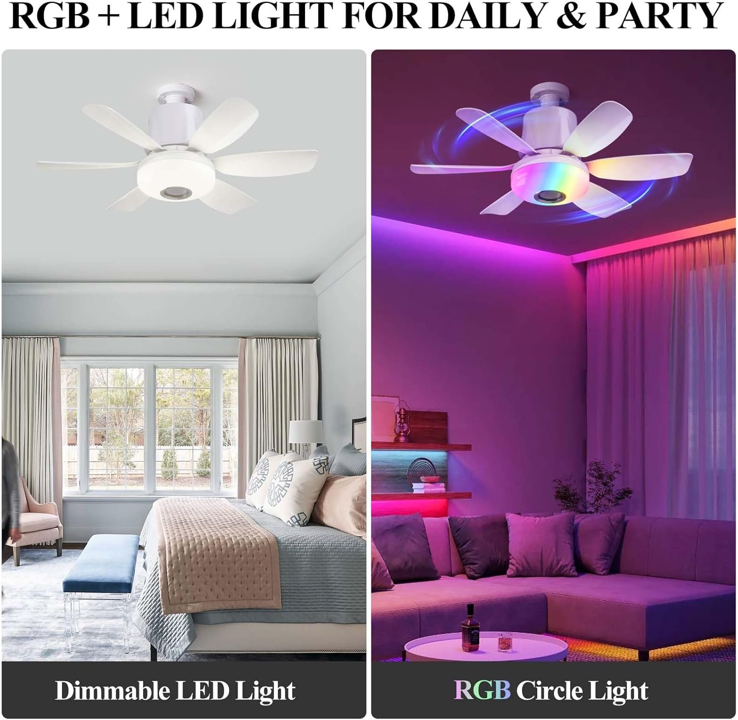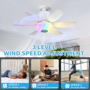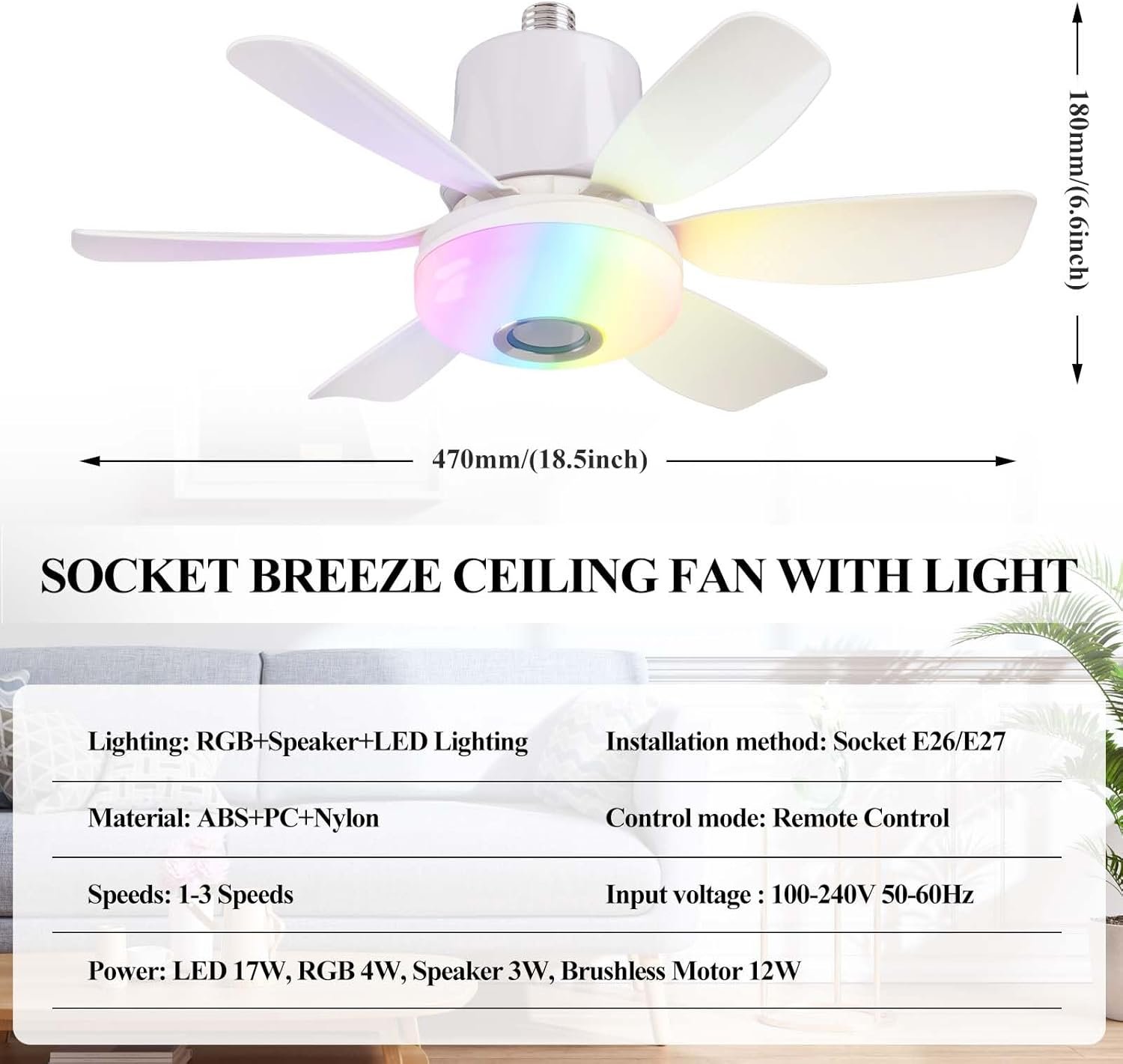 Luz de ventilador de enchufe 4 en 1 : esta luz de ventilador combina un ventilador de techo y una bombilla LED ultra brillante en una unidad para iluminar y hacer circular el aire en una habitación. Las funciones de luz y ventilador se pueden controlar de forma independiente, eliminando la necesidad de productos separados. Además, está equipado con un modo Bluetooth. Conecta tu teléfono al ventilador de techo con luces para reproducir música y añade un elemento entretenido a tu vida. Este ventilador de techo con luz es adecuado para una habitación infantil, sala de estar, dormitorio, cocina, ático, etc. 3 colores + 3 modos RGB y luz regulable: ya sea que lo necesites para el uso diario o para crear un ambiente, esta luz de ventilador satisfará tus necesidades. En condiciones normales, el ventilador de enchufe de luz tiene tres colores que van desde 3000K a 6500K. Con su función única de cambio de color RGB, que se puede ajustar con un control remoto, puedes cambiar la atmósfera de tu entorno interior como quieras. También agregamos una función de ritmo RGB que hace que las luces RGB bailen a la melodía del altavoz Bluetooth. Ventilador de 3 velocidades + 3 funciones de temporizador y modo de suspensión: este ventilador de techo con luz y control remoto ofrece tres velocidades de viento ajustables. La luz del ventilador con control remoto tiene tres velocidades de viento ajustables, por lo que puedes elegir el flujo de aire perfecto para tu comodidad. Además, la luz del ventilador viene con un control remoto inteligente con modos de sueño y temporizador para una experiencia de sueño cómoda. El modo de suspensión preestablecido permite atenuación de un solo toque, y el temporizador de 1, 2 o 4 horas permite el apagado automático para ahorrar energía y mejorar la calidad del sueño. Luz de ventilador con altavoz Bluetooth : el altavoz Bluetooth de este ventilador de techo musical proporciona un sonido estéreo de alta calidad. Toca música en la cena y relájate. Instálelo en una habitación infantil y reproduzca música o cuentos de buenas noches mientras su hijo se duerme. El altavoz Bluetooth integrado te permite cambiar canciones, pausar y controlar el volumen a través del teléfono o el control remoto. Después del emparejamiento inicial, se vuelve a conectar automáticamente al inicio. Tamaño y fácil instalación: este ventilador de techo tiene las siguientes dimensiones: 47,0 cm x 47,0 cm x 16,8 cm desde la punta de la hoja hasta la punta de la hoja, y pesa solo 1.4 libras. Este ventilador de techo se conecta a una toma de luz E26/E27 e incluye un extensor de enchufe, por lo que es fácil de instalar y quitar donde y cuando quieras, es tan fácil como instalar y quitar una bombilla normal. Asegúrate de que las ranuras de las aspas del ventilador estén completamente asentadas en el cuerpo de la lámpara al insertarlas. Por lo general, escuchará un ruido sordo cuando estén completamente sentados.