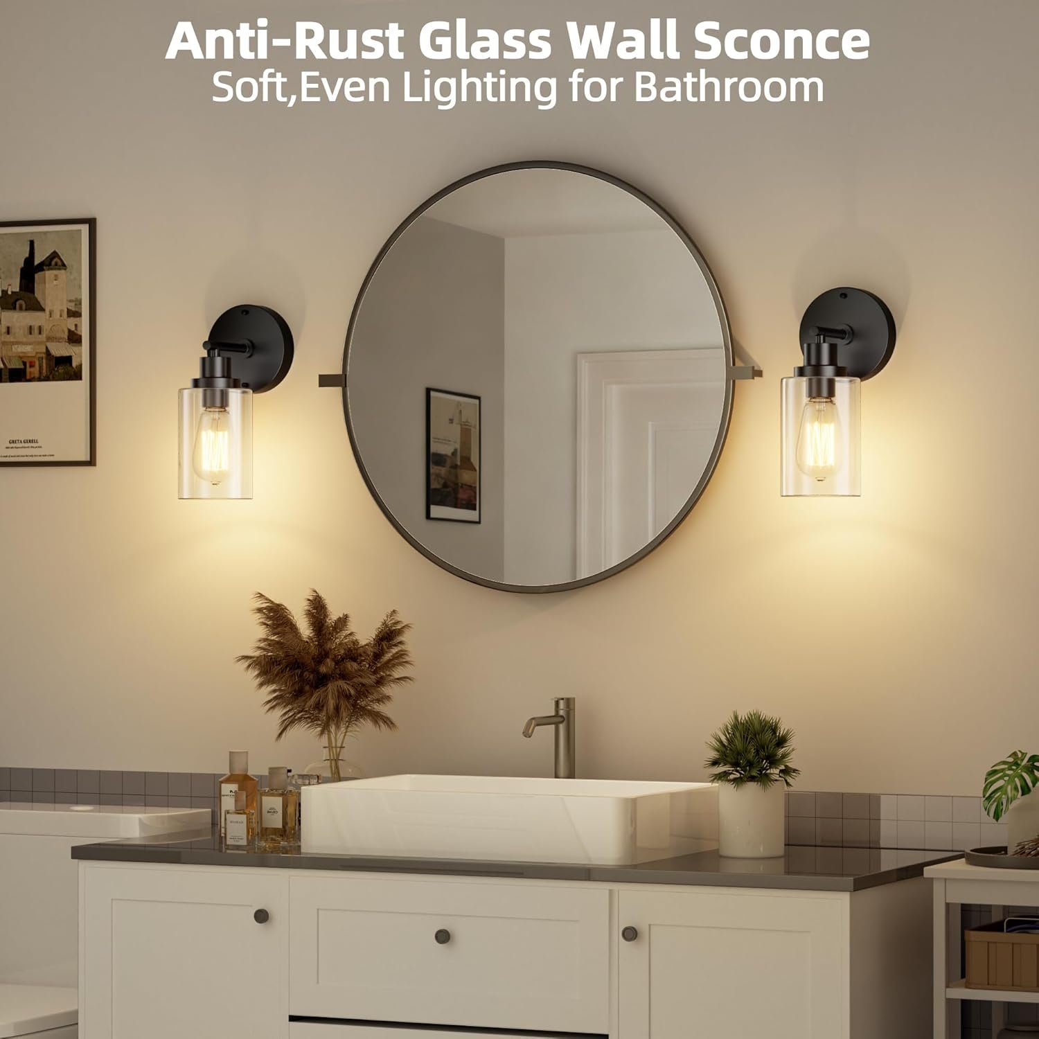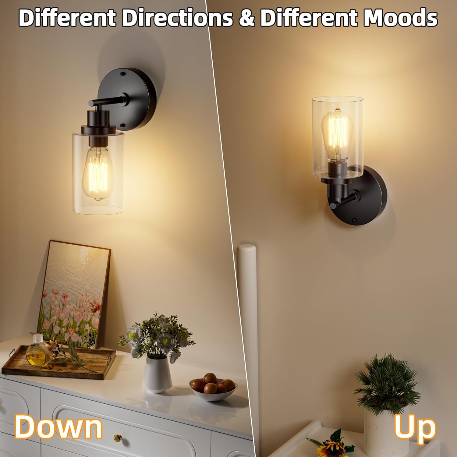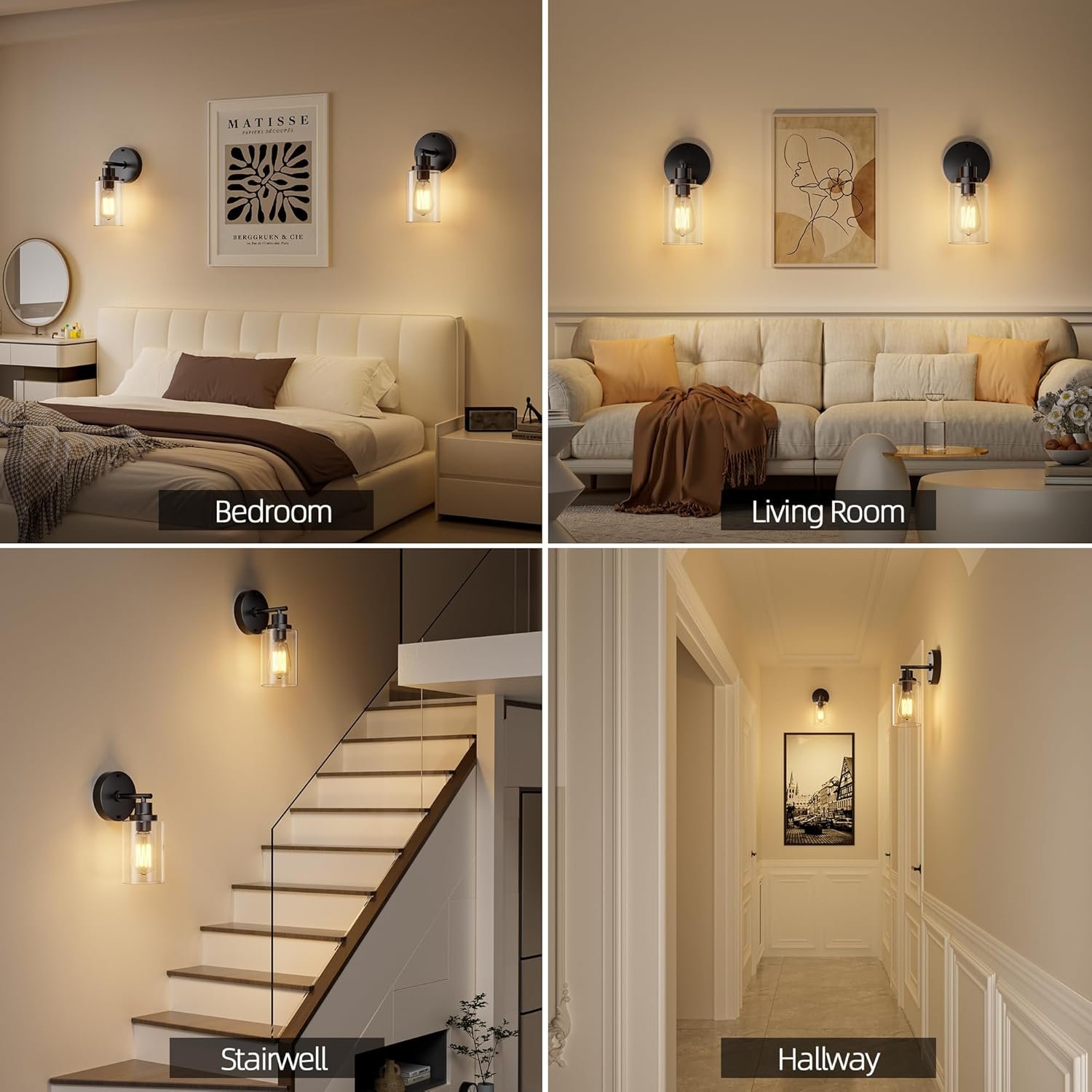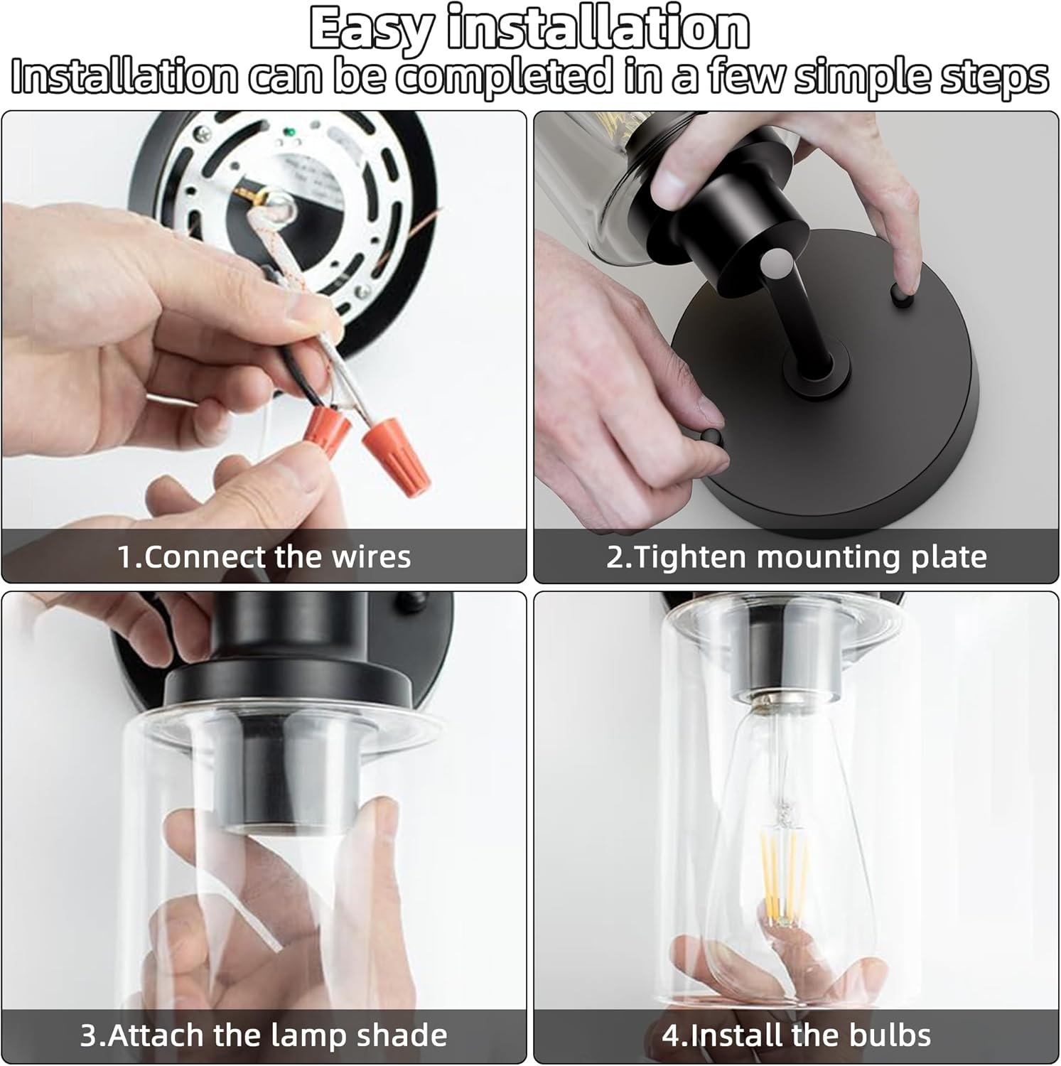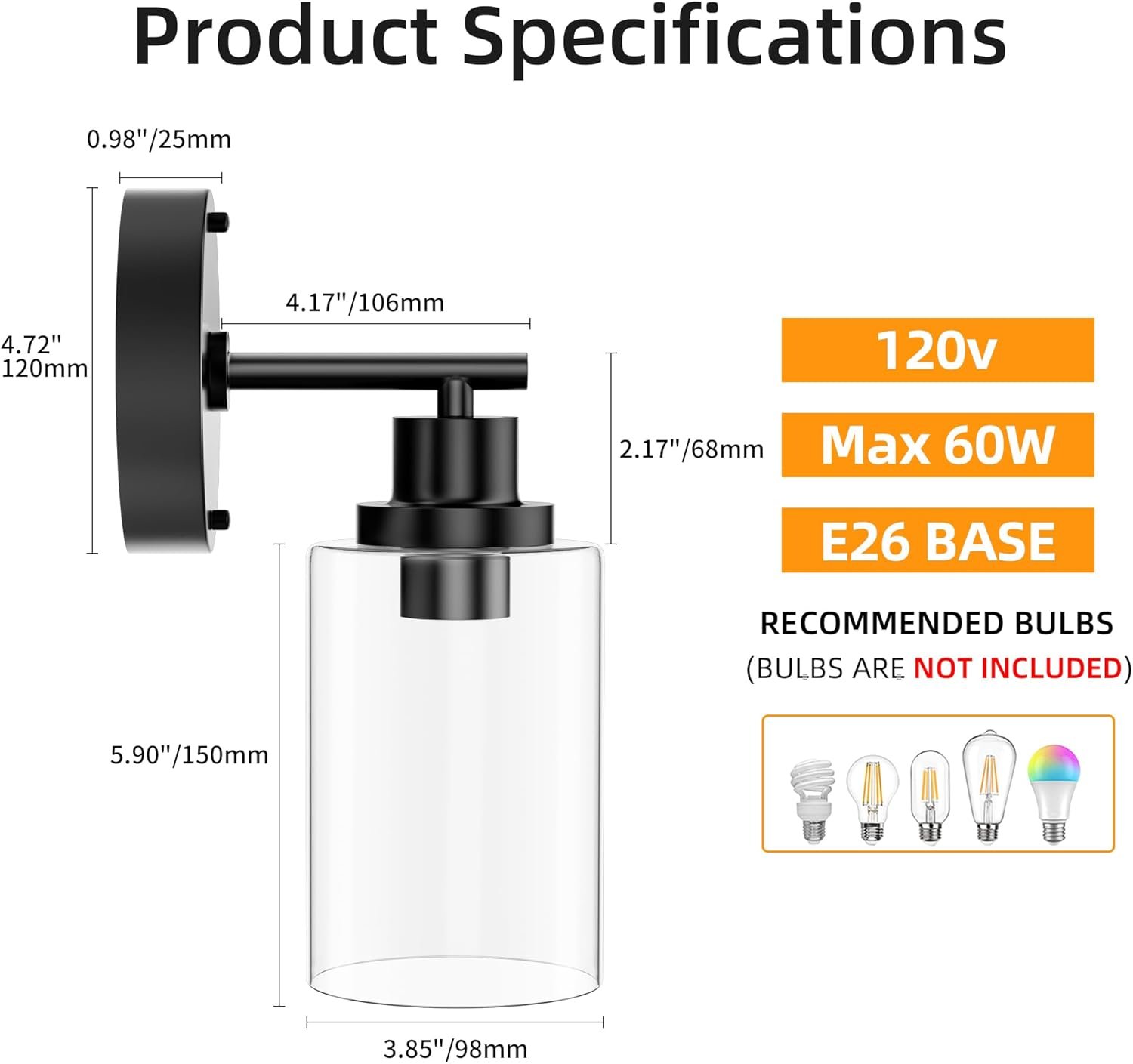 Exquisita artesanía y diseño elegante El aplique de pared negro mejorado está hecho de metal resistente con acabado negro mate y pantallas de vidrio más gruesas de alta calidad, antioxidante, a prueba de humedad y anticorrosión, duradero para ser usado durante muchos años. La hermosa lámpara de pared combina perfectamente con cualquier estilo de la casa, desde moderno hasta rústico, añadiendo un aspecto más exquisito, contemporáneo o vintage a la iluminación de tu hogar. Enchufe de base E26 y atenuable Los apliques de pared son compatibles con bombillas de base media E26 (bombilla NO INCLUIDA), como LED, incandescentes, CFL, RGB, halógenas, etc. (Máx. 60 W por bombilla). Este aplique de pared de 1 luz también puede ser totalmente regulable cuando se utiliza con bombillas regulables e interruptor de atenuación compatible, para ajustar diferentes niveles de brillo según sus necesidades. (Las bombillas E26 y el interruptor de atenuación no están incluidos) Tamaño fantástico Apliques de pared con la dimensión perfecta de pantalla de vidrio: 14,0 cm x 10,0 cm (L x A) y aplique de pared rústico después de la instalación: 27,0 cm x 12,0 cm (L x A). Puedes elegir la posición de instalación y la altura de acuerdo a tus necesidades reales, para crear una atmósfera hogareña cálida, adecuada para varias renovaciones de la casa. Instalación rápida y fácil Todos los accesorios de montaje necesarios para la instalación vienen con las lámparas de pared. Solo tienes que conectar los cables, luego instalar la pantalla de cristal y la bombilla. La lámpara de montaje en pared se puede montar hacia arriba o hacia abajo según tu referencia. Pero POR FAVOR cmTEN CUIDADO cm para evitar que se rompa al instalar, ya que la forma de la lámpara está hecha de vidrio. Fabulosa decoración del hogar El aplique de pared para el baño es ideal para la decoración interior del hogar, como una opción perfecta para decorar ambas partes de un espejo de baño o tocador, mesa de tocador, mesa de vestir, dormitorio, comedor, entrada o escalera. Mientras tanto, también se puede utilizar como luz de montaje en pared, lámpara de lectura, luz de baño, bar de café, etc.