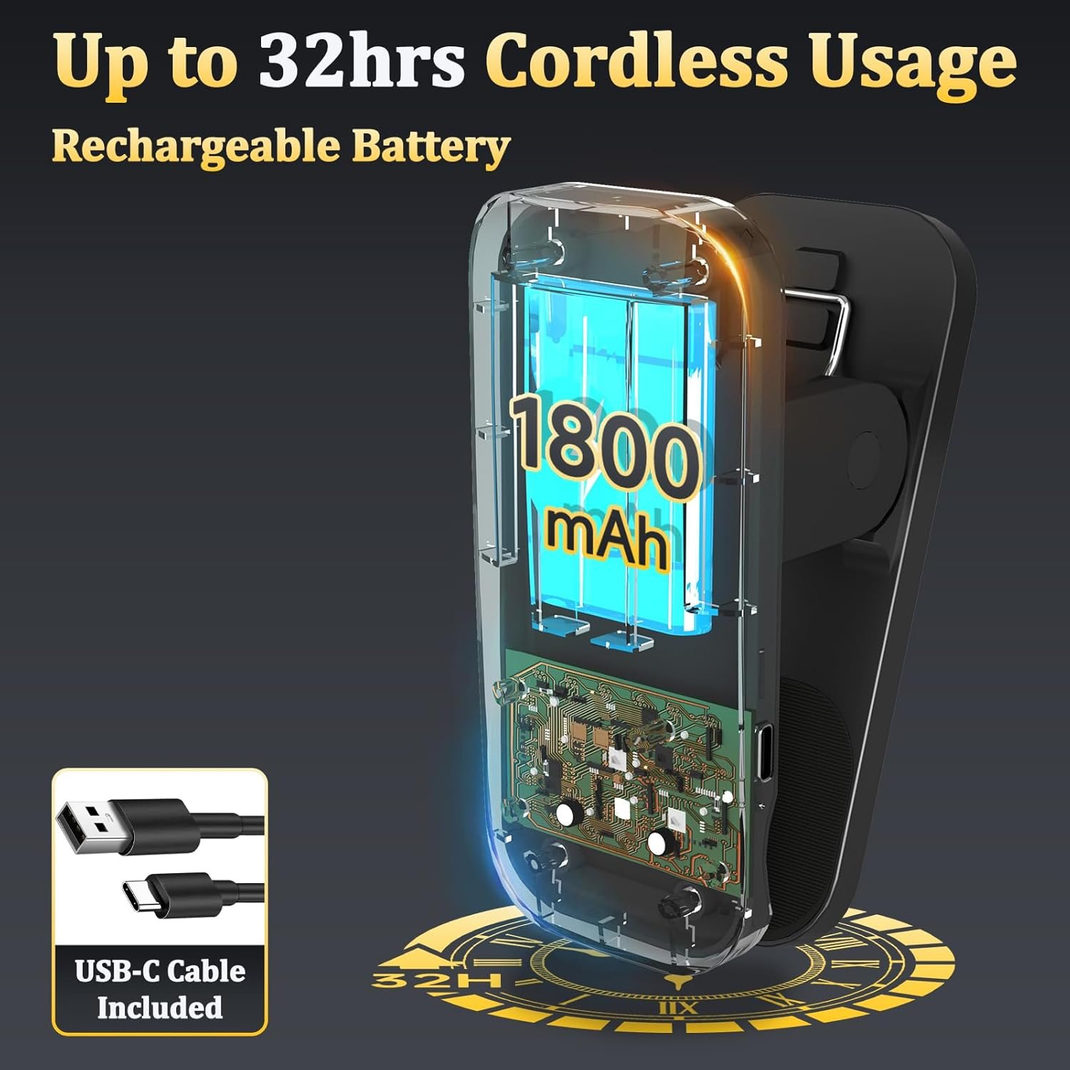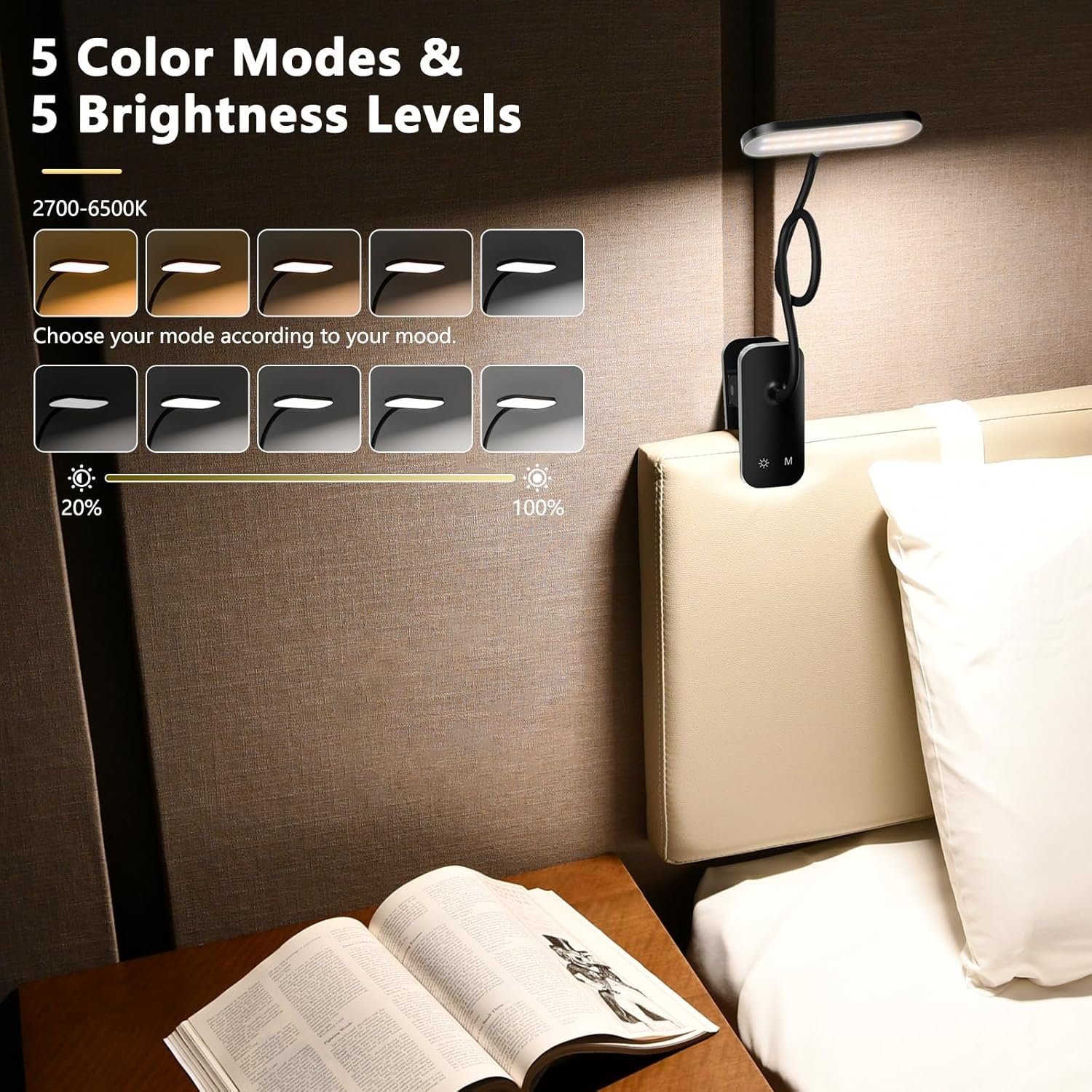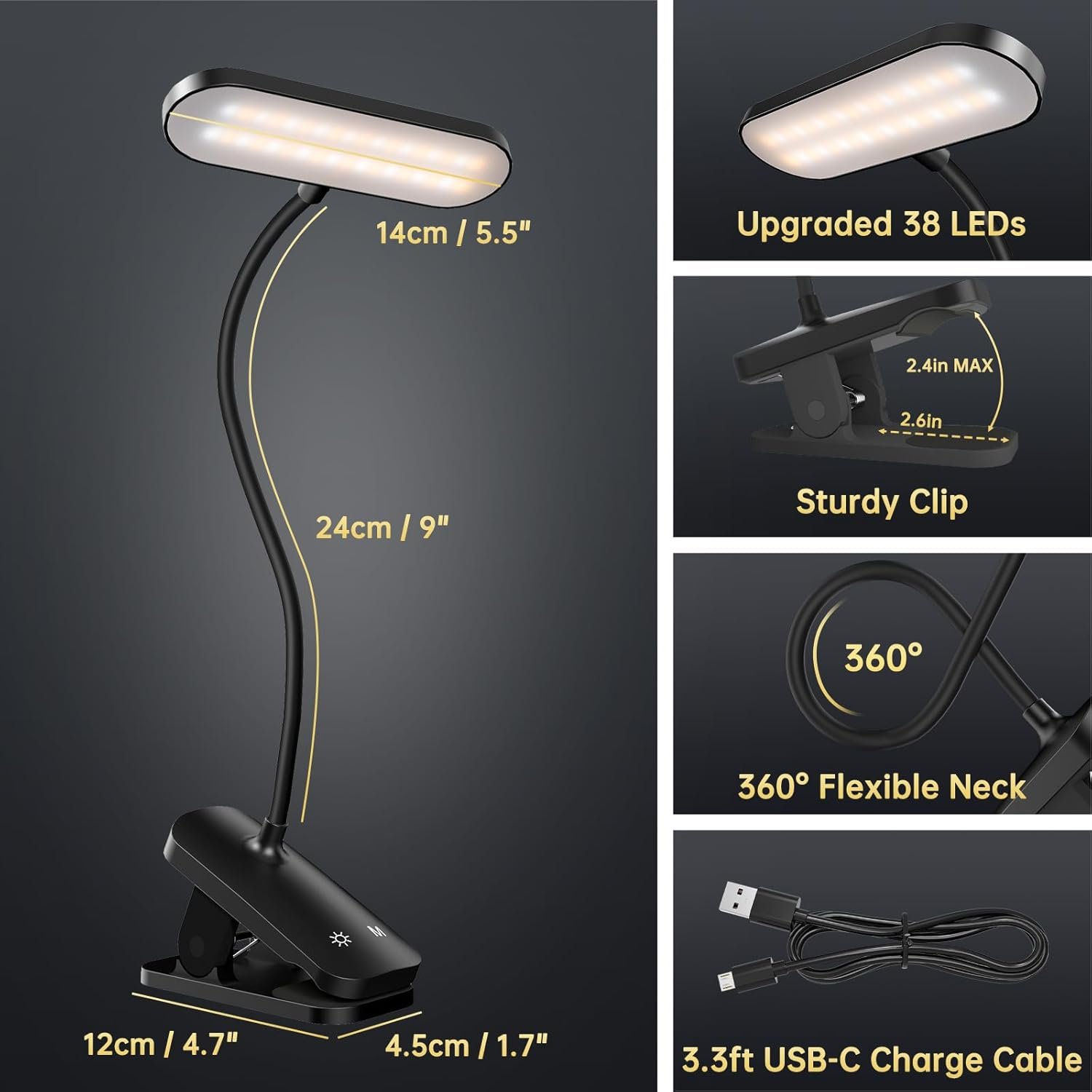 Batería recargable y lámpara de escritorio inalámbrica: la lámpara de batería integrada de 1800 mAh soporta hasta 4 horas al nivel de brillo más alto y 32 horas con el ajuste más bajo. Una batería completamente cargada tarda 4 horas con un cable USB tipo C. Proporciona la máxima comodidad al viajar o trabajar. Es portátil para llevar a cualquier lugar, un compañero perfecto, especialmente con enchufes limitados y cortes de energía. (El cable USB-C está incluido) Luz de escritorio con abrazadera fuerte con cuello flexible: la lámpara de lectura cuenta con una abrazadera grande resistente con almohadilla de silicona, superficies de agarre de forma segura de hasta 6,1 cm de grosor y que las mantiene libres de arañazos. Se puede fijar fácilmente a una cabecera, escritorios, estantes, mesas auxiliares o soportes de música. La forma interior curvada del clip se adapta perfectamente a los marcos de cama de metal. Su cuello de cisne ajustable de 360° se puede doblar y girar a la posición deseada, dándote mucha luz 5 modos de iluminación y 5 niveles de brillo: la abrazadera de escritorio en la lámpara puede cambiar fácilmente entre 5 brillo y 5 temperamentos de color (2700K-6500K) con botones táctiles. La luz con clip proporciona no parpadeo, sin deslumbramiento, sin rayos ultravioleta, sin radiación de frecuencia y luz amigable para los ojos para proteger tu ojo de daños. Es ideal para leer en la cama, videollamadas, oficinas en casa, niños que estudian, pintura de pasatiempos, iluminación de pantalla de computadora, máquina de coser y espacios de trabajo Brillo más amplio con diseño horizontal: la luz de lectura de escritorio adopta un diseño de cabeza horizontal, que tiene un rango de irradiación más amplio. Las 38 luces LED de alta calidad están dispuestas en 2 líneas rectas y la pantalla de material ABS hace que la luz sea más alta, uniforme y suave, proporcionando una iluminación estable y suficiente sin molestar a los demás. Es una opción ideal para iluminación nocturna Satisfacción garantizada: estamos seguros de que te encantará nuestra luz de batería con clip. Ofrecemos una promesa de felicidad de 30 días y una cobertura de garantía de 12 meses. La compra contiene 1 lámpara de escritorio con clip, 1 cable USB tipo C (101,6 cm), 1 manual de usuario (idioma español no garantizado). Ten en cuenta que no se incluye adaptador. Con HECDSTLY, estás eligiendo una mezcla perfecta de calidad y servicio centrado en el cliente