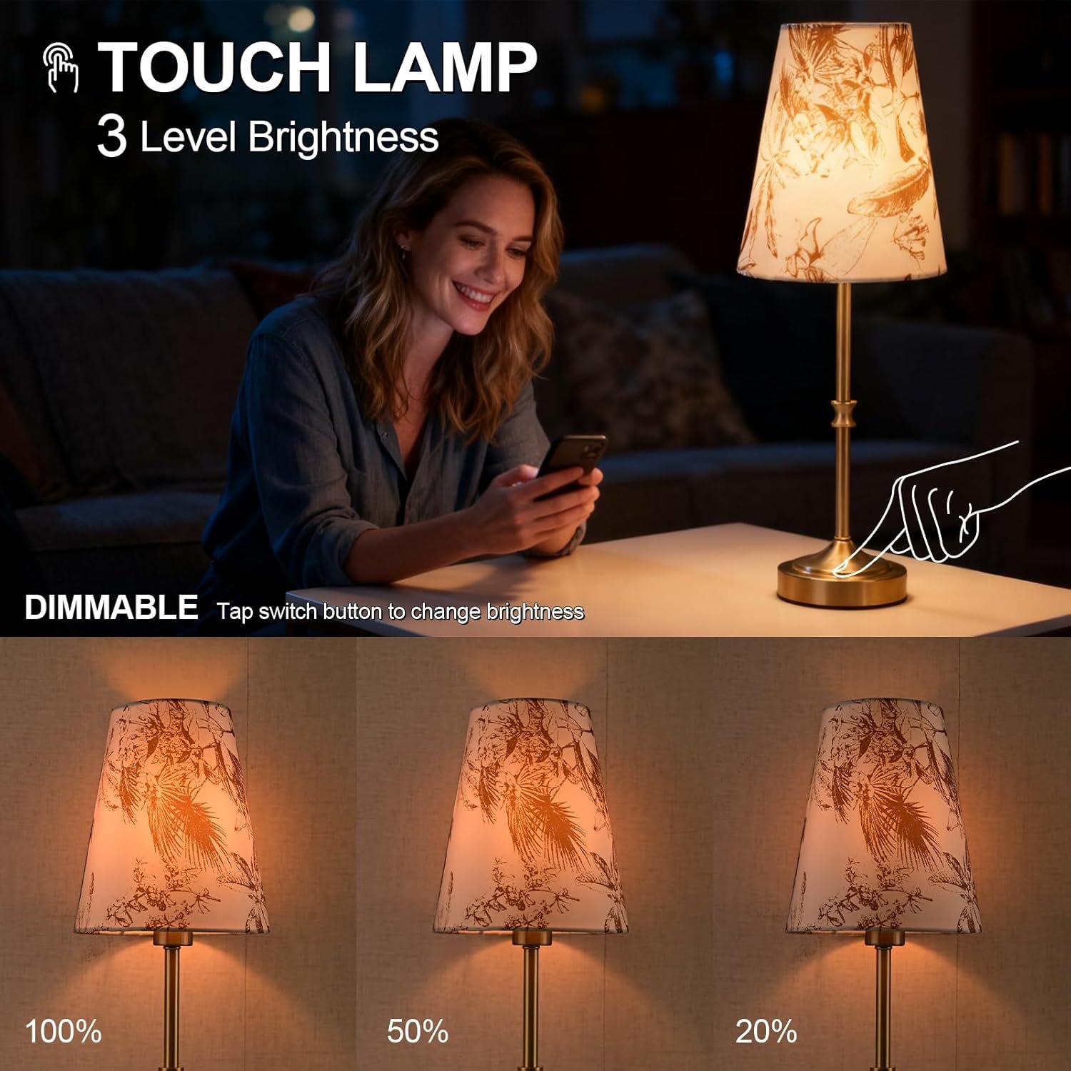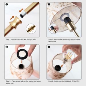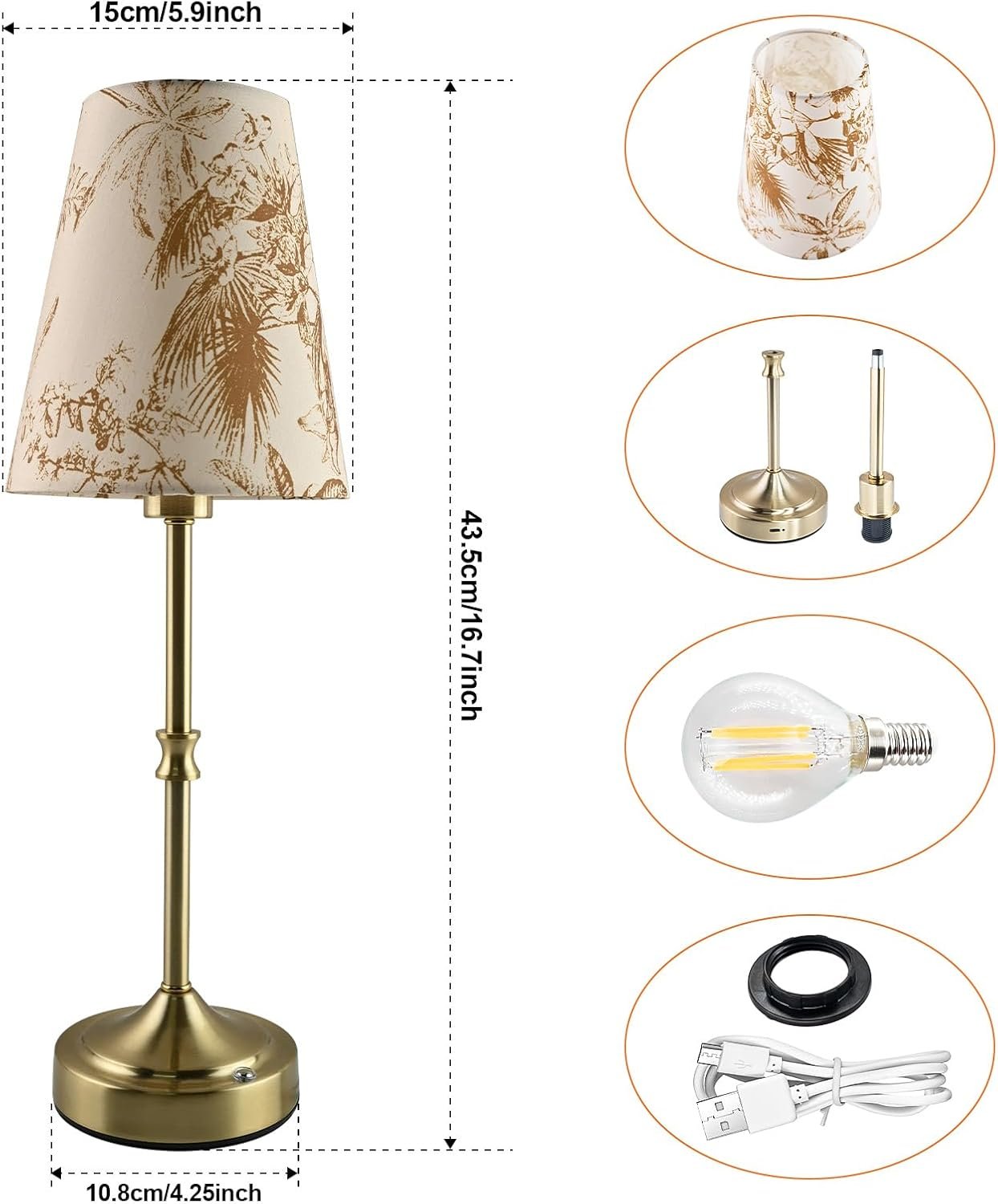 Lámpara de decoración de metal moderno : se debe agregar un clip adicional al soporte de montaje de la pantalla. (Lo enviaremos por separado. Lámpara de ambiente de metal moderna de mediados de siglo, de pie de 42,4 cm de alto y 15,0 cm de ancho, la lámpara de mesa es de un tamaño modesto que no ocupa mucho espacio en ningún lugar, pero proporciona mucha iluminación. El cuerpo está hecho de metal para mayor durabilidad y tiene un acabado pintado y texturizado. La pantalla está hecha de tela estampada, y el diseño añade un sentido de jerarquía a la lámpara de mesa, que es más elegante y texturizada bajo la luz suave. Control táctil de 3 niveles de atenuación : esta lámpara táctil LED portátil cuenta con control táctil en su base. Toque el botón del interruptor para cambiar el brillo para cambiar el brillo de 3 vías (20%/50%/100%) con una bombilla de filamento LED, base E12, potencia de 2 vatios, 250 lm. Más brillante que otros similares. Sin parpadeo, agradable a los ojos. La pequeña lámpara ambiental proporciona una luz cálida suave y acogedora, perfecta para cualquier entorno Batería integrada de 5200 mAh: la lámpara de mesa ambiental recargable tiene una batería integrada de 5200 mAh y está equipada con un cable de carga USB. El rojo está cargando, el verde está lleno. Tardará aproximadamente 4.5 horas en cargarse completamente. Después de estar completamente cargado. La lámpara funciona con pilas soporta un uso portátil hasta 32 horas de uso continuo, dependiendo del brillo elegido. Método de instalación: 1. Primero, retire el anillo de retención negro del poste de luz. 2. Luego instale la pantalla. 3. Luego asegure la pantalla con el anillo de retención. 4. Instale la bombilla. Si tienes algún problema de instalación, ponte en contacto con nosotros inmediatamente. ¡Responderemos dentro de las 24 horas! Lámpara vintage de metal dorado: nuestra lámpara retro de granja emite una iluminación romántica y cálida, adecuada para uso propio o regalo para amigos y familiares. Lámpara de mesa decorativa interior/exterior. Esta combinación de belleza y practicidad se puede colocar en tu dormitorio, mesa de comedor, mesa de café, sala de estar, cocina y cualquier rincón de tu casa. Familiares y amigos en el día de San Valentín, Navidad, regalos del día de Acción de Gracias y fiestas al aire libre con familiares y amigos