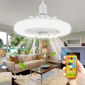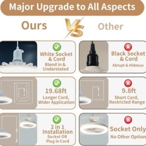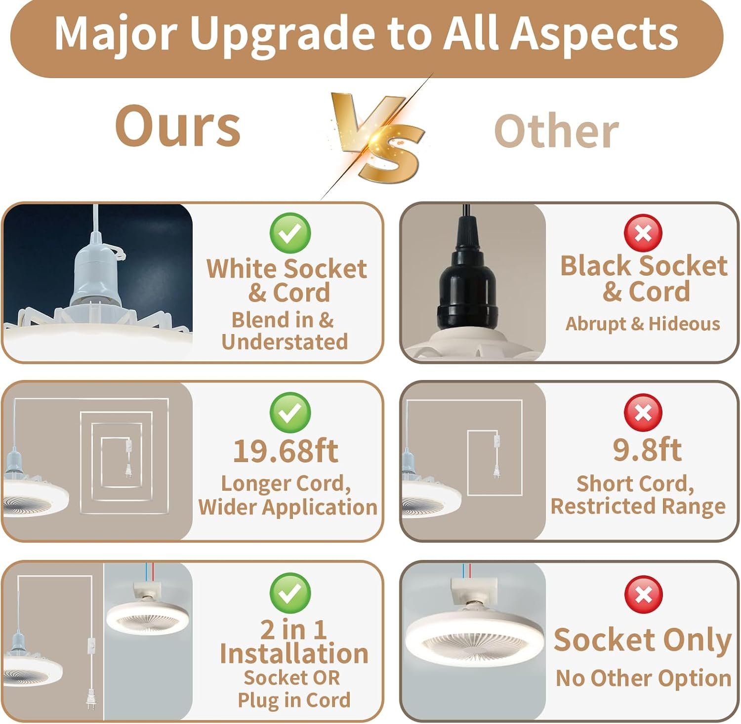 Enchufe estándar E26 de ajuste universal En comparación con otros modelos de base de bombilla E27 en el mercado, nuestra base E26 estándar de Estados Unidos es la base de bombilla más utilizada existente en Estados Unidos, simplemente reemplaza tu bombilla existente con esta y obtendrás una zona más fresca más brillante al instante. Luz de ventilador enchufable, cable blanco de 19.68 pies de largo Nuestra luz de ventilador viene con un cable de 19.68 pies de largo que es, con mucho, el más largo del mercado, y permite que se cuelgue en casi cualquier lugar que necesite estar. Además, el cable es en BLANCO que se adapta a casi todas las casas de este país. Los modelos de cable de alimentación negro en el mercado parecían demasiado notables en el techo donde no deberían estar. Brillo regulable y CCT ajustable: esta luz de ventilador de enchufe E26 viene con un amplio rango de brillo y CCT ajustable, puedes personalizar los ajustes en el control remoto para lograr diferentes efectos de luz. También hay 3 niveles de brillo preestablecidos y 3 niveles de temperatura de color preestablecidos para que elijas, estos modos preestablecidos estarán bien en la mayoría de las circunstancias. 3 modos de velocidad del ventilador: el ventilador tiene 3 modos de velocidad del ventilador (fuerte, normal, suave). Para ser notado, este es solo un ventilador pequeño en lugar de un ventilador de techo adecuado, es un muy buen ventilador de refrigeración y circulación para 1-2 personas. Control remoto multifunción: la luz del ventilador viene con un práctico control remoto, y todas las funciones están claramente indicadas en los iconos, comprueba las imágenes para ver qué puede hacer cada botón. Hay 3 botones de cmtemporizador cm en la parte inferior y con una pulsación, la luz del ventilador se ajustará en modo de sincronización (1/2/4 horas).