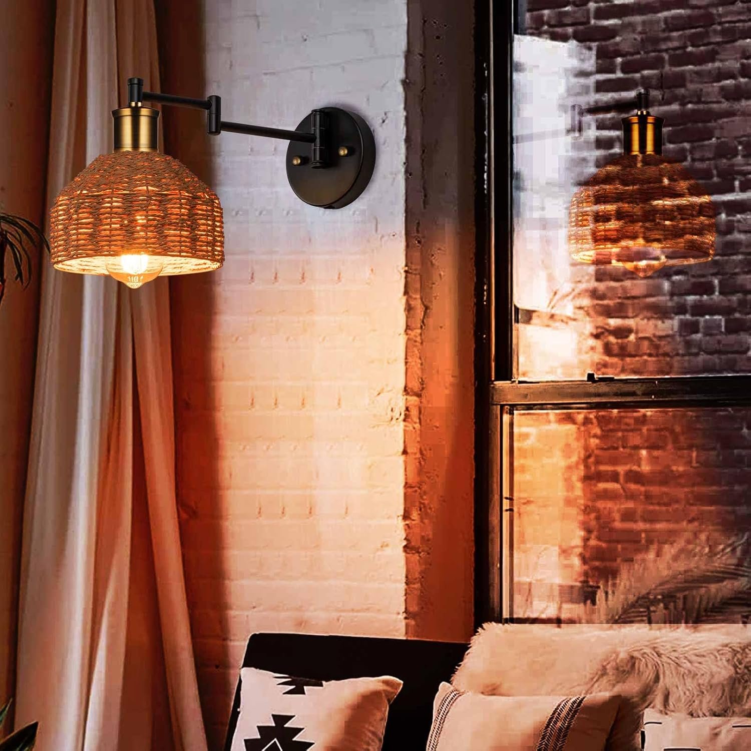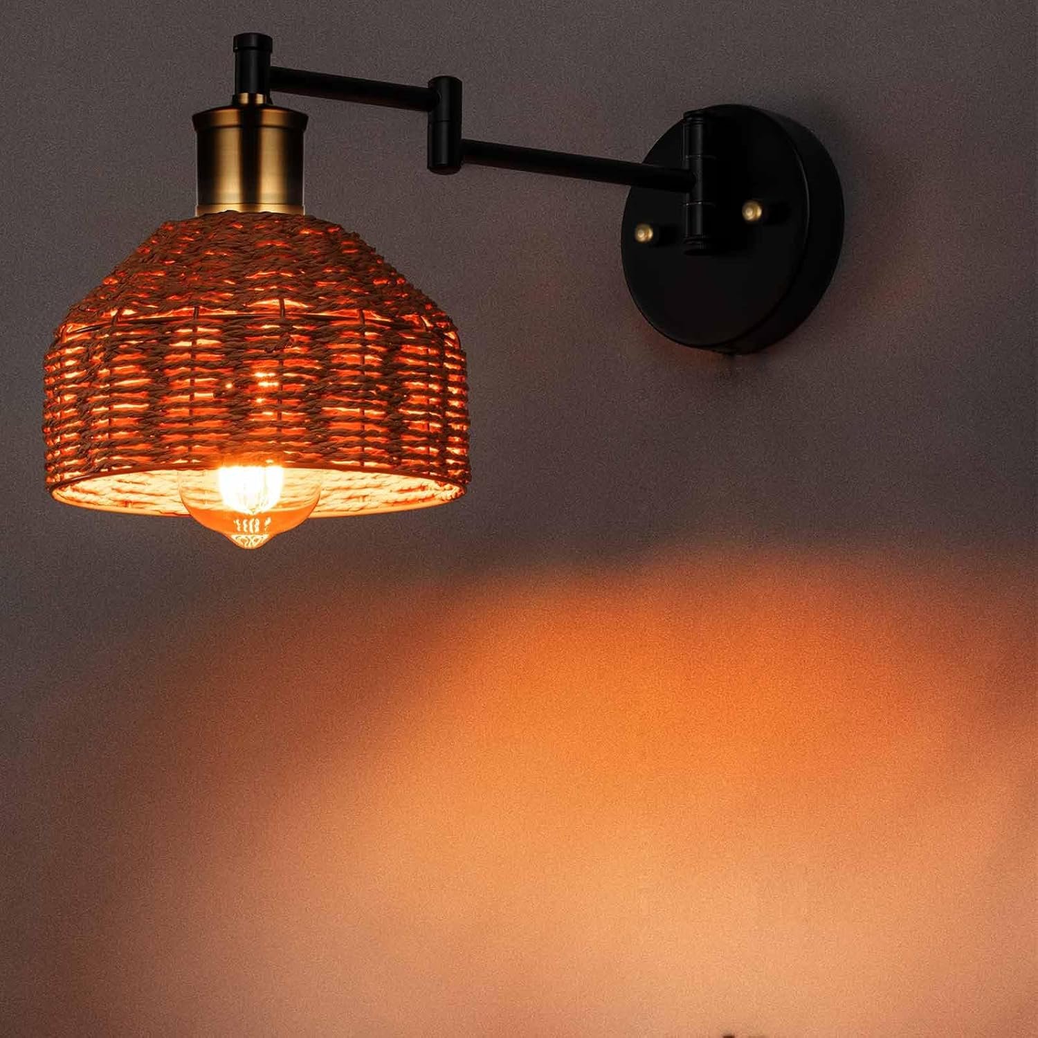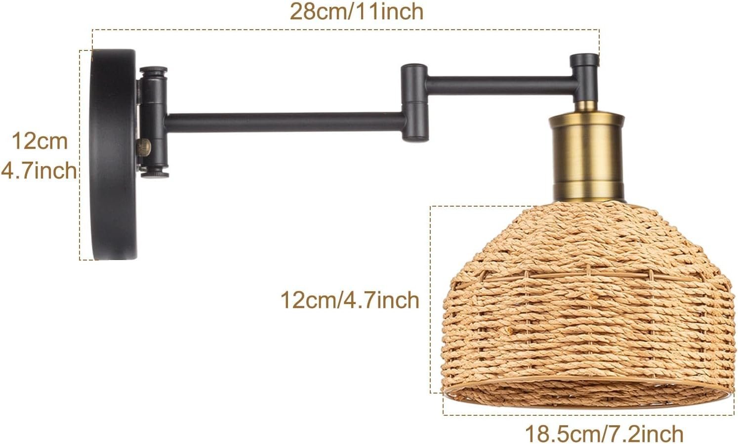 Brazo oscilante flexible: ponte móvil con nuestro aplique de pared ajustable, capaz de moverse de lado y de izquierda a derecha. Su brazo flexible te permite maniobrar la luz entre 180 y 270 grados. Pantalla de cuerda de papel natural tejida a mano: esta lámpara de pared versátil, moderna y vintage con una pantalla única es adecuada para dormitorios, pasillos, cafeterías, hoteles, salas de estar o comedores, cocinas, etc. El cabezal de la lámpara está acabado con latón cepillado, y el brazo negro mate de este aplique de pared con cable tiene un aspecto moderno que puede mezclarse fácilmente con casi cualquier decoración y aporta a la habitación brisa tropical con estilo boho chic. Tamaño y detalles del artículo: con un diámetro de pantalla de 18,3 cm, un diámetro de base de 11,9 cm y una longitud de brazo de 23,9 cm, nuestra lámpara tiene el tamaño correcto. Tiene una potencia máxima de 40W y un voltaje de 120V. Viene con todos los accesorios necesarios para una instalación segura. Bombilla no incluida. Bombilla compatible con enchufe E26: ilumina tu entorno con nuestra iluminación de pared compatible con bombillas incandescentes, halógenas y LED, bombilla E26 (bombilla no incluida). Fácil de instalar: incluye todos los accesorios de montaje para una instalación rápida y fácil. Acerca de nosotros: IC INSTANT COAC siempre está poniendo cada effor para mejorar la experiencia de iluminación de tu hogar. Estamos comprometidos a proporcionar productos de alta calidad y satisfacer las necesidades de los clientes, y darte una experiencia de iluminación diferente y especial para el hogar.