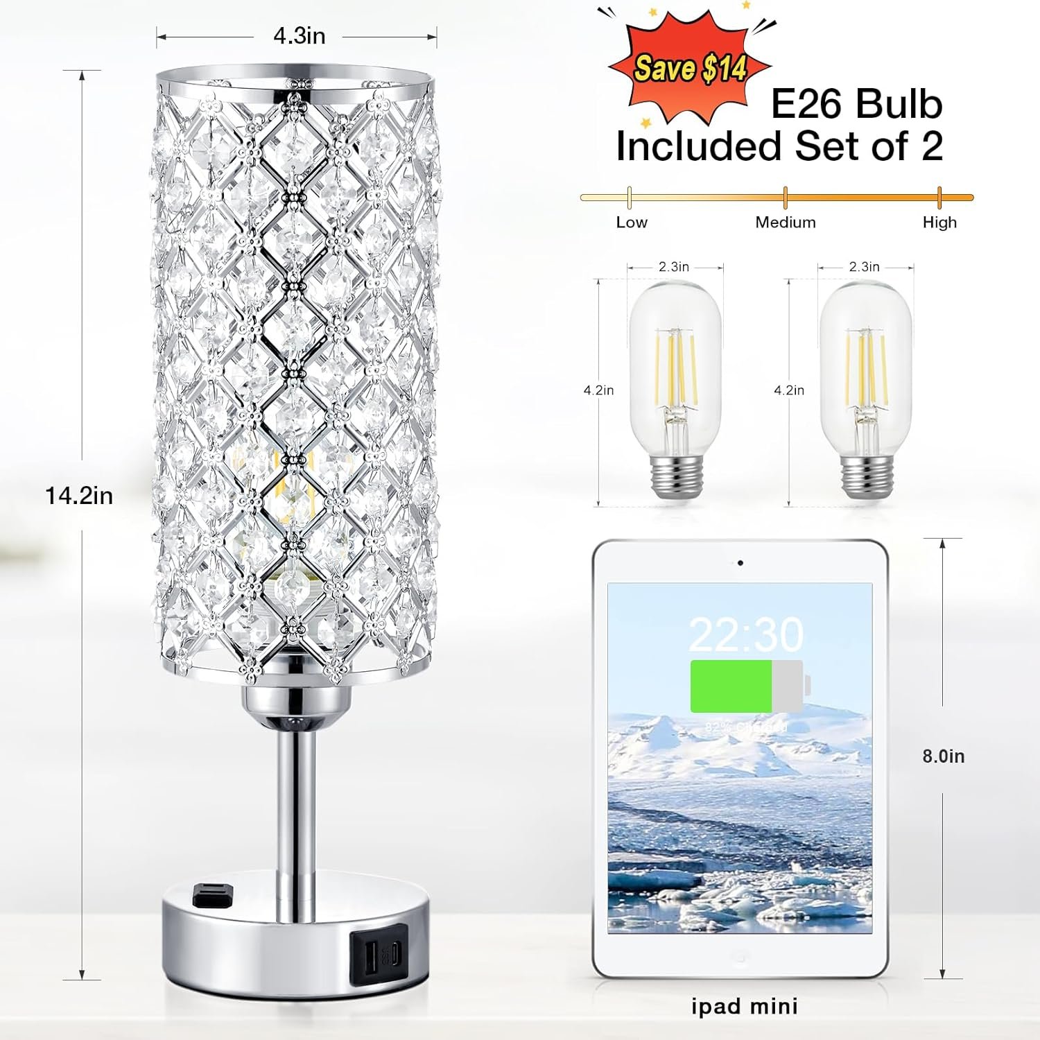 Características especiales: 2 bombillas incluidas, Control táctil regulable de 3 vías, Elegante diseño de cristal, Juego de 2 lámparas de mesa de cristal plateado, Puertos de carga USB C+A y CA