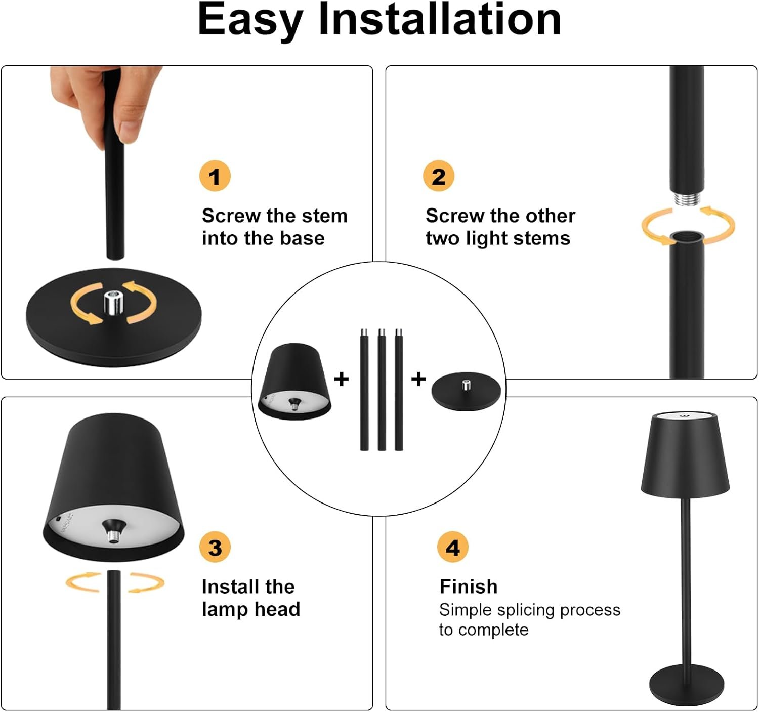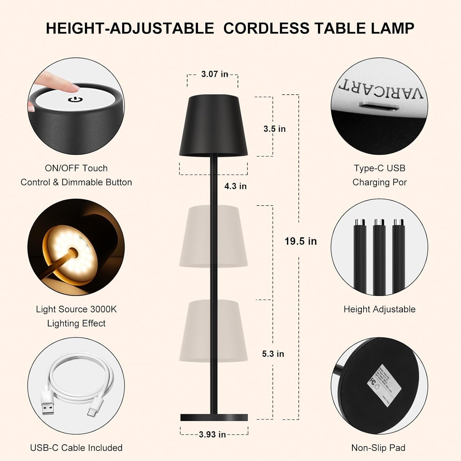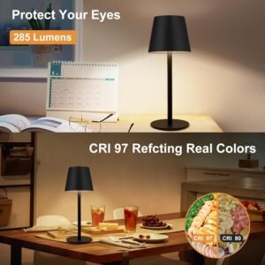 Lámparas de mesa de metal de altura ajustable: estas luces de mesa negras cuentan con tres tallos de metal de 5½ cm, lo que le permite personalizar la altura de 22,4 cm a 50,8 cm. Ideal para entornos íntimos o para iluminar espacios más grandes. Con un solo vástago, crea una acogedora lámpara de mesa inalámbrica de 22,4 cm-25,4 cm; agrega un segundo para una lámpara de escritorio portátil de 35,8 cm-38,1 cm, o combina los tres para una lámpara de mesa operada por batería de 48,3 cm -50,8 cm de altura. La base y la pantalla de metal complementan cualquier decoración, haciendo que estas lámparas de mesa ajustables en altura sean ideales para la lectura, la cena o la iluminación de acento Lámpara portátil recargable inalámbrica: Estas lámparas de mesa portátiles inalámbricas equipadas con una batería incorporada de alta capacidad de 5000mAh, ofrecen una notable iluminación de 8-40 horas con una carga completa. Estas lámparas que funcionan con baterías te aseguran tener suficiente luz cuando la necesites. Al ser inalámbricos e impermeables IP66, puedes moverlos de forma portátil y utilizarlos en interiores y exteriores. Se puede utilizar como una lámpara de noche o una lámpara inalámbrica para exteriores. Lámparas táctiles a batería para salas de estar, dormitorios, entradas, estanterías, oficinas, cafés, cocinas, bares, camping, fiestas, patios, patios interiores, jardines, etc Lámpara Táctil Regulable Sin Escalones de 3 Colores: La lámpara de escritorio táctil inalámbrica negra presenta 3 temperaturas de color: Blanco cálido (3000K), Luz blanca natural (4000K) y Blanco frío (6000K), Regulación sin escalones (5%-100%). Simplemente toca el botón en la parte superior de la lámpara LED de batería metálica para ajustar la iluminación según tus diferentes necesidades. (Con una función de memoria de iluminación). Con una modesta potencia de 3.5 W y un voltaje de CC de 5 V, la vida útil del LED: 50,000 horas; Flujo luminoso: 285 lm con iluminación uniforme de 360 grados y capacidad de reproducción cromática CRI-97 para reducir la fatiga visual en uso prolongado y revelar los platos en sus verdaderos colores, pero sin ser deslumbrante Construcción de metal moderna y elegante: Fabricada con metal resistente, esta lámpara inalámbrica irradia elegancia y cuenta con una estructura estable, haciéndola resistente a golpes accidentales. Su diseño versátil complementa a la perfección una gama de estilos de decoración interior y exterior Compromiso de servicio al cliente de 24 meses: Como fabricante profesional de iluminación con más de una década de experiencia, nos especializamos en crear soluciones de iluminación estéticamente agradables y bien elaboradas para las habitaciones de nuestros clientes. Si tienes algún problema con nuestra lámpara de mesa inalámbrica recargable portátil, no dudes en comunicarte. Nuestro equipo dedicado se compromete a resolver sus inquietudes en 24 horas
