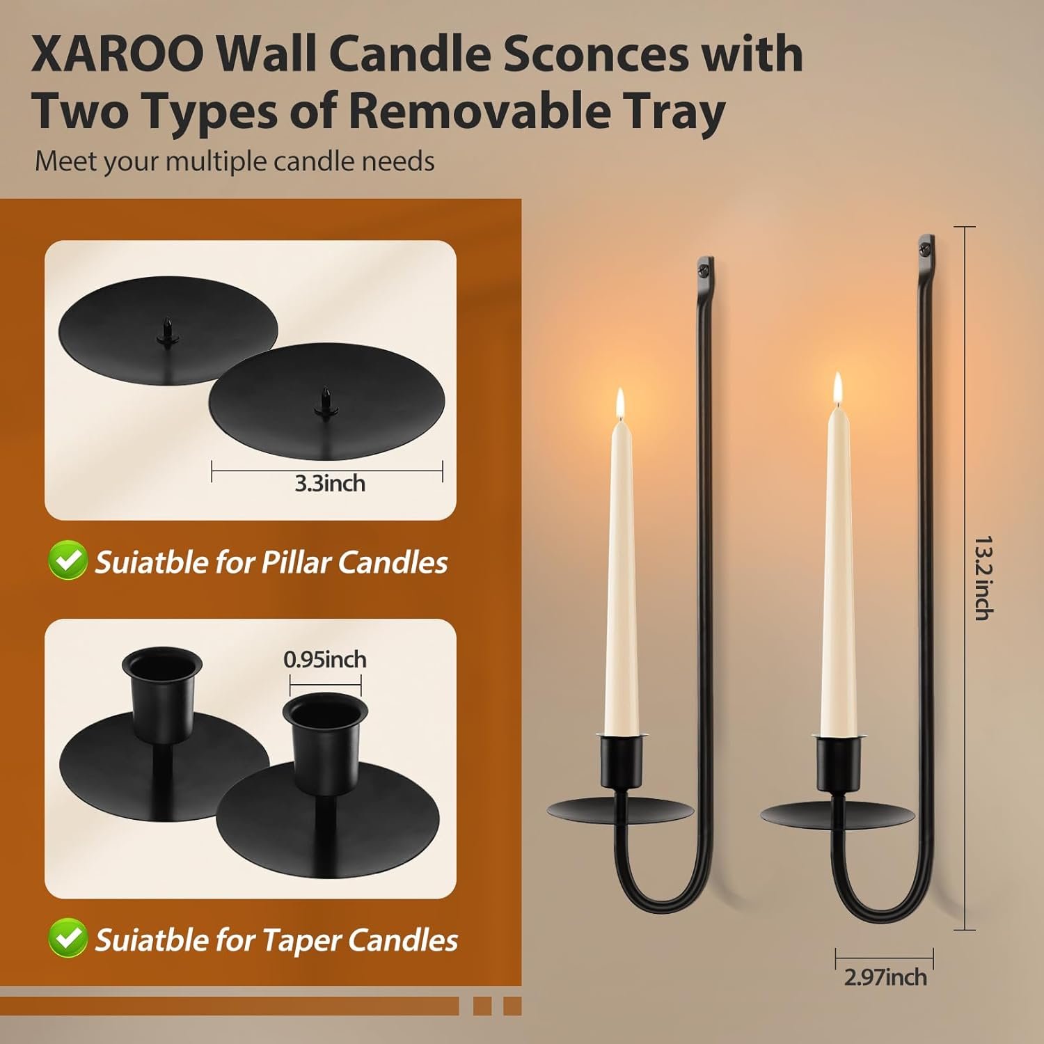PORTAVELAS CÓNICO Y DE CUENCO: Viene con dos tipos de discos removibles en la parte inferior (soporte cónico y soporte de cuenco), satisface tus múltiples necesidades de velas DECORACIÓN ESTILIZADA: Este juego de 2 apliques de pared son simples sin exageración, complementan perfectamente con lienzo, espejo, mesas, una buena adición para entrada, esquina de escalera, chimenea, sala de estar ALTA CALIDAD: Este portavelas de pared está hecho a mano de hierro con una superficie lisa, duradero y resistente, no se decolora ni se deforma, mejora tu habitación durante mucho tiempo FÁCIL INSTALACIÓN: Se ensambla fácilmente con un tornillo (paquete incluido), lleva la sofisticación de la luz de las velas a cualquier lugar SERVICIO SATISFACTORIO: XAROO proporciona un soporte confiable para nuestros productos. Estaremos a su servicio 24/7. Si tienes alguna pregunta, no dudes en ponerte en contacto con nosotros, te proporcionaremos una solución satisfactoria.