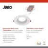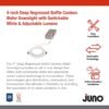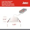 INNOVADORA LUZ LED DE TECHO: los Downlights LED de retroceso profundo de Juno cuentan con interruptores para un fácil ajuste del color y el brillo y eliminan la necesidad de carcasas empotradas; el diseño sin lata permite una fácil remodelación o instalación de nueva construcción desde abajo Luces LED 15 en 1: el interruptor integrado permite ajustes de temperatura de color – elija 2700 K suave, 3000 K cálido, 3500 K neutro, 4000 K frío o 5000 K luz blanca de luz diurna; opciones de lúmenes bajos, medios y altos que admiten instalar a diferentes alturas de techo Iluminación empotrada fácil de instalar: diseño sin lata con caja de controlador remoto que se adapta a espacios reducidos; ideal para luz de techo de cocina, luz de techo de baño, plafones y áreas poco profundas; no requiere carcasa facilita la configuración y reduce el tiempo de instalación Brillo reducido: la lente de retroceso profundo proporciona un excelente control de deslumbramiento y calidad de luz para iluminación de techo en salas de estar, sótanos, pasillos; ubicación húmeda lista para luz de ducha o luz de techo exterior; la lente de policarbonato garantiza una iluminación uniforme Especificaciones: Dimensiones: 13,4 cm de diámetro x 5,4 cm de alto; vida útil nominal de 50.000 horas; regulable hasta un 10% con atenuadores estándar; opciones de lúmenes – 700/900/1100; reemplaza incandescente de 65 W; certificado ENERGY STAR; listado CSA; clasificación IC de 5 años de garantía