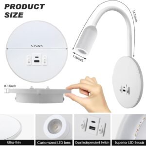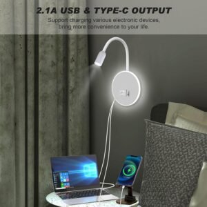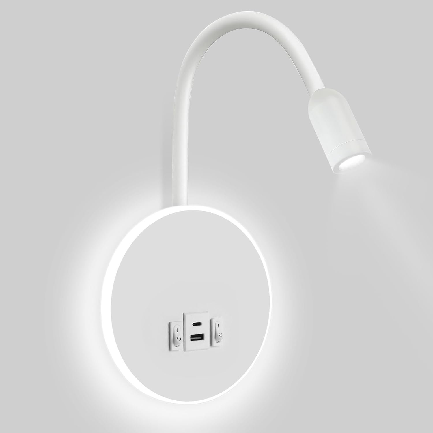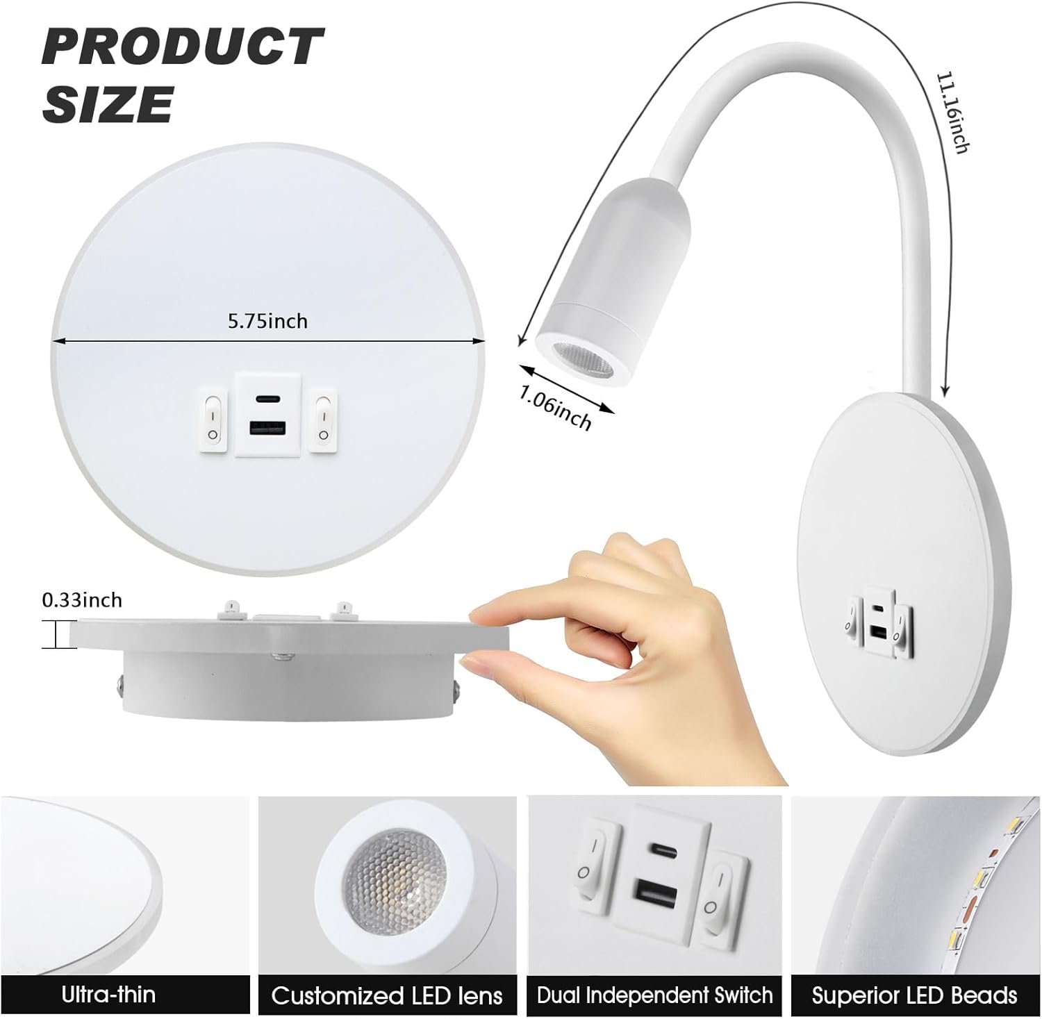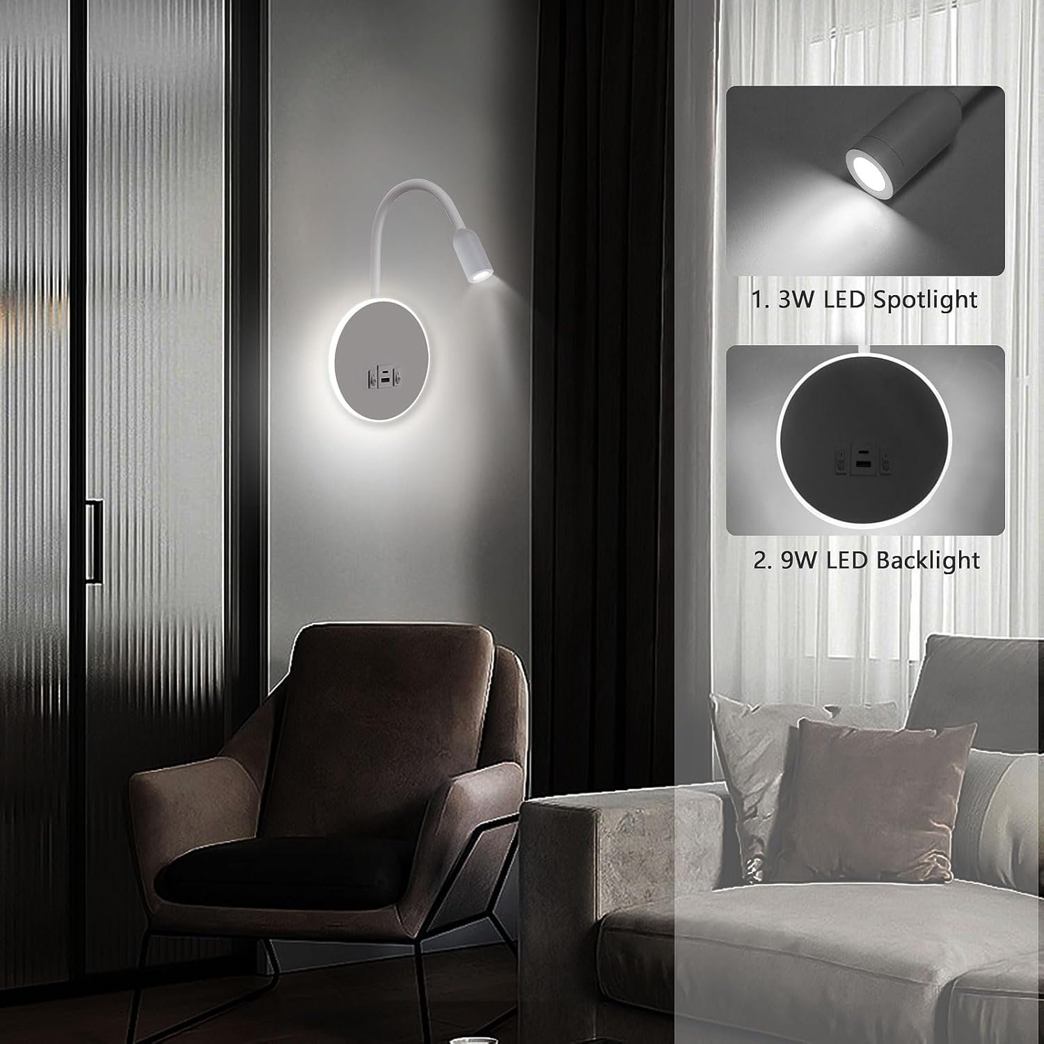 Lámpara de lectura multifuncional: la luz de fondo de 9 W y el foco de lectura de 3 W con la misma temperatura de color están controlados por interruptores independientes duales; Y está equipado con puertos USB y tipo C de 2.1 A para soportar la entrega de energía al exterior; Tal lámpara de pared LED multifuncional satisface tus múltiples necesidades Foco ajustable flexible: 28,3 cm de manguera flexible, constituye un foco de lectura LED de 3W. Debido a su flexibilidad, se puede girar 360° para iluminar cada esquina. El cabezal de la lámpara está equipado con una lente óptica de concentración que proporciona un efecto de luz clara y brillante. Puertos USB y Tipo-C de 2.1A: Dos puertos de carga, puede cargar su teléfono, auriculares, altavoces u otros dispositivos, ya sea que la luz de pared esté encendida o apagada; conveniente para su vida. Pero ten en cuenta que la carga de la lámpara en sí no es compatible Estructura de material superior: cuerpo de lámpara de aluminio, además de diseño acrílico ultrafino; Adoptando proceso de pintura, estructura fina; Mientras tanto, el soporte redondo externo de 10,2 cm puede cubrir la caja de conexiones de EE. UU.; cableado duro para una fácil instalación. Diseño de voltaje ancho 85-265V, adecuado para diferentes entornos de voltaje Amplias aplicaciones: Se puede utilizar como lámpara de noche, lámpara de mesa, lámpara de pared, luz de lectura, lámpara de noche, etc. y es adecuado para dormitorio, sala de estar, mesita de noche, estudio, pasillo, entrada y otros lugares diferentes como quieras