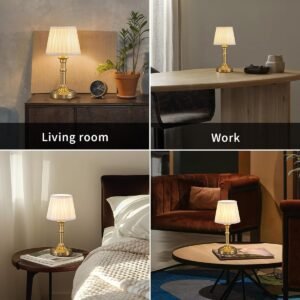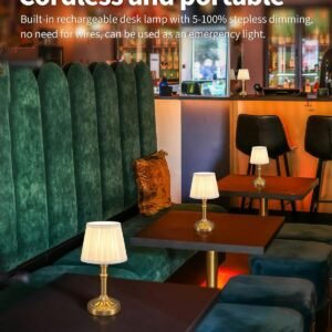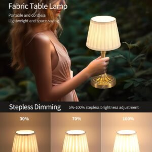 Diseño portátil sin cable Elige el diseño sin cable, sin molestia de torsión del cable, ponlo sobre la mesa sin ocupar espacio visual. Peso y tamaño moderados, se pueden recoger en cualquier momento y colocar en otro lugar. Aspecto retro y moderno, añade una belleza diferente a tu sala de estar. No solo se puede utilizar en dormitorios, salas de estudio y otros lugares interiores, sino que también se puede utilizar en cafeterías, comedores, restaurantes comerciales y otros lugares. Atenuación continua Lámpara de escritorio ajustable LED con botones táctiles fiables instalados en la base de la lámpara, puedes controlar fácilmente el encendido/apagado tocando la lámpara o pulsando durante mucho tiempo para cambiar el brillo, proporciona una luz cálida suave y acogedora de 3 W 2700 K que se puede ajustar del 5 al 100%. El brillo más alto se utiliza para trabajar y estudiar, mientras que el brillo más bajo se puede utilizar para la crianza de los hijos, meditación, ver películas y más. Adecuado para todas las escenas y personas de diferentes edades. Batería integrada Batería recargable integrada de 4000 mAh, se incluye una bombilla en el paquete y se puede usar después de la instalación y carga completa. El tiempo de carga es de 4 a 6 horas. Se puede utilizar durante aproximadamente 8 horas en el estado más brillante y de 24 a 40 horas en el estado más oscuro. Las cuentas LED estables y sin parpadeo se seleccionan cuidadosamente para difundir la luz a través de la bombilla, proporcionando suficiente luz sin dañar tus ojos. Material de metal Esta lámpara de mesa mide 33,0 cm de alto, 16,0 cm de ancho y pesa 1.3 libras en un tamaño compacto. Ya sea que estés estudiando, leyendo o trabajando, no ocupa mucho espacio pero proporciona mucha luz de iluminación. El cuerpo está hecho de metal con un acabado electrochapado para un aspecto suave y texturizado. Pantalla de tela con buena transmisión de luz. Servicio de calidad Elegante lámpara de escritorio LED, lámpara de decoración para el hogar, adecuada para uso personal o como regalo para amigos y familiares. Si tienes alguna pregunta después de recibir el paquete, no dudes en ponerte en contacto con nosotros, estamos encantados de proporcionarte ayuda técnica y darte una solución satisfactoria. Lámpara de decoración del hogar.