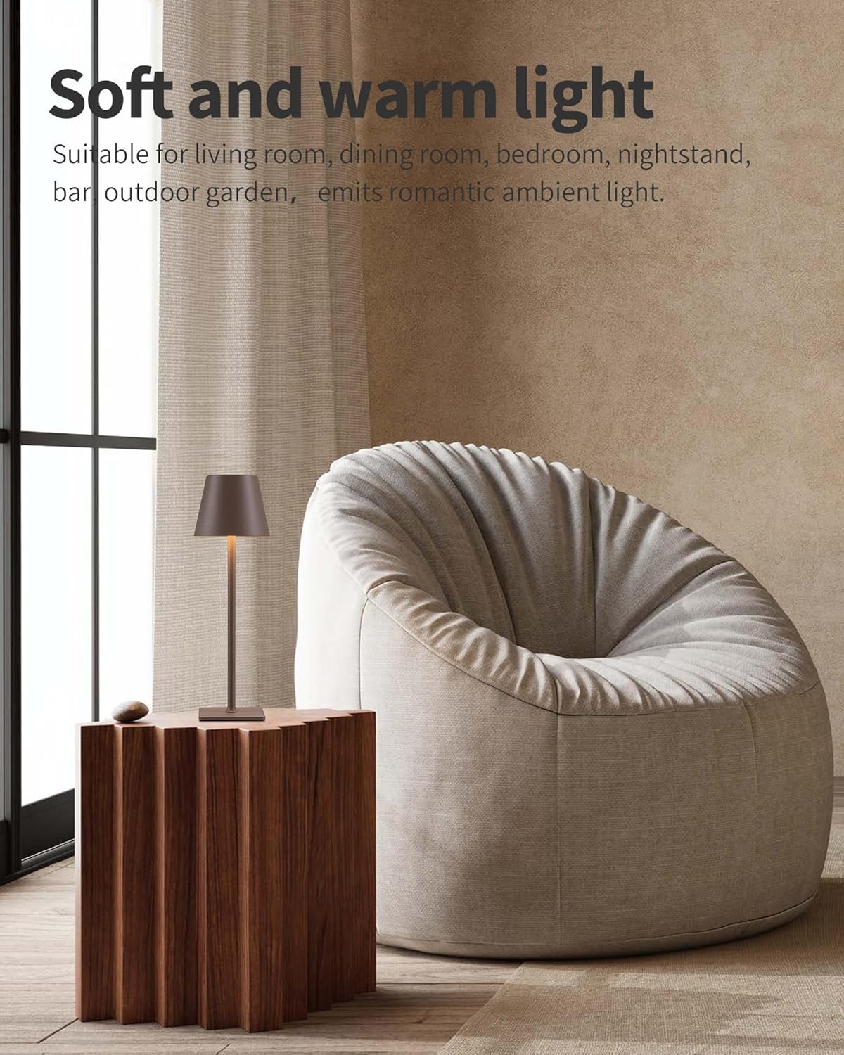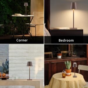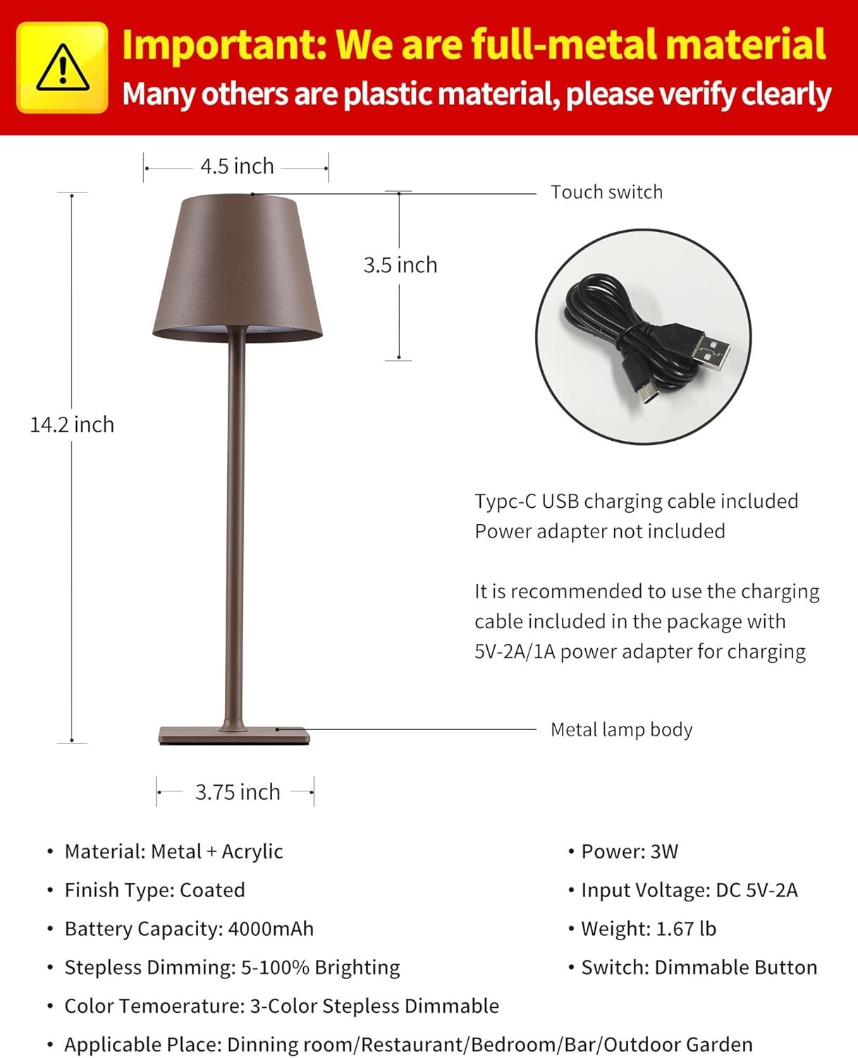 Diseño portátil inalámbrico: Batería recargable integrada de 4,000 mAh. Puedes utilizar la lámpara mientras se carga. Se puede utilizar como luz de emergencia en caso de corte de energía. Ha pasado la certificación de seguridad. Diseño inalámbrico, tamaño moderado, puedes colocar la lámpara en cualquier lugar sin ocupar espacio visual, con un diseño simple y moderno que hace que tu hogar se vea más elegante. Lámpara de escritorio alimentada por baterías: El tiempo de carga es de 4 a 5 horas utilizando USB tipo C, con un rango de uso de 8 a 40 horas dependiendo del brillo seleccionado. Cuando no esté en uso durante mucho tiempo, la batería entrará en un estado inactivo y requiere varios ciclos de carga para estimular la actividad de la batería. Debe usarse a temperatura ambiente, la baja temperatura afectará el rendimiento de la batería y reducirá su capacidad y la vida útil. Atenuación continua de 3 colores. Temperatura de color: 2,700 K-6,000 K, luz blanca, luz blanca cálida y luz cálida. Atenuación continua (5%-100%); interruptor de control táctil, da un toque ligero para cambiar el modo de luz, pulsa durante mucho tiempo para controlar el brillo de la luz. Ligera y portátil, adecuado para acampar al aire libre, reuniones familiares, cenas y otros lugares para crear un ambiente romántico para ti. Lámpara de metal para mesa: Lámpara hecha con un cuerpo de metal, con tratamiento de revestimiento mate, antiarañazos y anticorrosión; al que se le aplica un tratamiento de galvanizado de color dorado, suave y con textura. Pantalla acrílica, con buena transmisión de luz sin ser cegadora. Lámpara para decoración del hogar. La base contiene almohadillas antideslizantes para evitar que se vuelque accidentalmente. – –