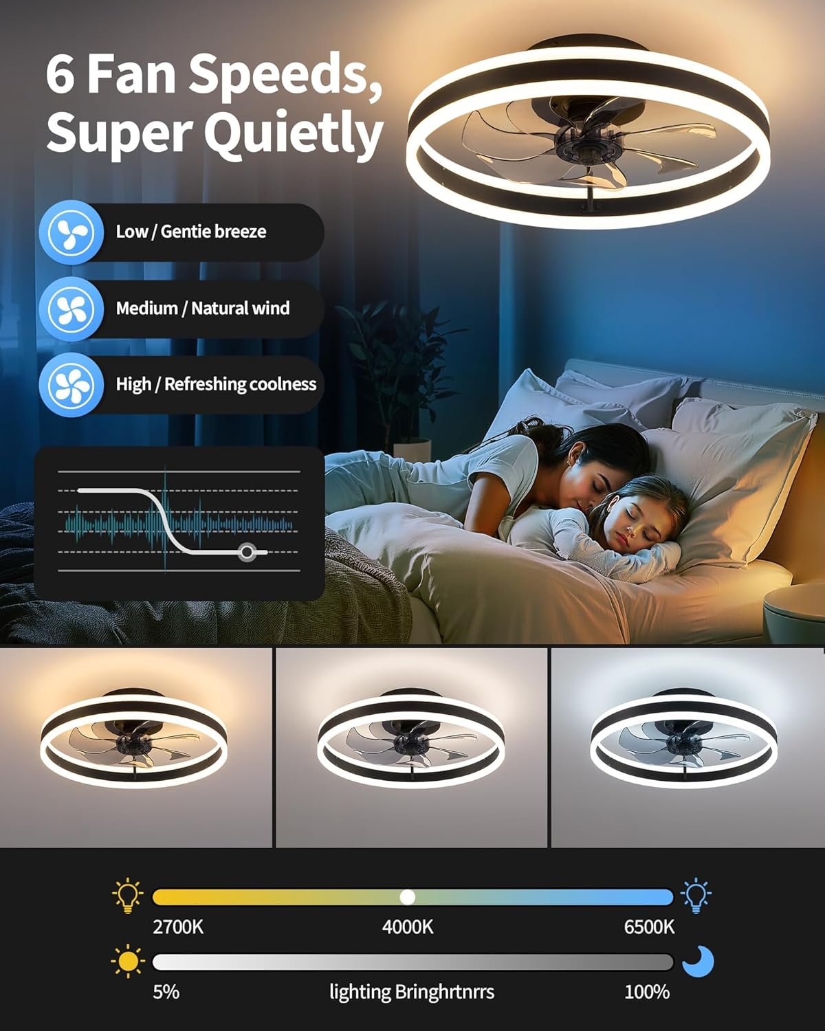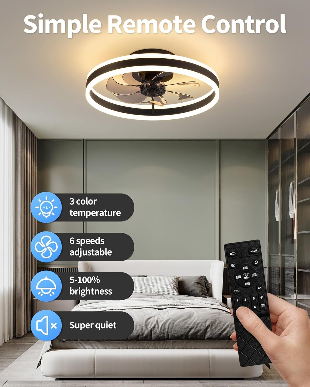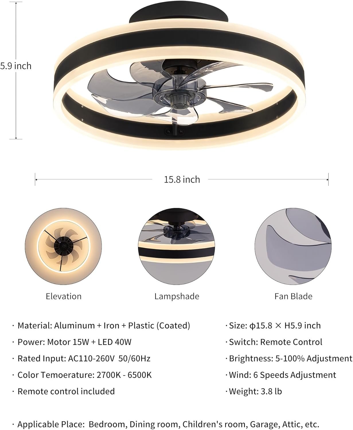 Control remoto/Control por interruptor El control remoto incluido te permite operar fácilmente la luz del ventilador desde cualquier lugar de la habitación. También se puede operar utilizando el interruptor de pared (el interruptor de pared no está incluido en el paquete) para mayor comodidad. Ya sea que necesites iluminación brillante y fresca para el trabajo o una iluminación cálida y acogedora para relajarte, este ventilador de techo LED con luz y control remoto te ofrece una variedad de opciones para crear el ambiente que deseas. Ventilador Silencioso de 6 Velocidades Este ventilador de techo de perfil bajo ofrece 6 opciones diferentes de velocidad del aire, y el diseño inversor te permite elegir la intensidad y el modo de flujo de aire adecuados según tu preferencia de comodidad. Además, este moderno ventilador de techo funciona silenciosamente para garantizar un ambiente tranquilo y pacífico. Ya sea que prefiera una brisa suave o un flujo de aire potente, este ventilador de techo empotrado ofrece múltiples ajustes de velocidad mientras mantiene al mínimo las perturbaciones de ruido. Parámetros de rendimiento: ventilador de techo de 110 V con luz; tamaño del producto: 40,1 cm x 15,0 cm, área de cobertura: 50-130 pies cuadrados; cuerpo de luz de aluminio + hierro, pantalla de lámpara acrílica, hoja de ventilador de plástico, luz uniforme y transparente; hoja de ventilador de alta calidad, giro más suave. Haz que tu hogar (dormitorio/habitación de los niños/comedor/cocina) esté lleno de iluminación creativa, un ventilador con luz para el hogar indispensable para todas las estaciones. Atenuación continua La luz del ventilador de techo tiene una atenuación continua de 3 temperaturas de color de 2700 K-6500 K, ajuste de brillo del 5 al 100 % para satisfacer diferentes preferencias de iluminación. Seleccionando componentes emisores de luz LED de alta calidad y pantalla de plástico, la luz es brillante y suave sin deslumbramiento, que se puede aplicar a una variedad de escenas. Todas las operaciones se pueden controlar por control remoto, que puede ajustar la velocidad del ventilador, elegir la temperatura de color de la luz y así sucesivamente. Servicio postventa Lámpara de ventilador elegante y ligera, adecuada para uso personal o como regalo para amigos y familiares. Si tienes alguna pregunta después de recibir el paquete, ponte en contacto con nosotros, estamos encantados de ayudarte y darte una solución satisfactoria.